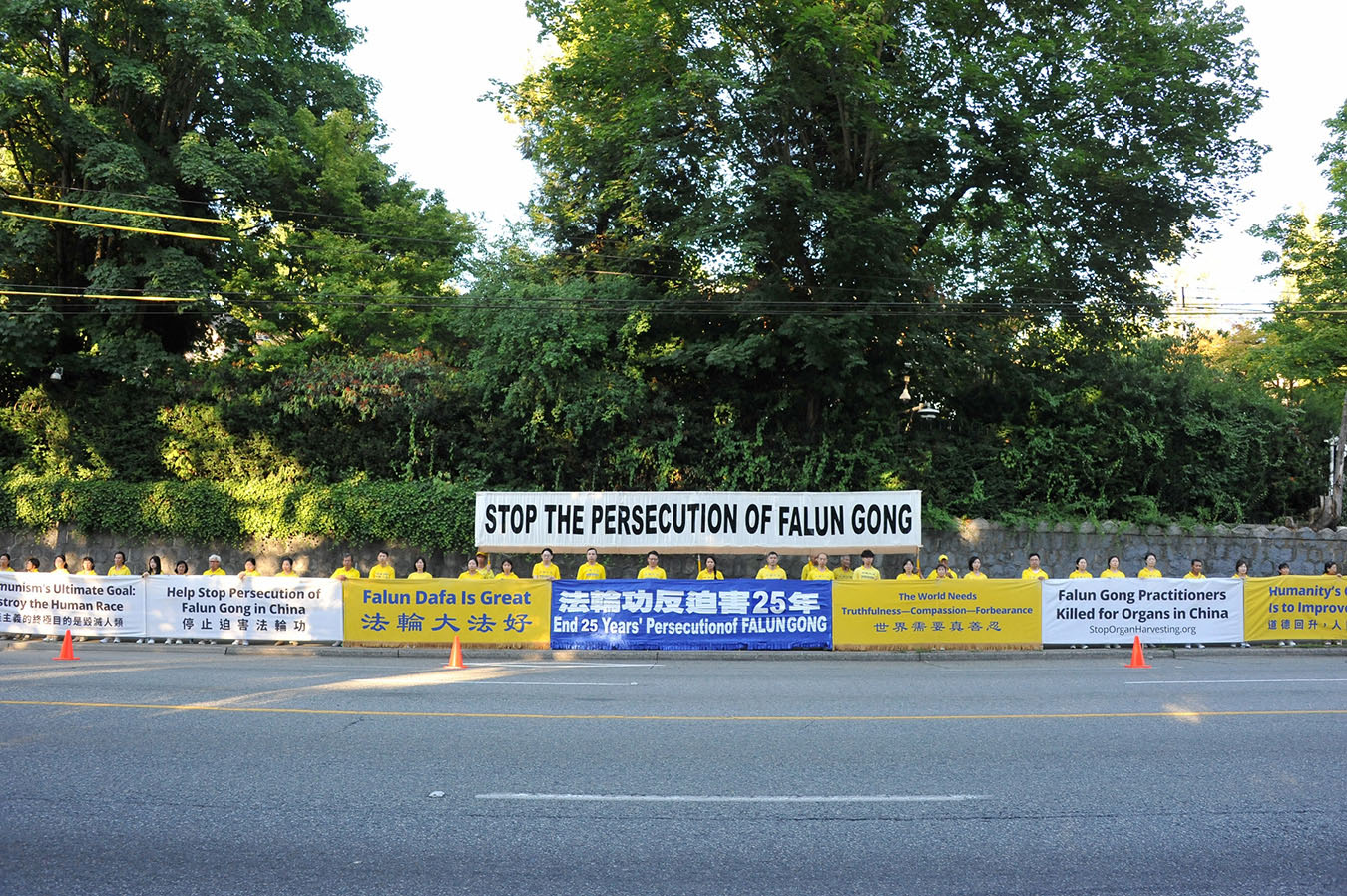 ![]() 图7~9:七月十四日,部分法轮功学员聚集在温哥华中领馆前举行“7.20”和平反迫害二十五周年活动。 |