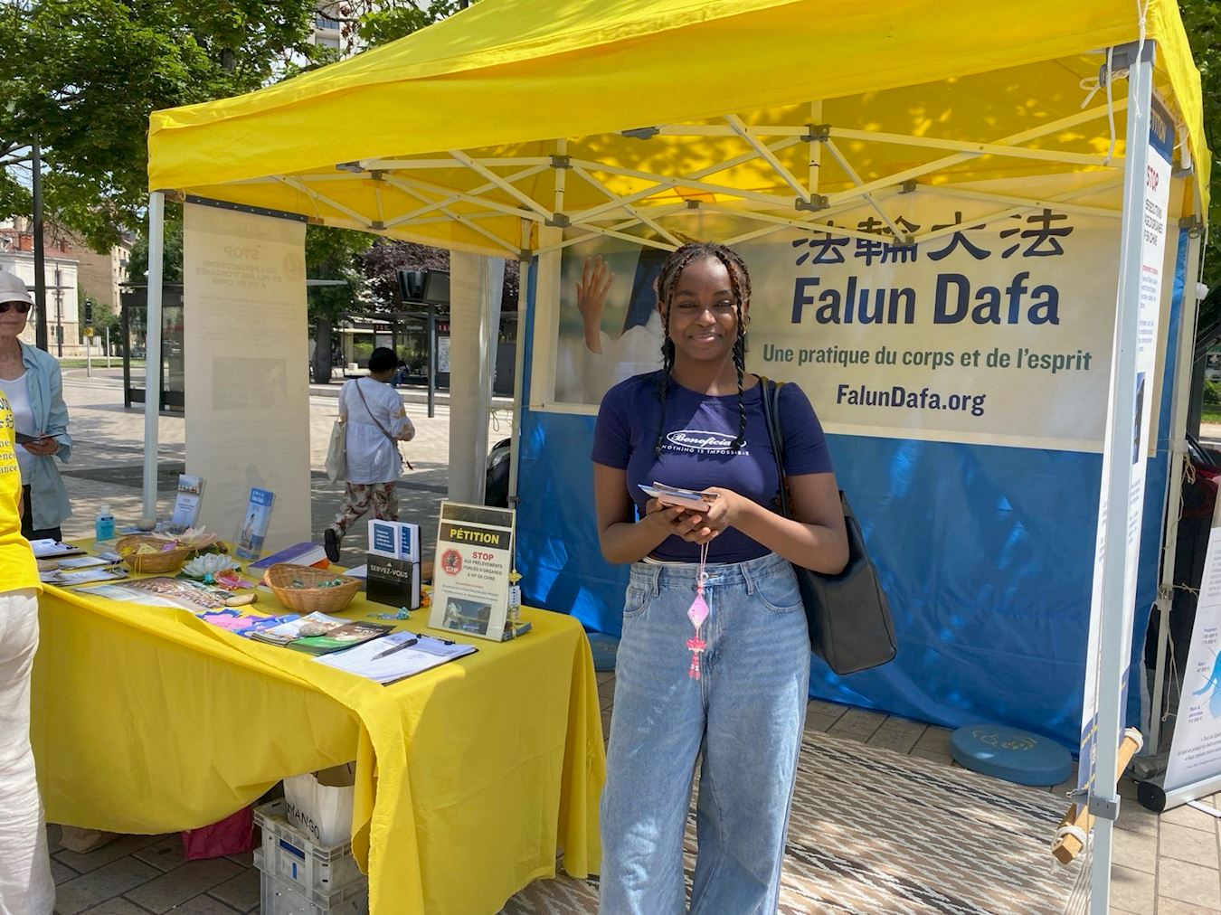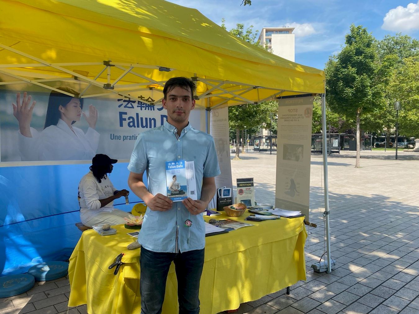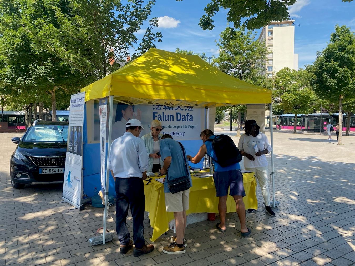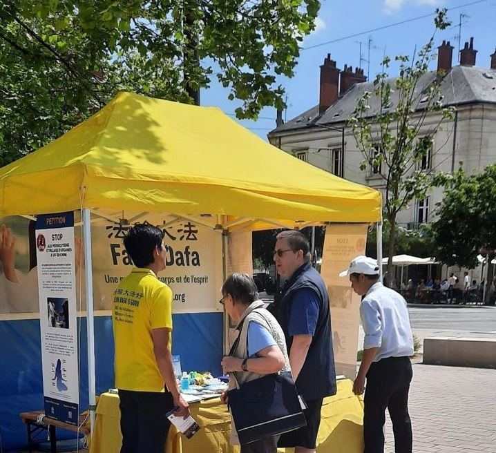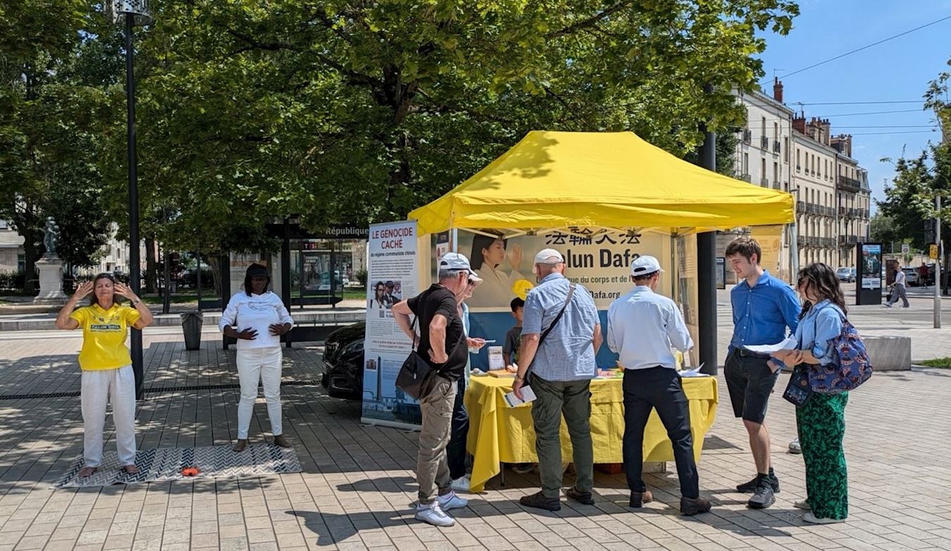 为了揭露中共这场持续二十五年的打压,二零二四年七月二十日星期六,来自汝拉(Jura)、上莱茵地区(Haut-Rhin)、巴黎乃至瑞士的法轮大法学员在第戎的共和广场(Place de la République)集会。他们设立了宣传摊位,向当地居民揭露这场打压的严重性和广泛性。学员们还展示了法轮功的五套功法,并发起签名活动,呼吁结束对中国法轮功学员的迫害。