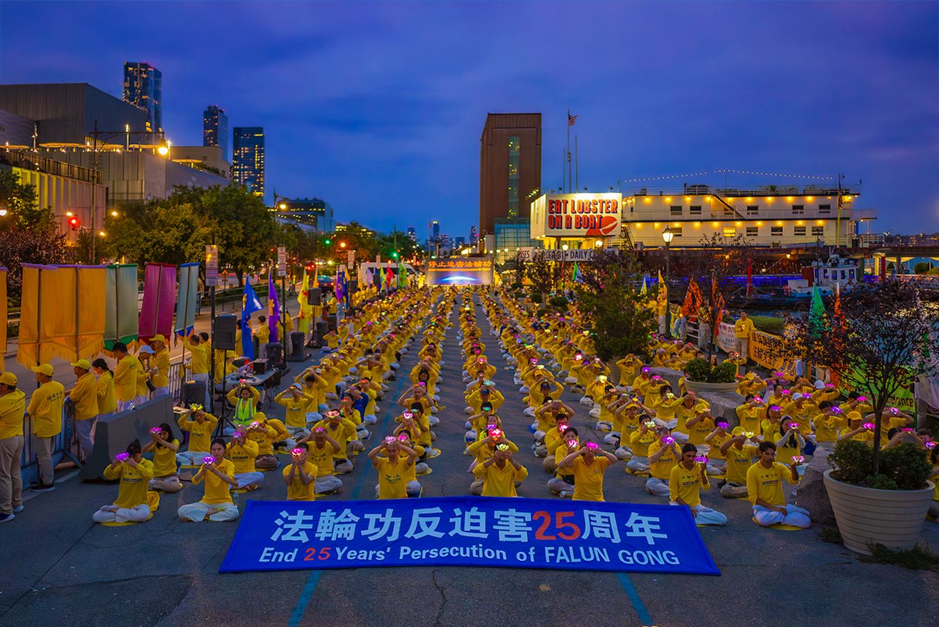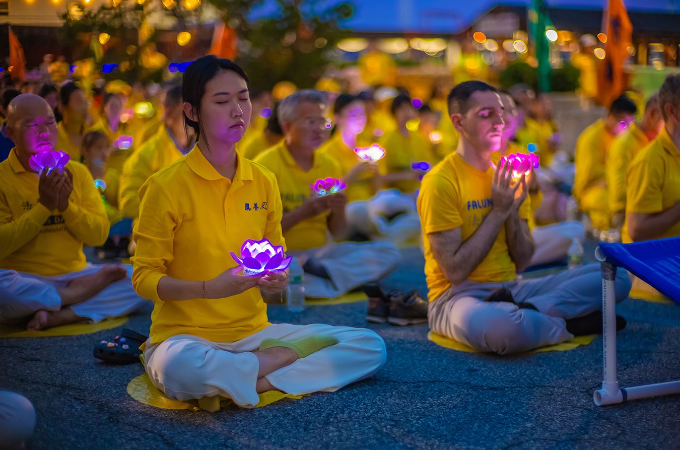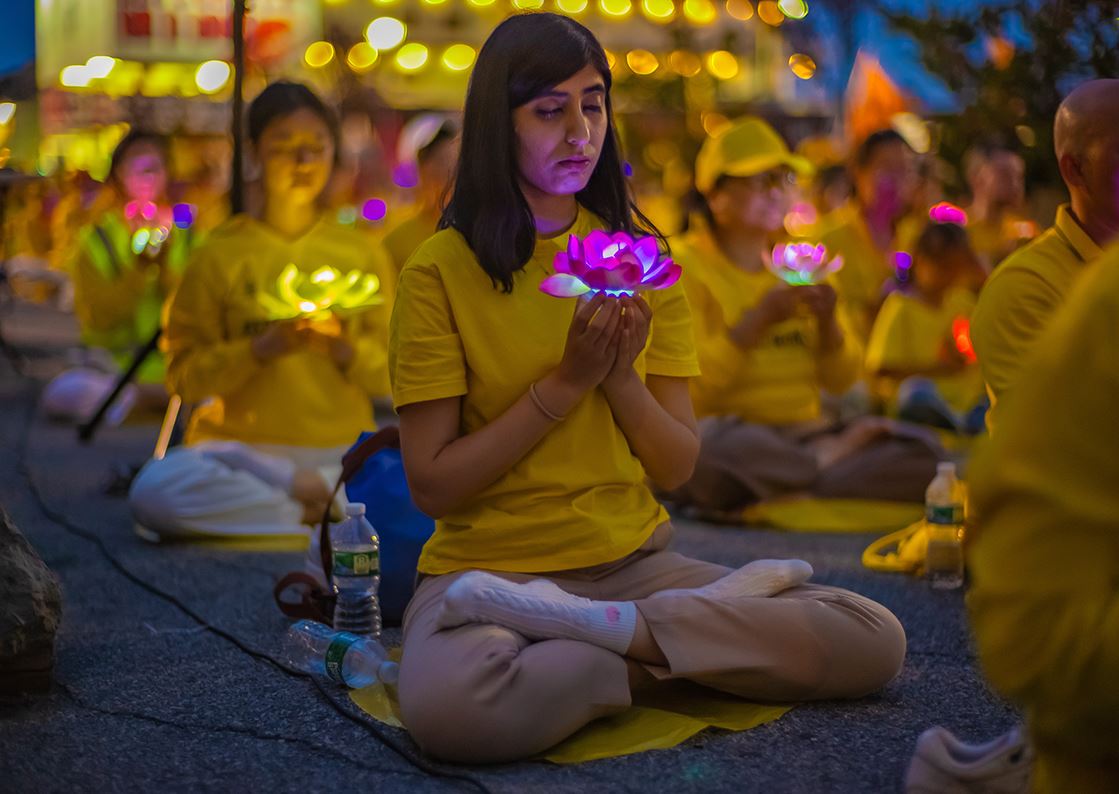 当夜幕降临,学员们点起蜡烛,点亮莲花灯,悼念二十五年来,因坚守信仰被中共迫害致死的法轮功学员。