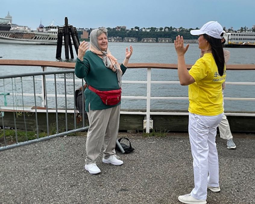 当米娜了解到法轮功学员二十五年来坚持不懈反迫害的故事时,她说,法轮功学员是一群非常好的人,并当即在现场学习动功。当学炼了第一、第二套动功动作之后,她说:“(动作)非常平和、充满了能量。”并继续学了第三和第四套功法动作。