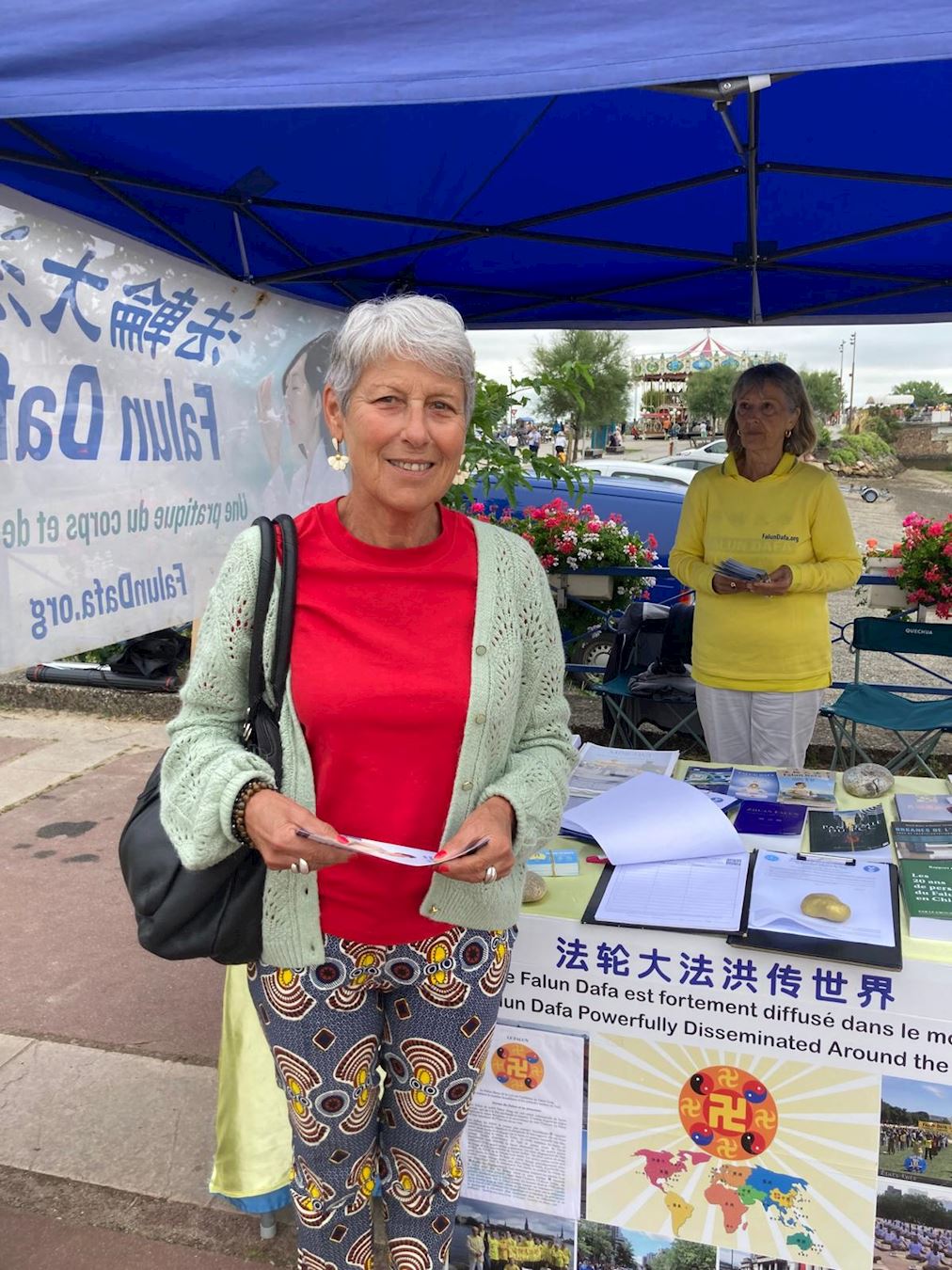 玛丽冯娜(Maryvonne)与女儿马伊丽斯(Maïlys)一起路经信息台。玛丽冯娜说,通过一位修炼法轮功的朋友得知法轮大法,她一直好奇法轮功究竟是什么,但从未认真去探究。现在这个机会让她了解了一些,这激起了她学功的想法。她表示,之前也不知道有这种种族灭绝的事情,真是太可怕了。