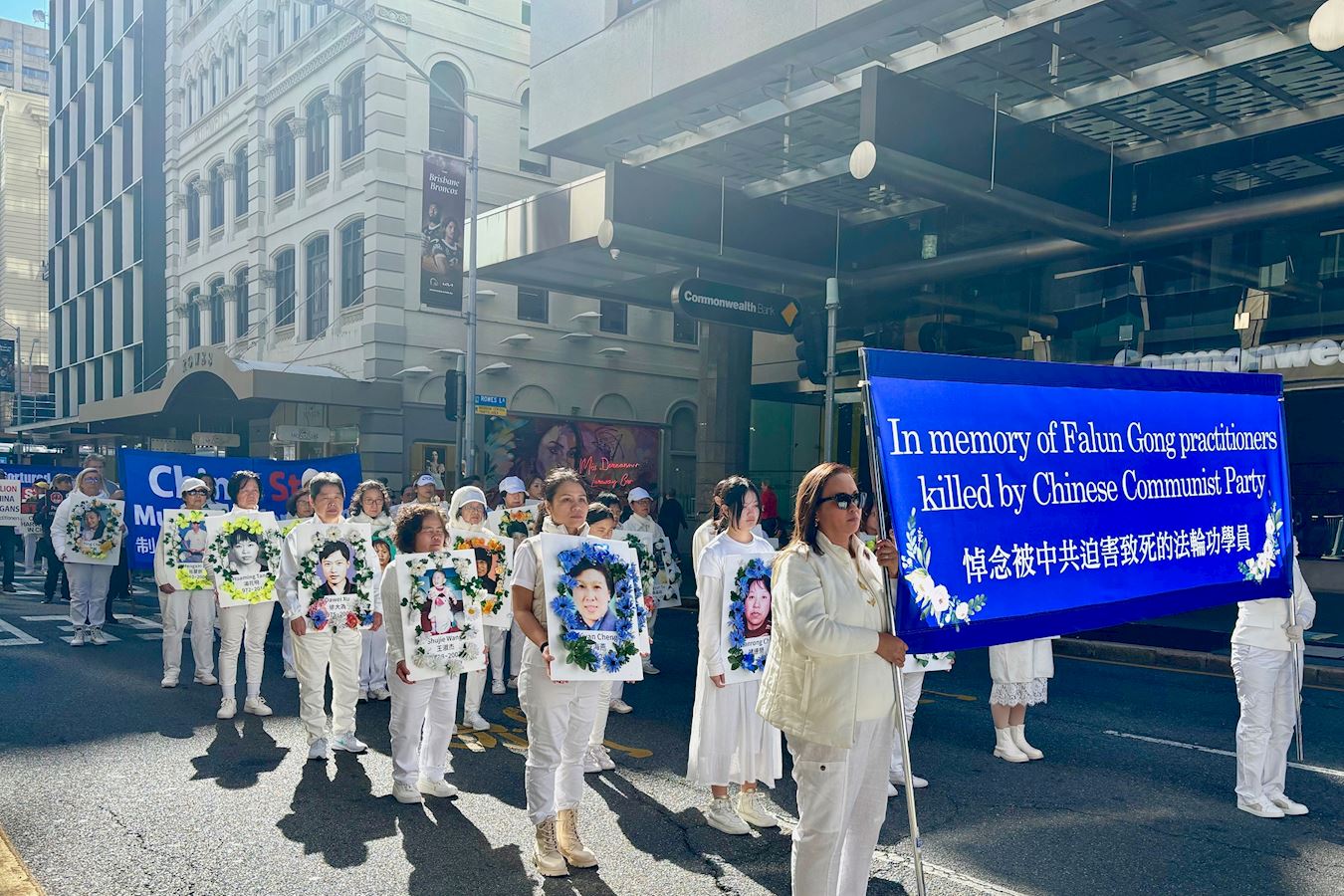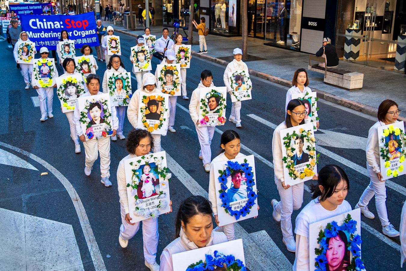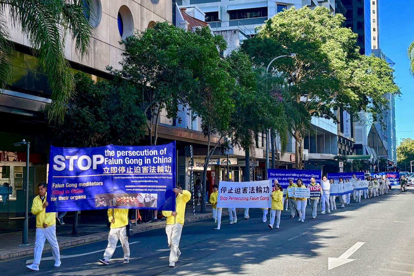 游行队伍是由“法轮大法”横幅引领着,紧随其后是呼吁“停止迫害法轮功”及“悼念被中共迫害致死的法轮功学员”的横幅,其中引人注目的是法轮功学员身穿白衣白裤,手捧被中共迫害致死的中国大陆法轮功学员的照片。还有“制止中共活摘法轮功学员器官”的横幅。