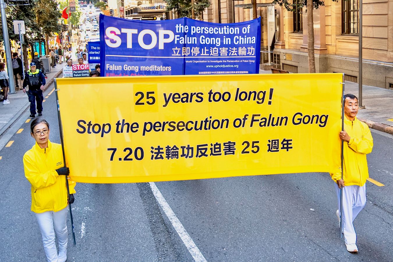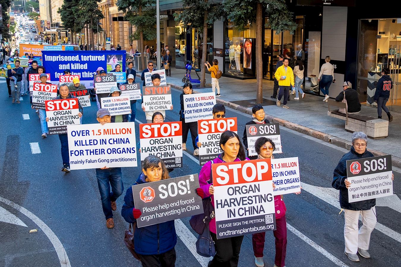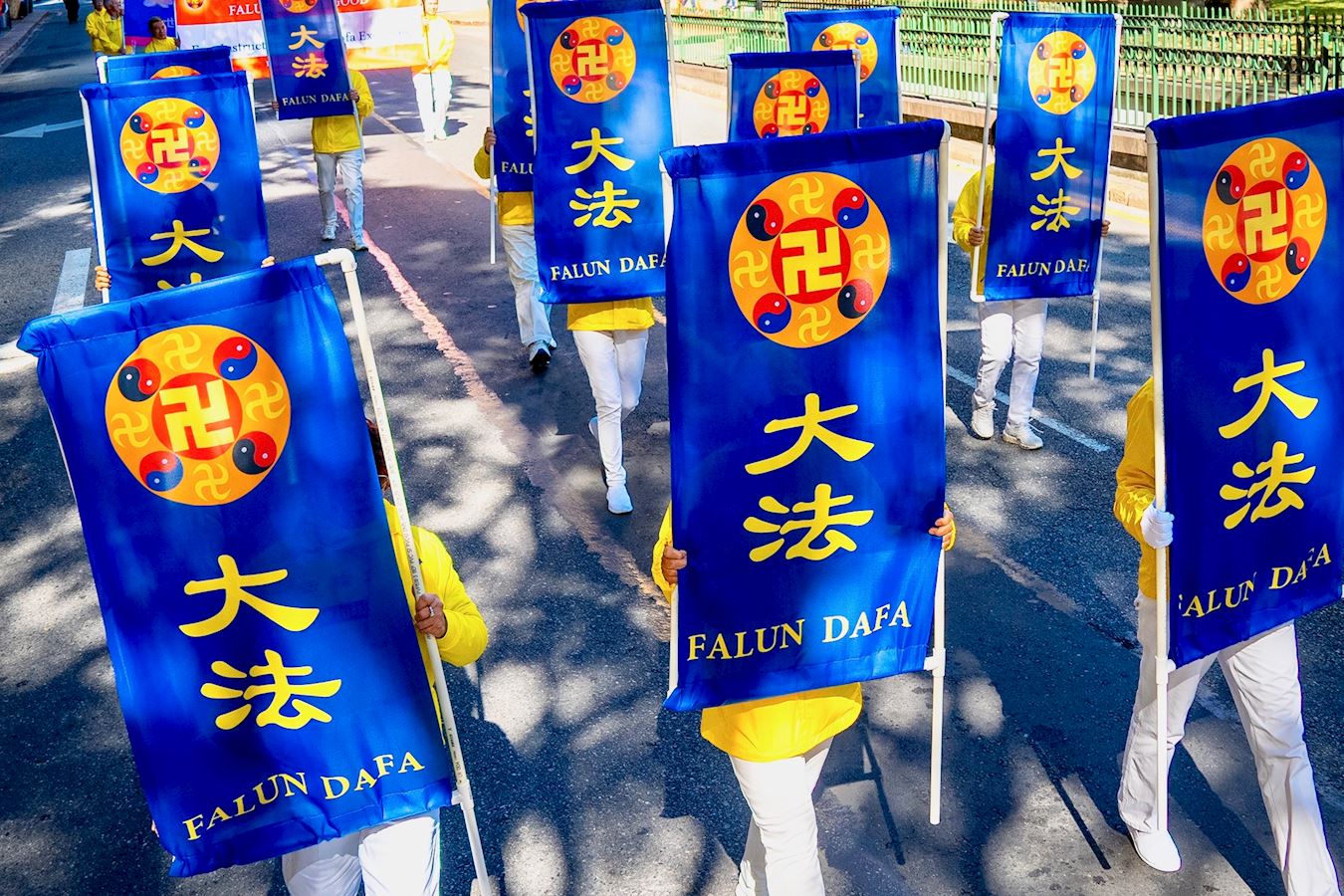 游行队伍是由“法轮大法”横幅引领着,紧随其后是呼吁“停止迫害法轮功”及“悼念被中共迫害致死的法轮功学员”的横幅,其中引人注目的是法轮功学员身穿白衣白裤,手捧被中共迫害致死的中国大陆法轮功学员的照片。还有“制止中共活摘法轮功学员器官”的横幅。