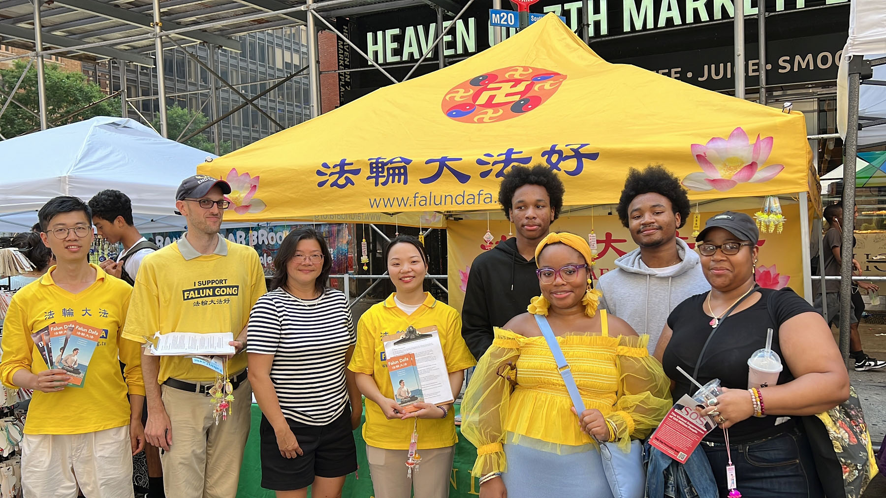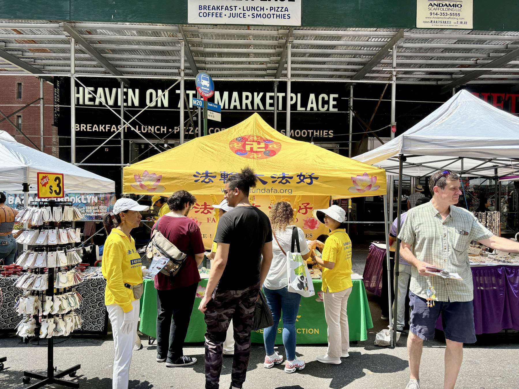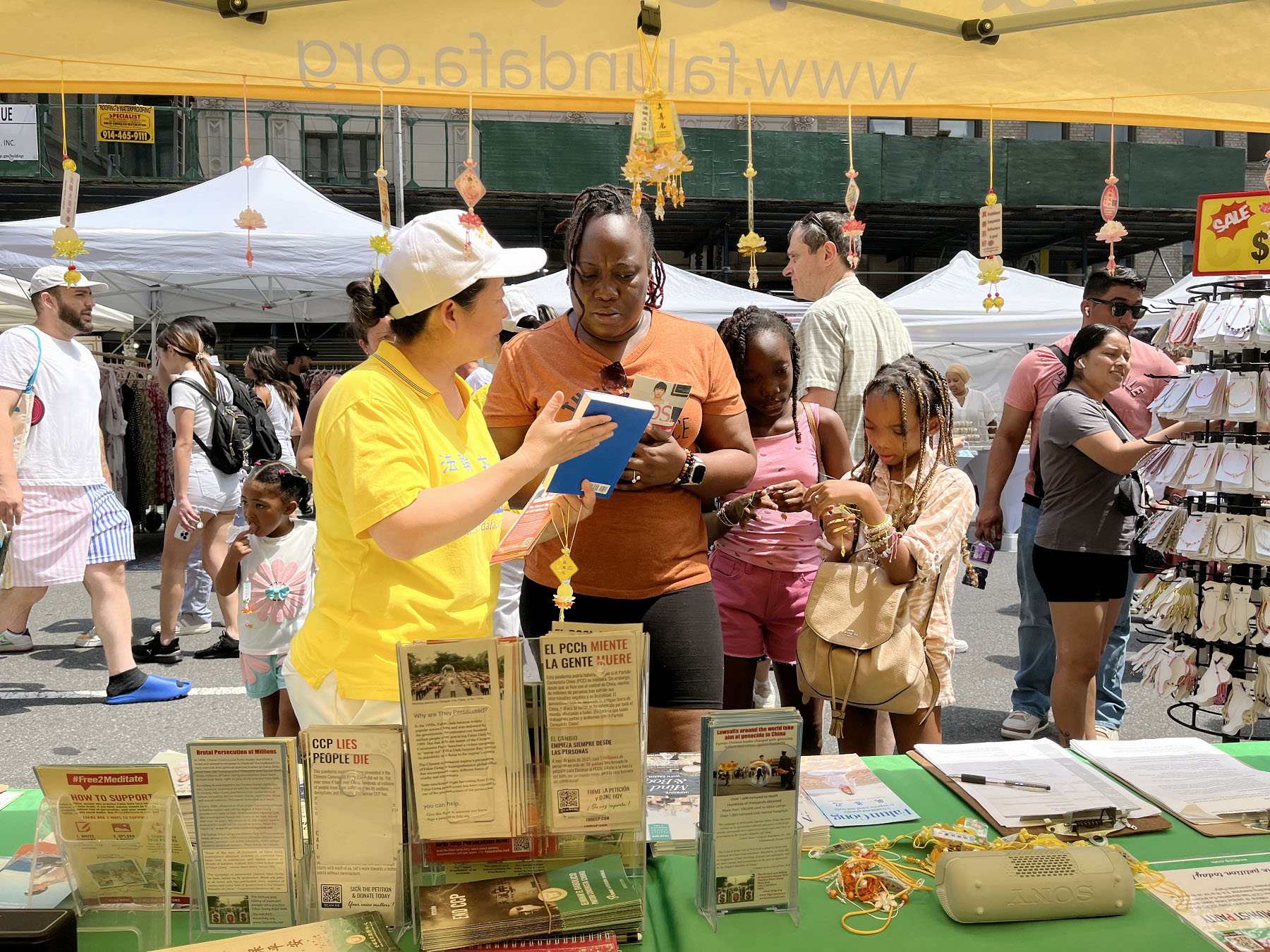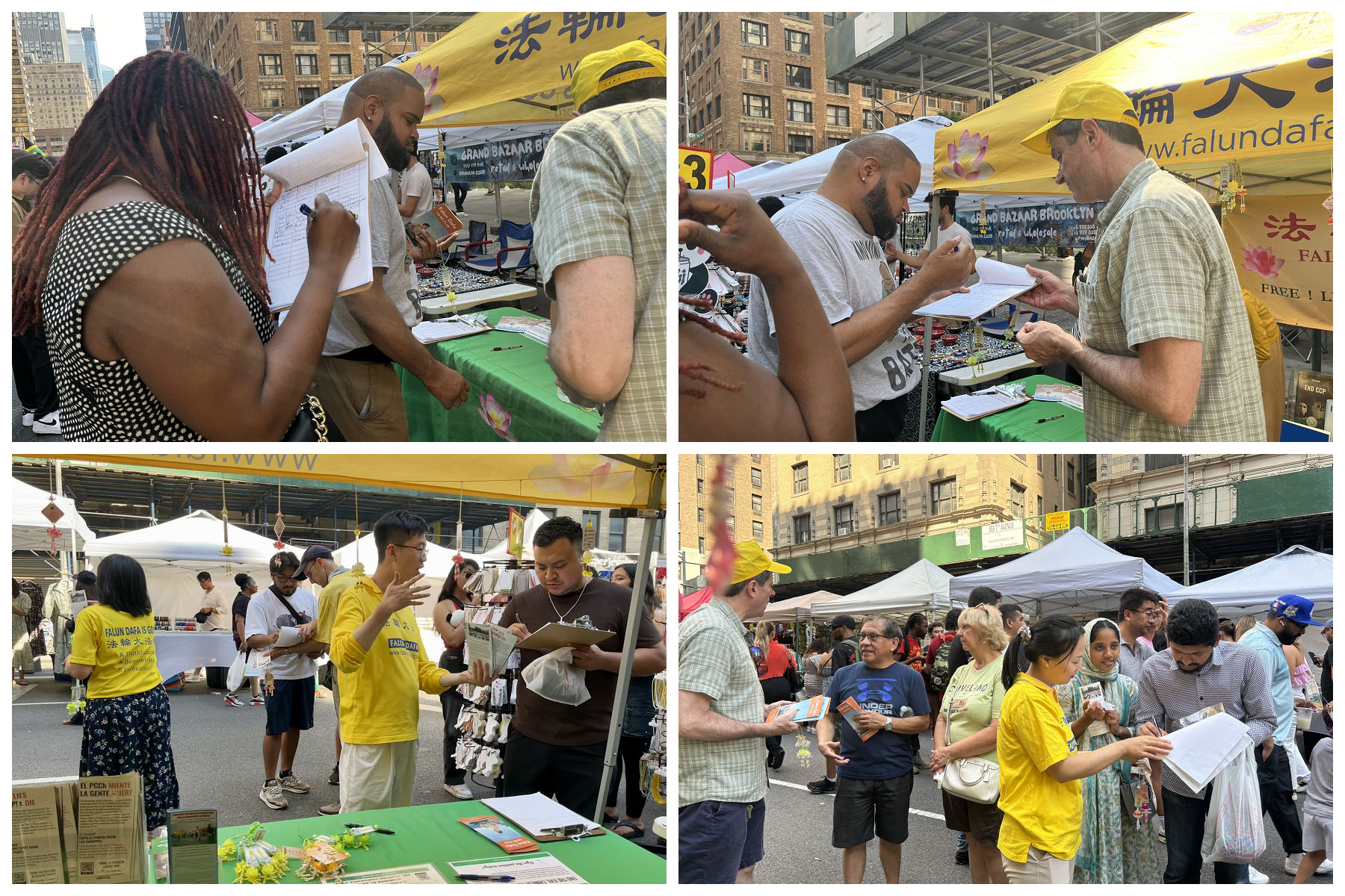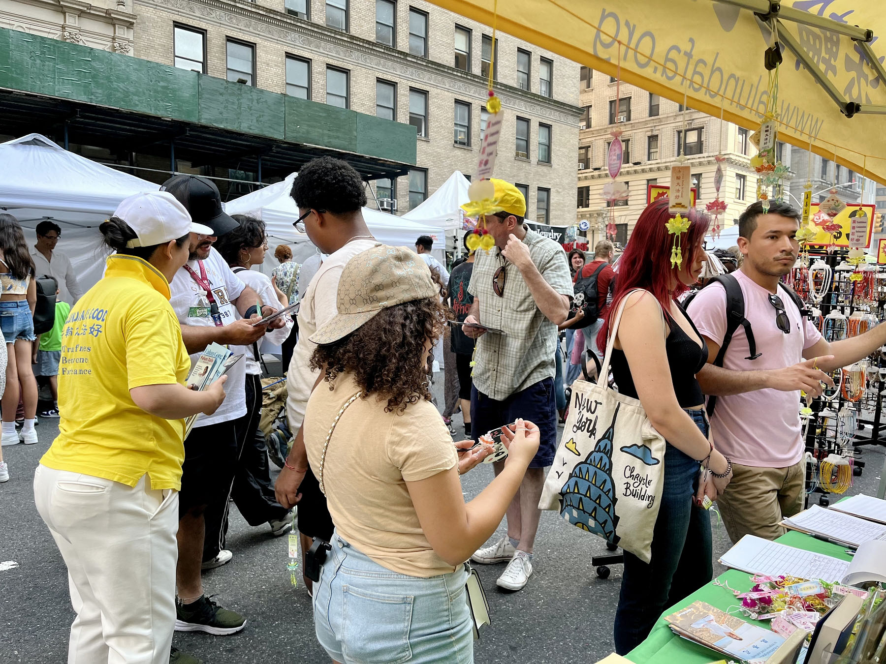 热闹的街市,酷暑的高温,纽约法轮功学员传递真相的心很温暖,许多人明白真相后签名支持《法轮功保护法案》和END CCP。希望结束中共的暴政和支持人权捍卫,信仰自由!许多人报名参加九天班,希望自己能按照真、善、忍做一个好人!