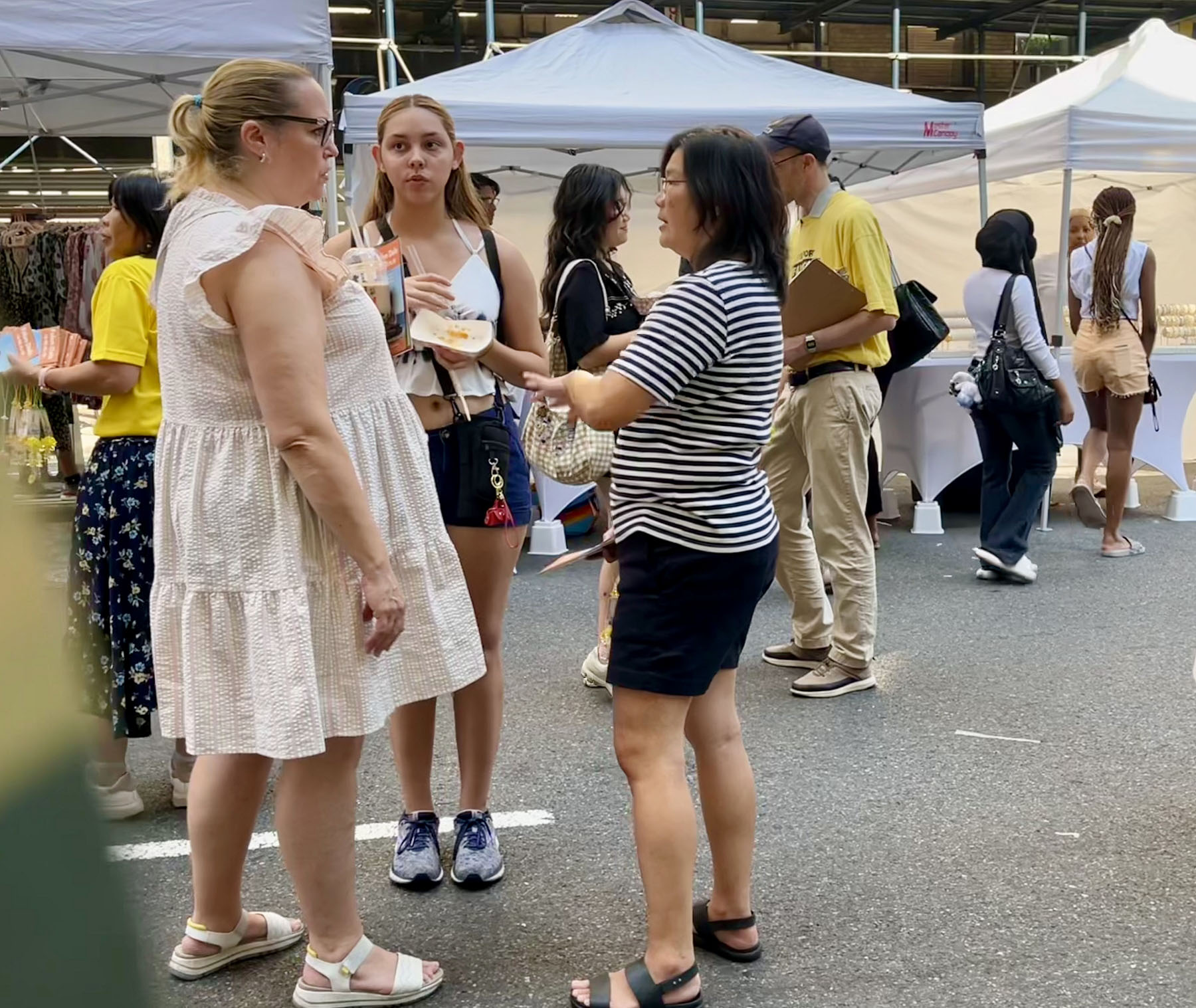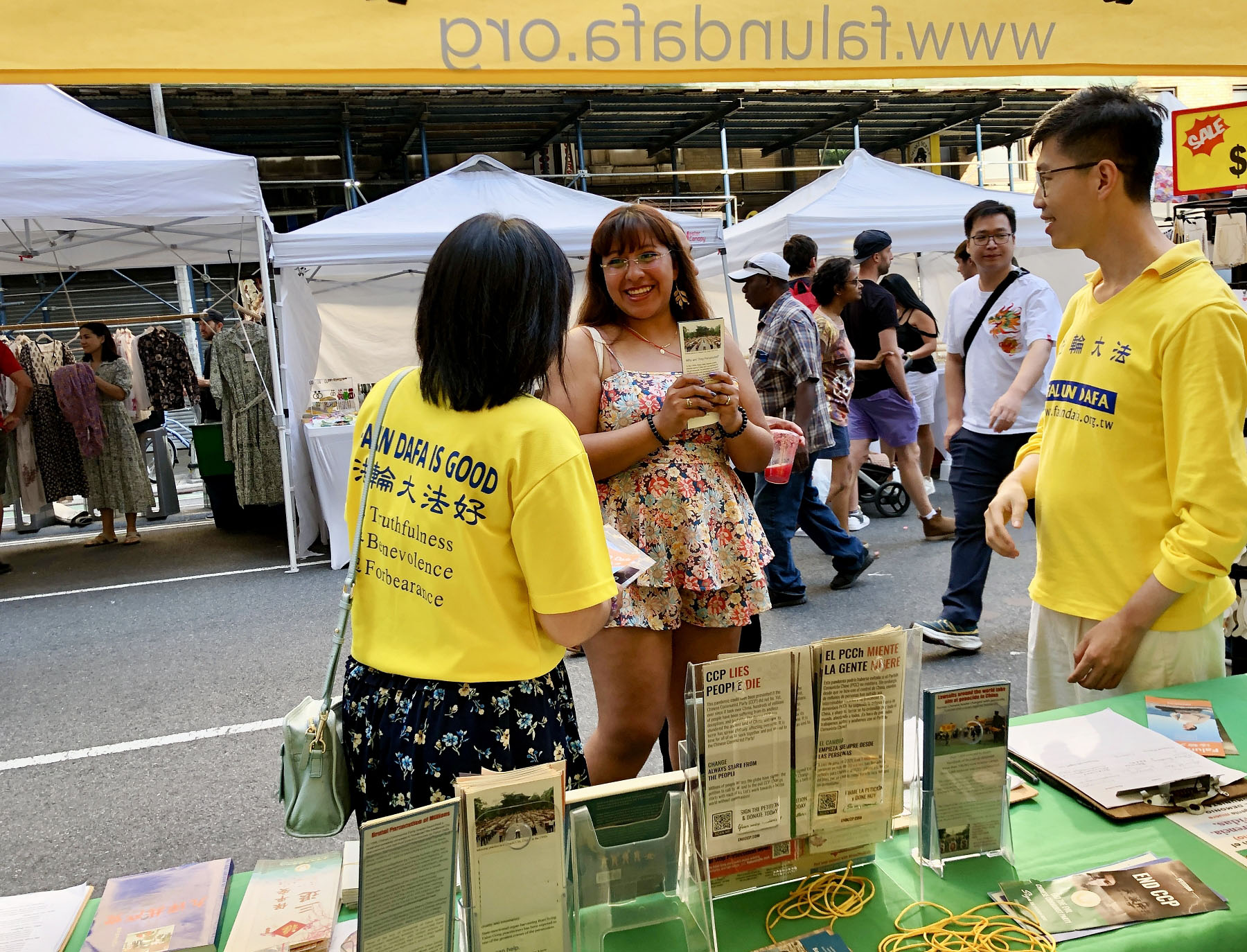 一位住在法拉盛的西人年轻女孩蒙塞拉特·马丁内斯(Monserrat Martinez)非常开心地双手接过义工给她的大法资料,她停留在摊位,告诉学员:她和妈妈都想学炼法轮功。学员告诉她,法轮大法有九天班,于是她们在报名表上填下联络资料,马丁内斯表示很期待参加九天班。