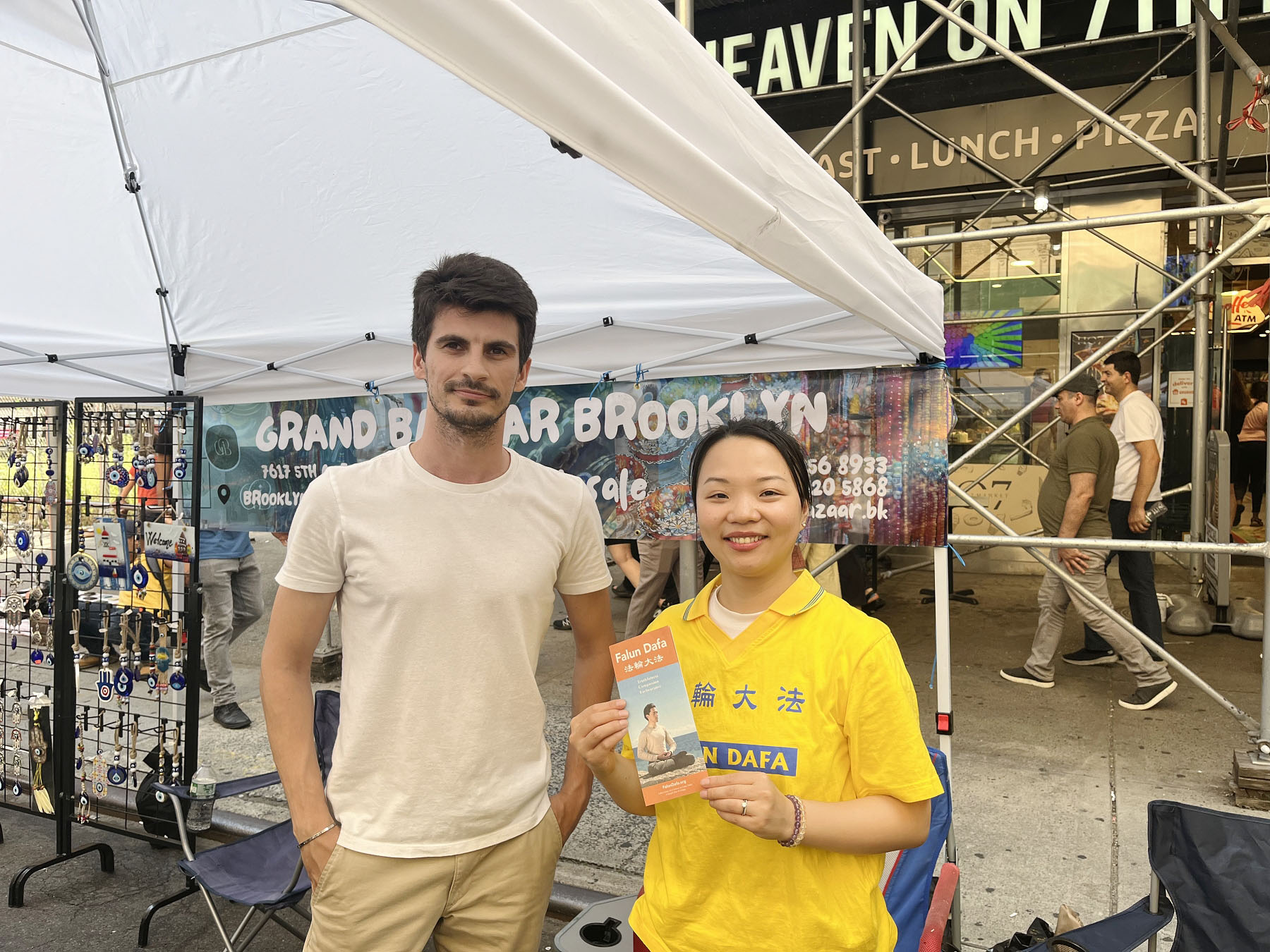 一位来自土耳其的摊主老板伊萨(Isa)今年三十岁,他相信有比人更高级的生命存在,一切都是神传递的信息,他感受到法轮功学员炼功时很强的能量场,使他感觉很舒服。