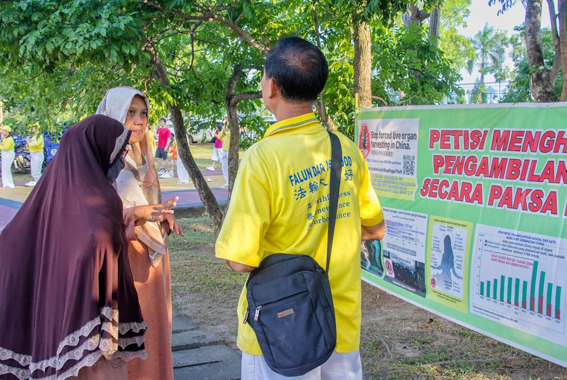 两位女士看到曝光中共活摘器官罪行的横幅后,来到学员面前询问:“这里发生了什么事?”当学员向她们讲述了中共在中国迫害法轮大法的真相后,其中一位女士惊叹道:“天哪,共产党太残忍了,太可怕了。”