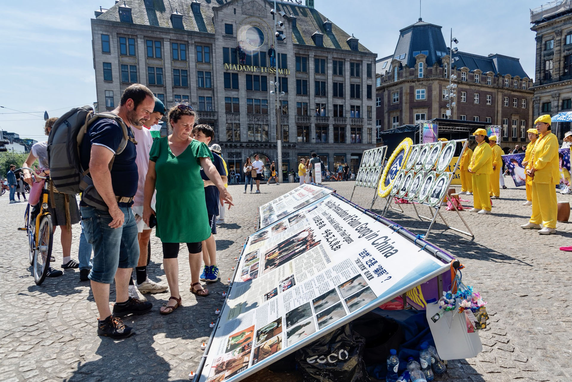 二十日中午,法轮功学员来到达姆(Dam)广场布置好真相展板和大型横幅,开始了当日的活动。