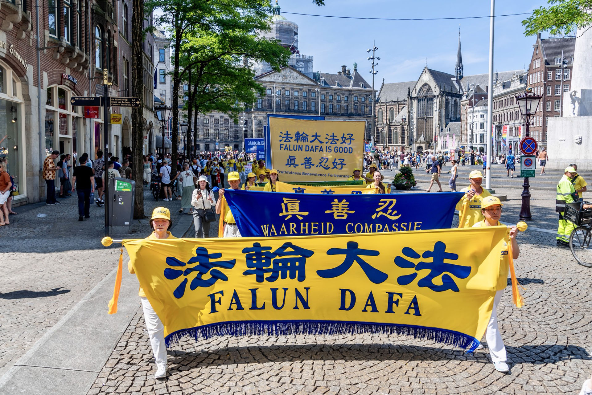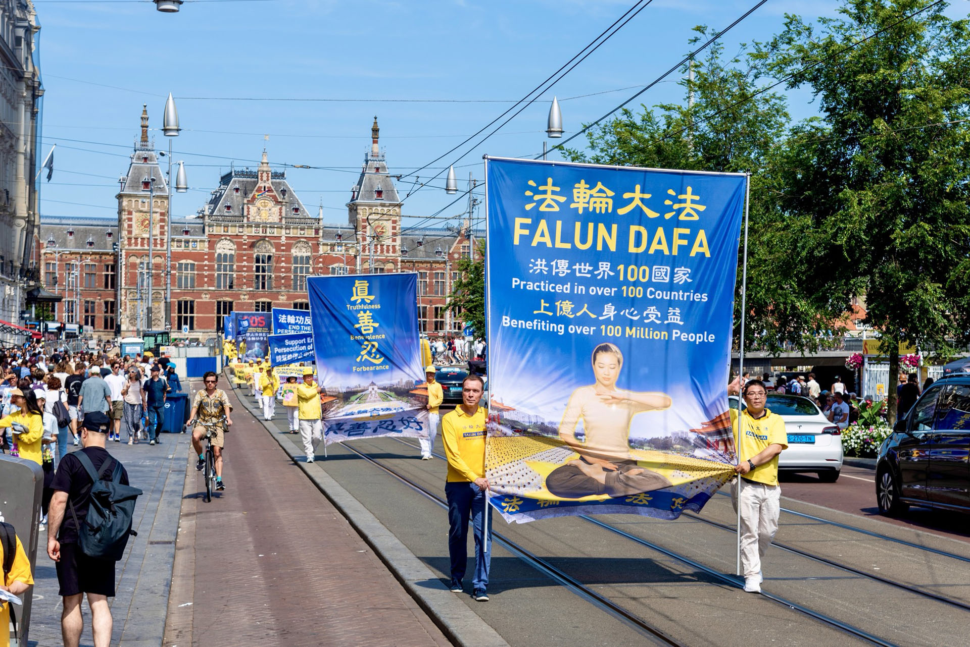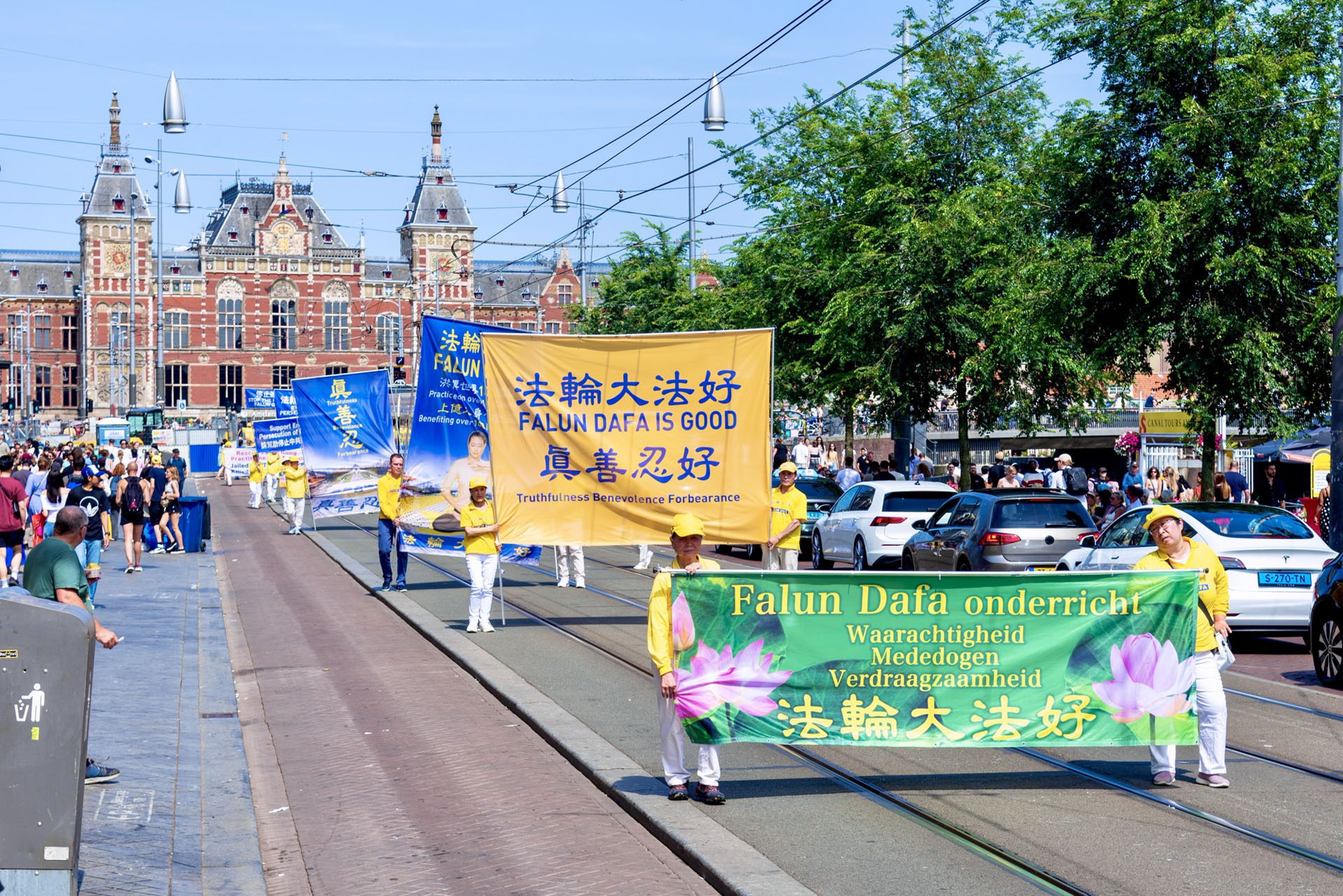 下午两点,法轮功学员手持“法轮大法”、“真善忍”、“请帮助停止中共对法轮功25年的迫害”等横幅,从达姆广场出发开始游行。队伍行经阿姆斯特丹市中心著名的街道-旧多伦街(Oude Doelenstraat),阿姆斯特丹市中心东侧的克洛文尼亚堡运河(Kloveniersburgwal),然后沿着新市场路(Nieuwmarkt)进入唐人街。沿途很多民众被游行队伍所吸引,收到了法轮功学员分发的真相传单。