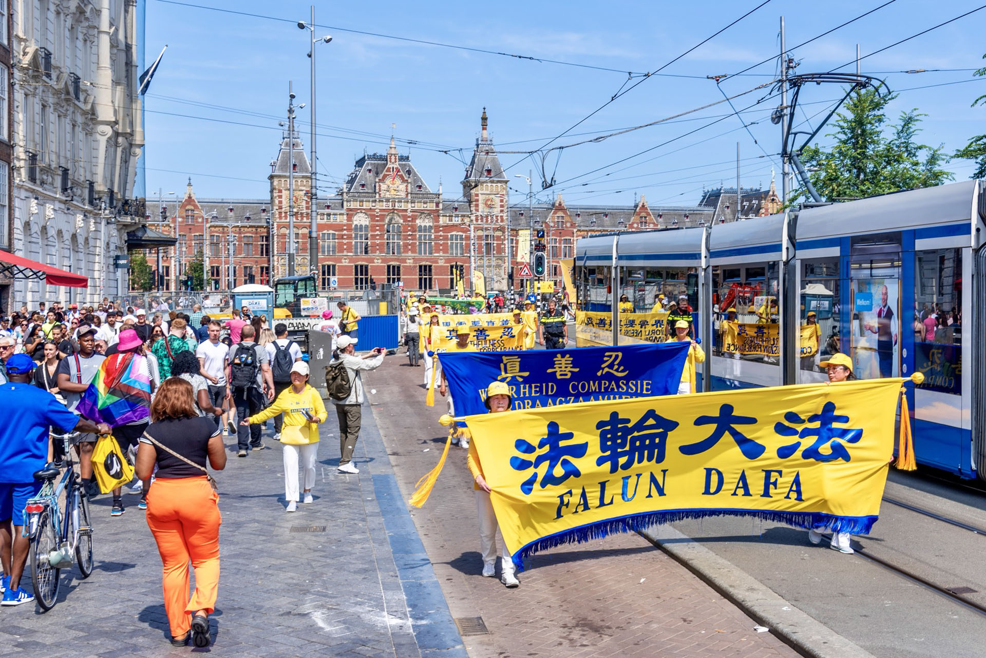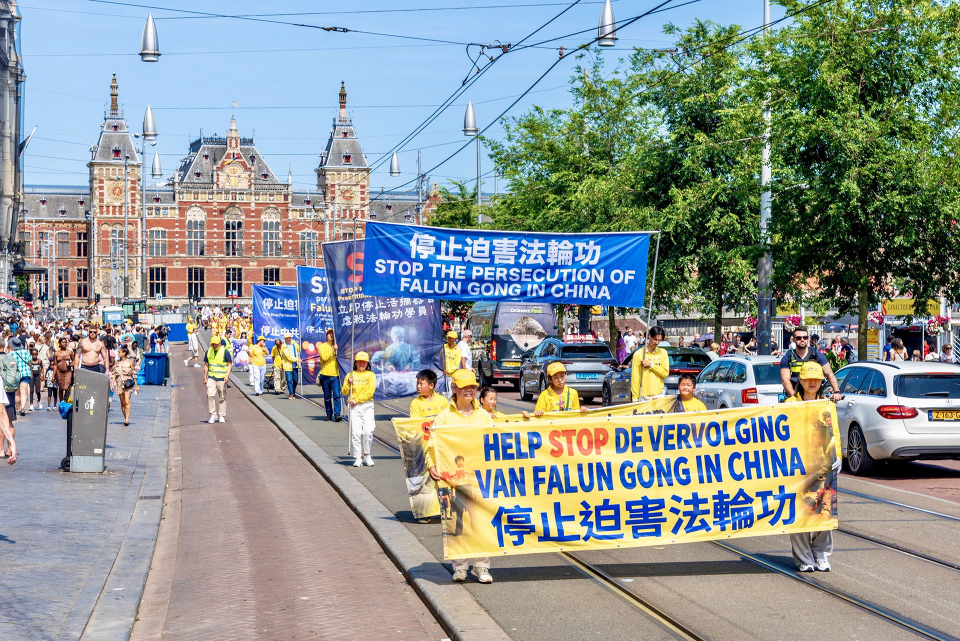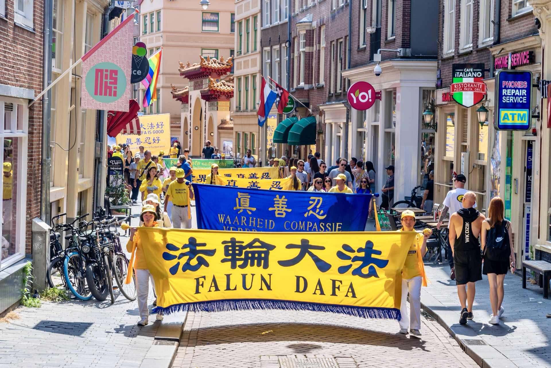 下午两点,法轮功学员手持“法轮大法”、“真善忍”、“请帮助停止中共对法轮功25年的迫害”等横幅,从达姆广场出发开始游行。队伍行经阿姆斯特丹市中心著名的街道-旧多伦街(Oude Doelenstraat),阿姆斯特丹市中心东侧的克洛文尼亚堡运河(Kloveniersburgwal),然后沿着新市场路(Nieuwmarkt)进入唐人街。沿途很多民众被游行队伍所吸引,收到了法轮功学员分发的真相传单。