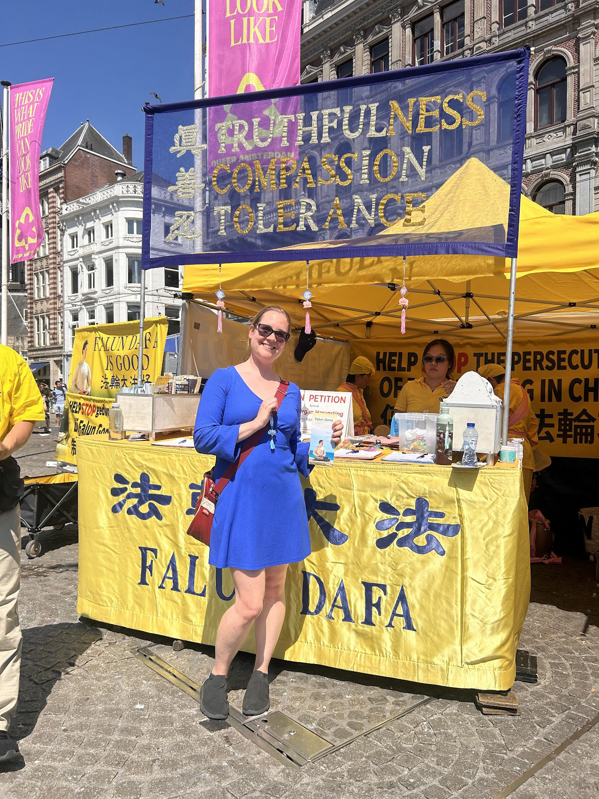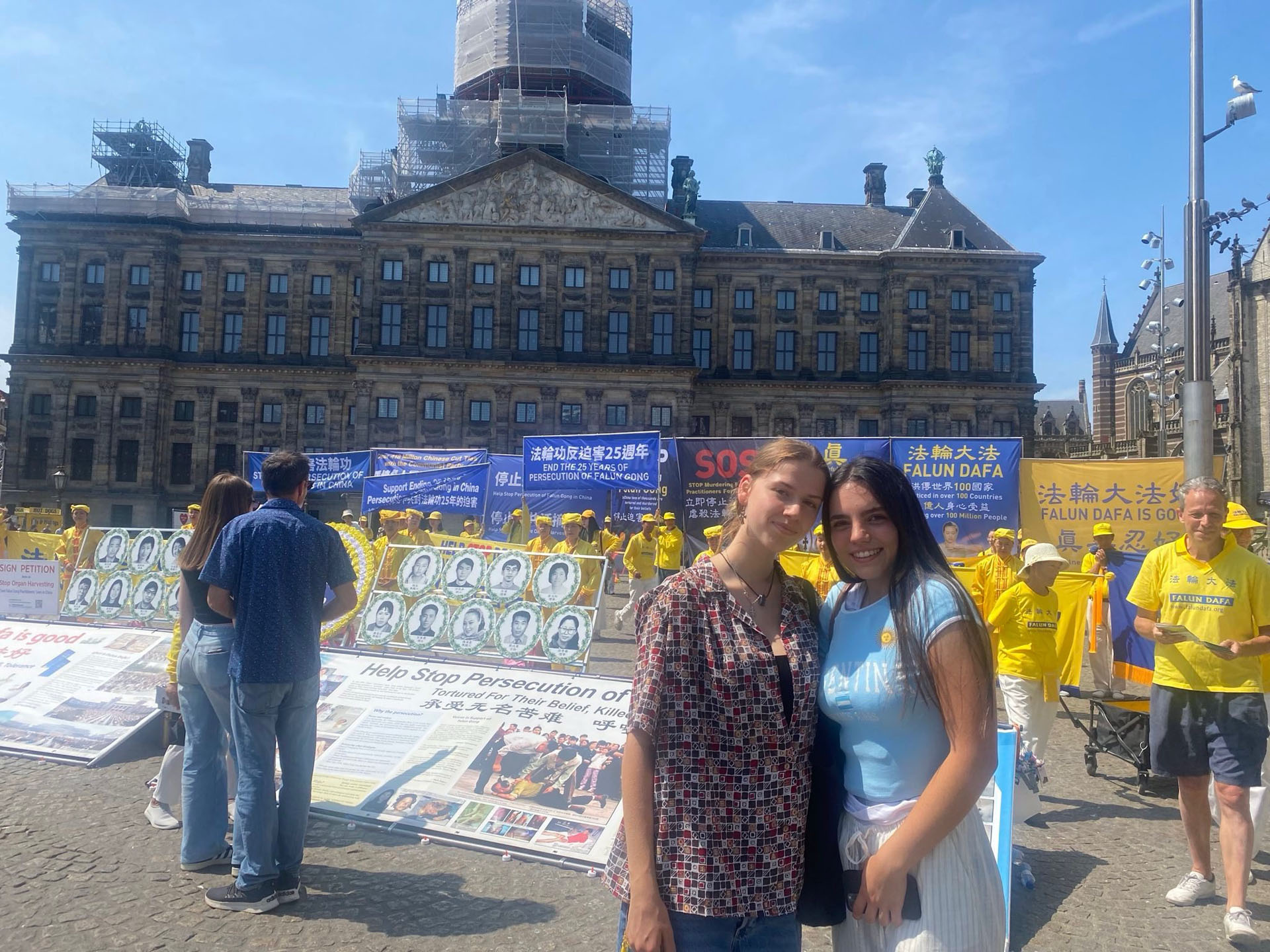 罗宾(Robin)女士和她的好朋友阿拉娜(Alana)女士在达姆广场遇到法轮功集会现场。