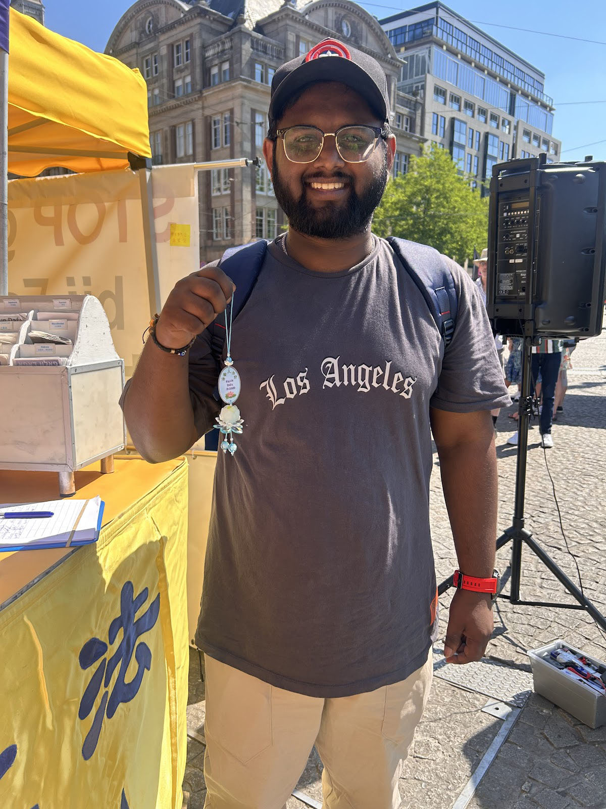 一位年轻人文卡塔·希瓦(VENKATA SHIVA)刚刚大学毕业,暑假来欧洲旅行,经过达姆广场时刚好看到荷兰法轮功学员正在举行反对中共迫害法轮功二十五年集会,他听到中共活摘法轮功学员器官的罪行时表示愤慨和震惊,认为这是人类不能容忍的罪恶。他支持法轮功学员反迫害、揭露中共的暴行。