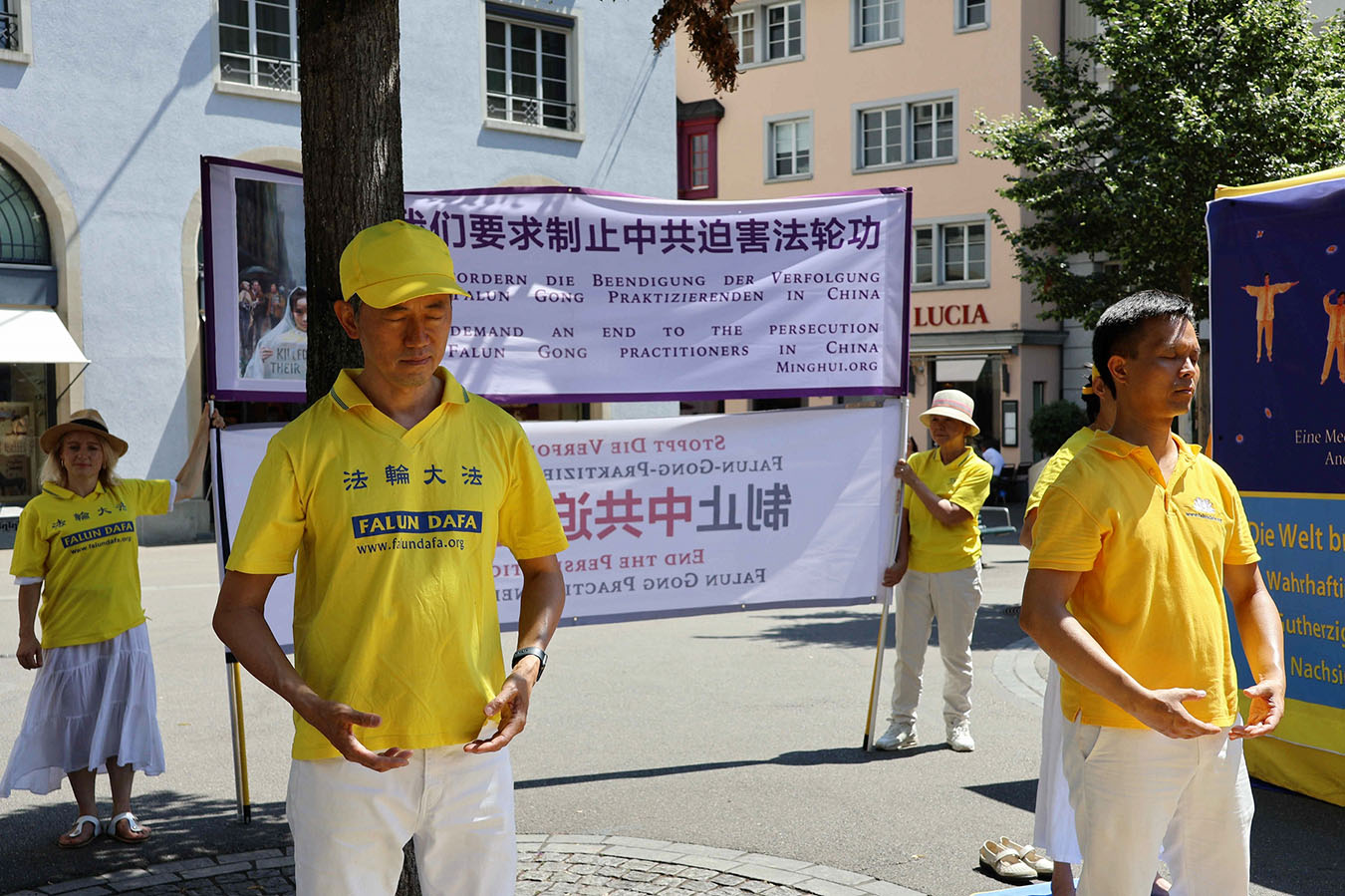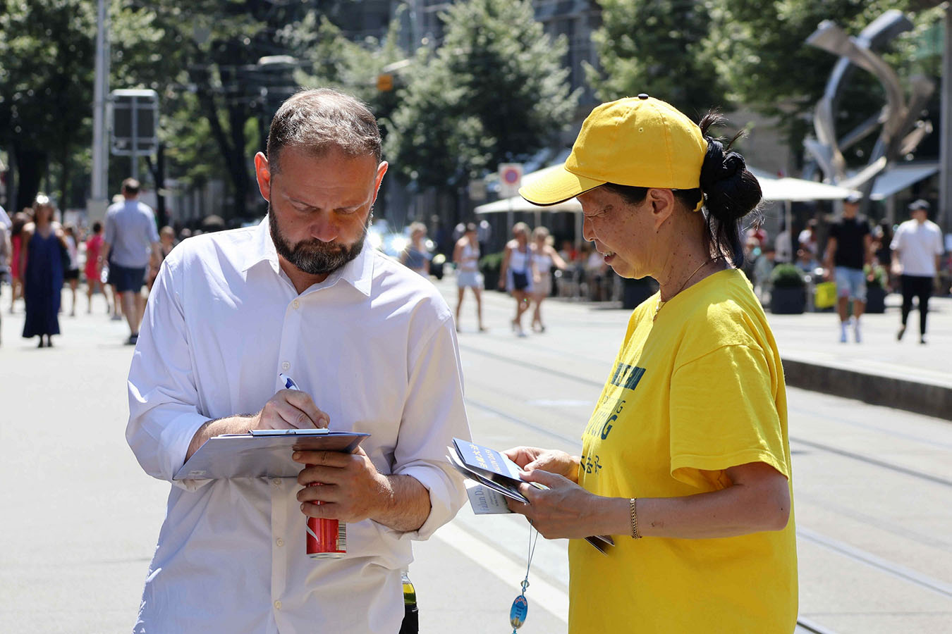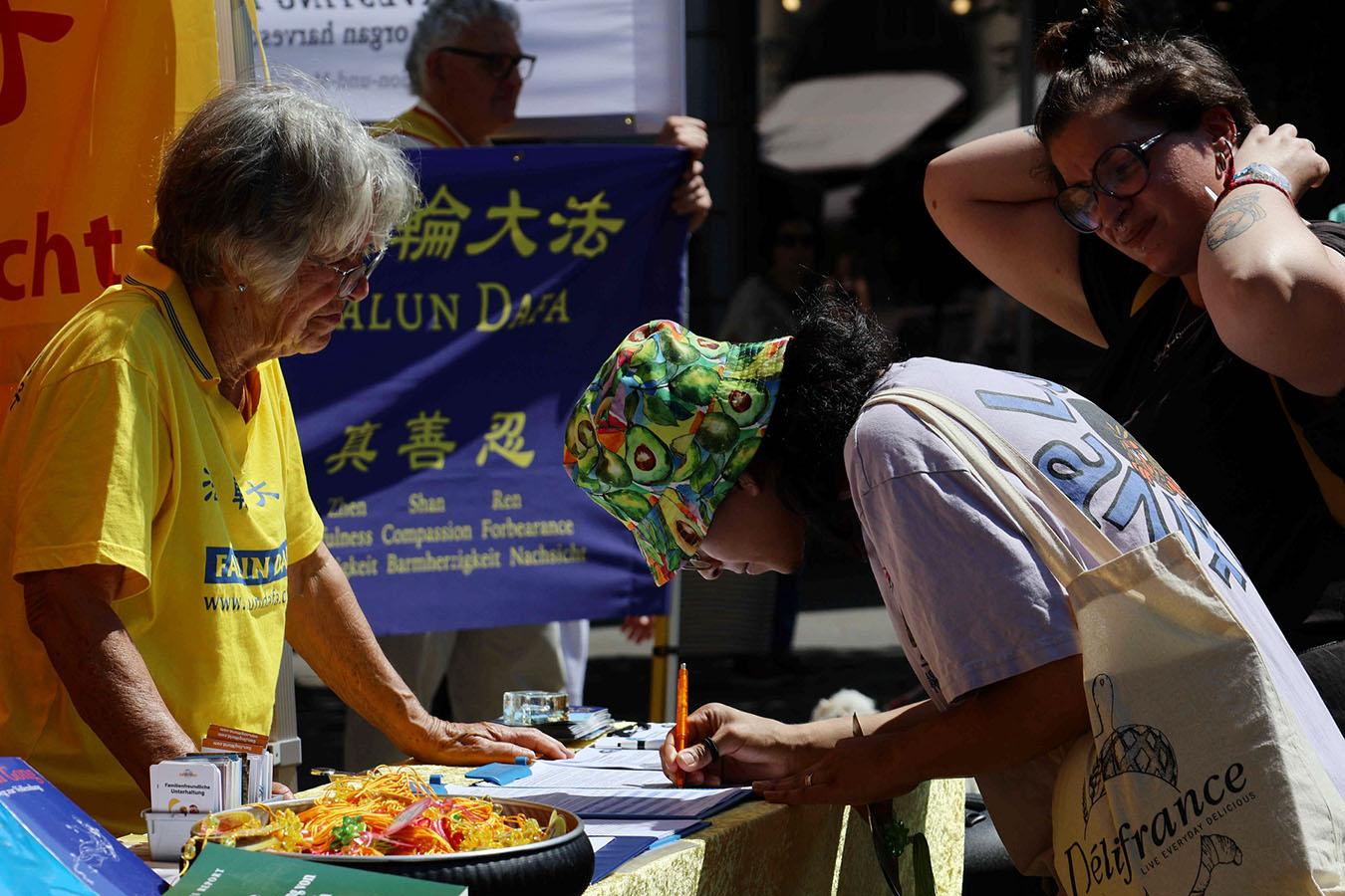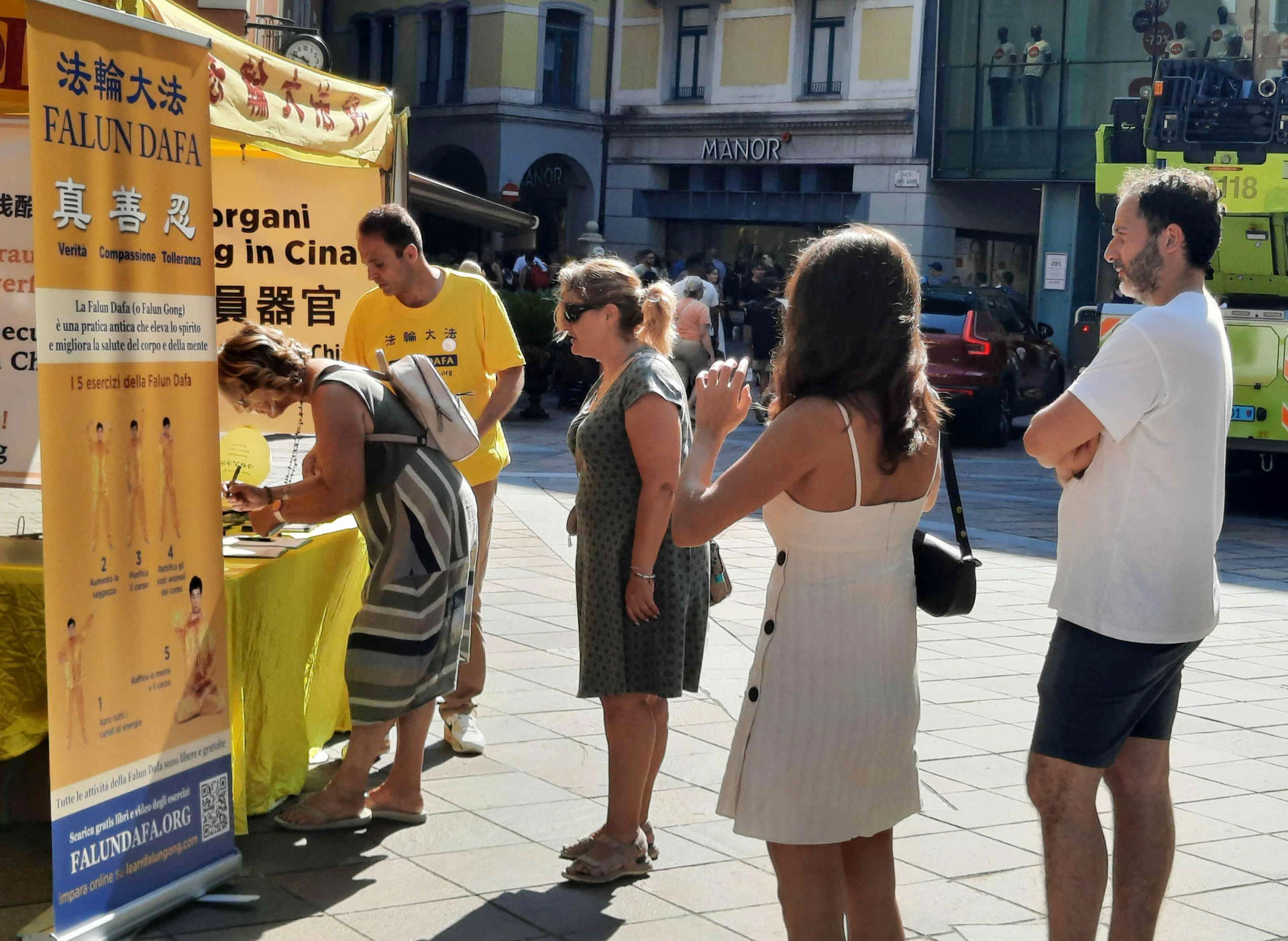自一九九九年七月二十日至今,二十五年来,中共一直在非法关押,酷刑折磨法轮功学员,甚至活摘他们的器官,牟取暴利。因此,七月二十日前后,在世界各地都会看到法轮功学员举办的活动,呼吁制止迫害。当天,在瑞士意大利语区的卢加诺(Lugano)市中心也有同样的活动。