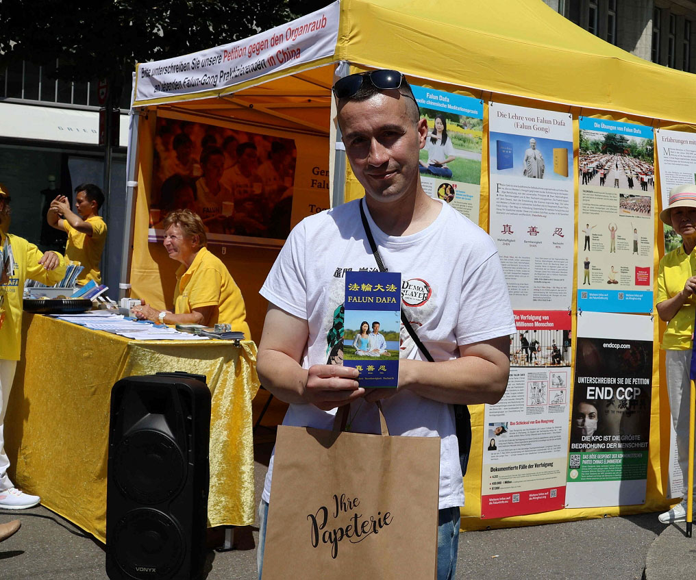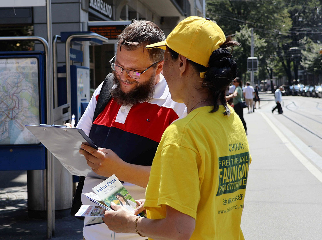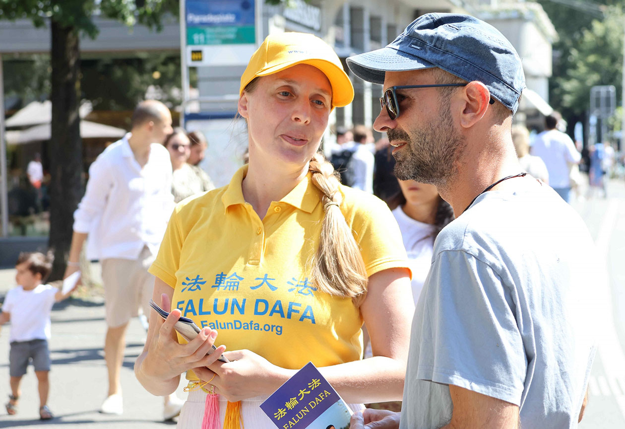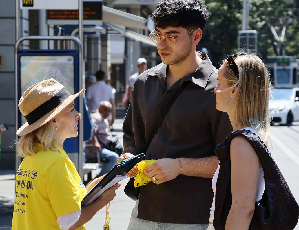 二零二四年七月二十日,智利青年尼克(Nico)和女友在瑞士苏黎世(Zurich)的军械库广场(Zeughausplatz)看见法轮功学员反迫害二十五年的活动后,再次与法轮功学员开始了交谈。
