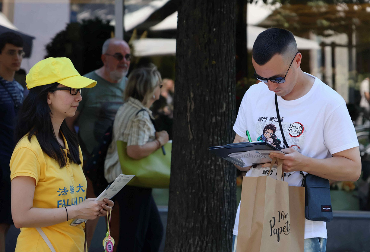 很多路人和尼克一样,看到功法演示后,接过法轮功学员递来的信息资料,有的当场阅读,有的与学员交谈,倾听他们讲述自己修炼法轮大法后身心受益的故事,了解仍在中国发生的迫害。有的当场签名支持法轮功学员,也有的打算回去了解更多讯息,并与朋友分享。