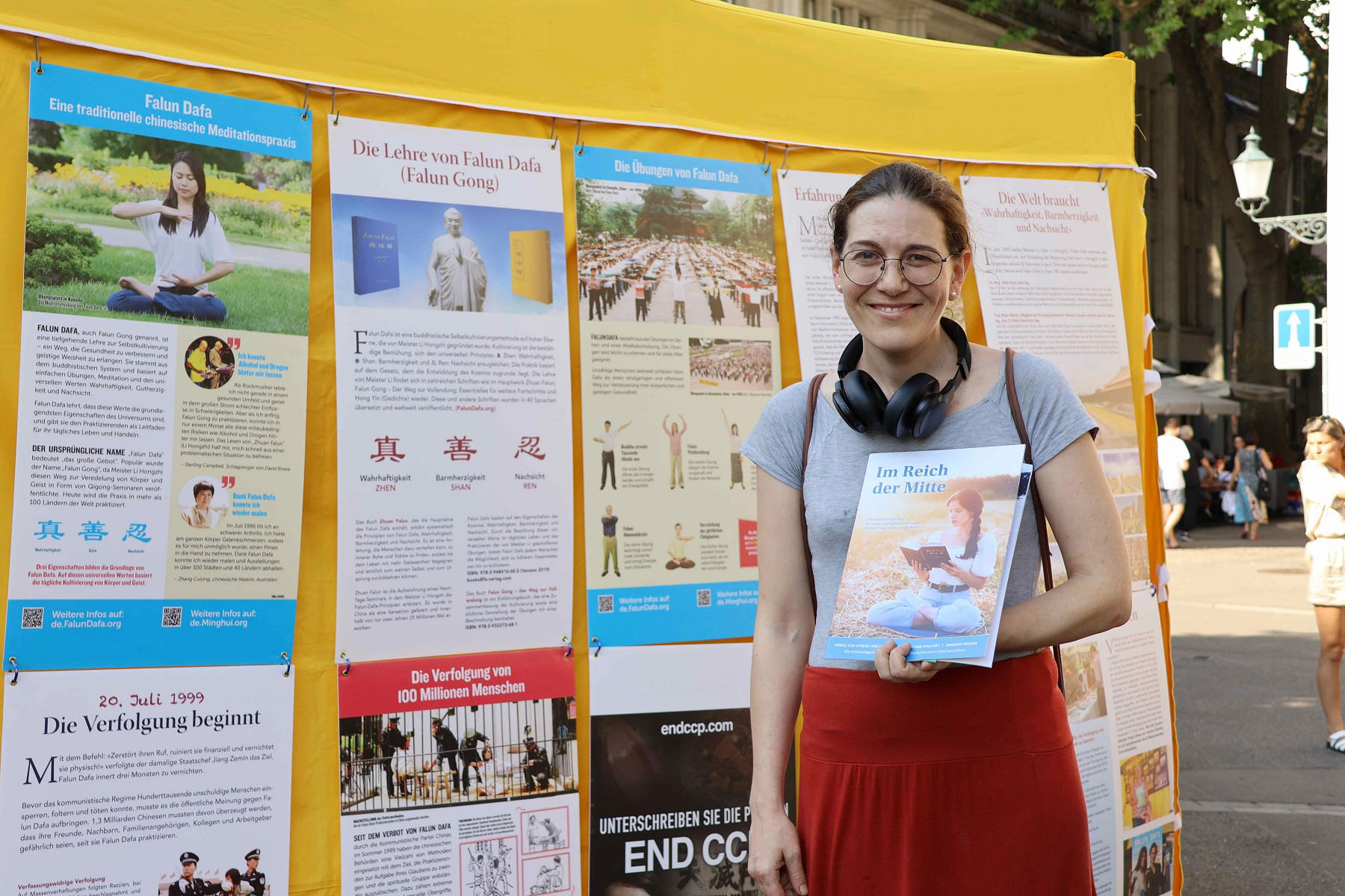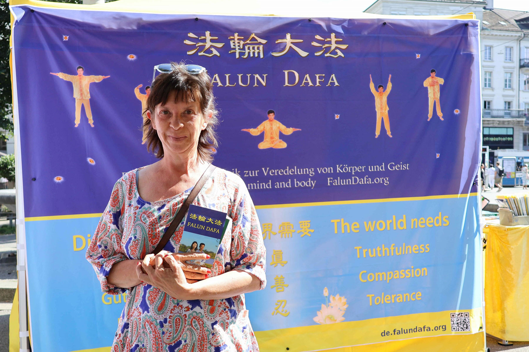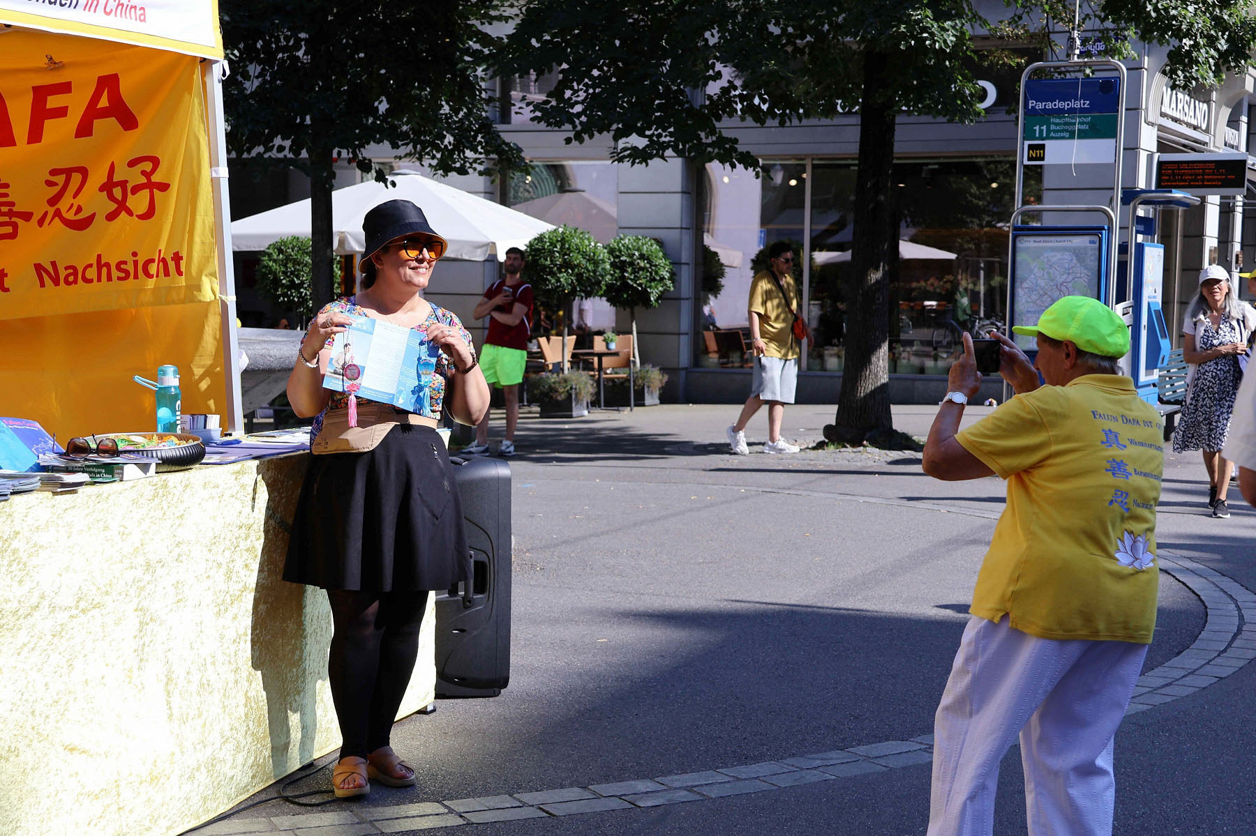看着学员的功法演示,戈瑟伊谈道:“非常专注,很平静。我觉得他们在这个广场办这样的活动真是太棒了。”因为活动地点处于繁华的火车站大街,正对着苏黎世阅兵广场(Paradeplatz),这里是奢侈品店及多家银行的聚集地。“阅兵广场,在瑞士这里是金钱、商业的象征,”戈瑟伊继续说:“在火车站大街让人对此(反迫害)有更多的了解,让我们知道为此事(反迫害)能做些什么,我觉得真是太了不起了。非常感谢他们的付出。”