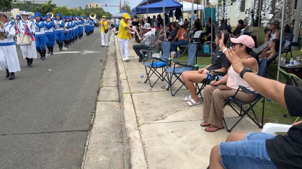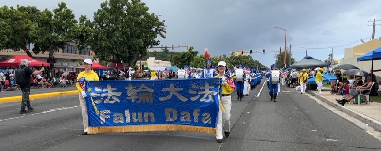 今年参加游行的队伍很多,游行出发前工作人员一再提醒,除了花车在司令台前停下接受评分外,其余队伍沿途一律不准停留。过程中,现场指挥人员也一再吹哨子吹催促队伍迅速往前移动。但当天国乐团行进到司令台前时,却意外的被主办单位人员要求停下来,面对司令台上校阅的关岛政府官员及社区领袖进行演奏,而司仪也穿插清楚的介绍了天国乐团及法轮功。