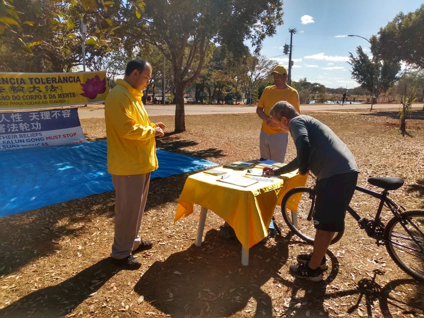 还有一位环卫工人驾车路过活动现场,听到炼功音乐,他立即关闭了车上的收音机,停下车来,接过法轮功学员送给他的传单,倾听法轮功学员的介绍。他了解到很多真相后,表示支持法轮功学员反迫害。
