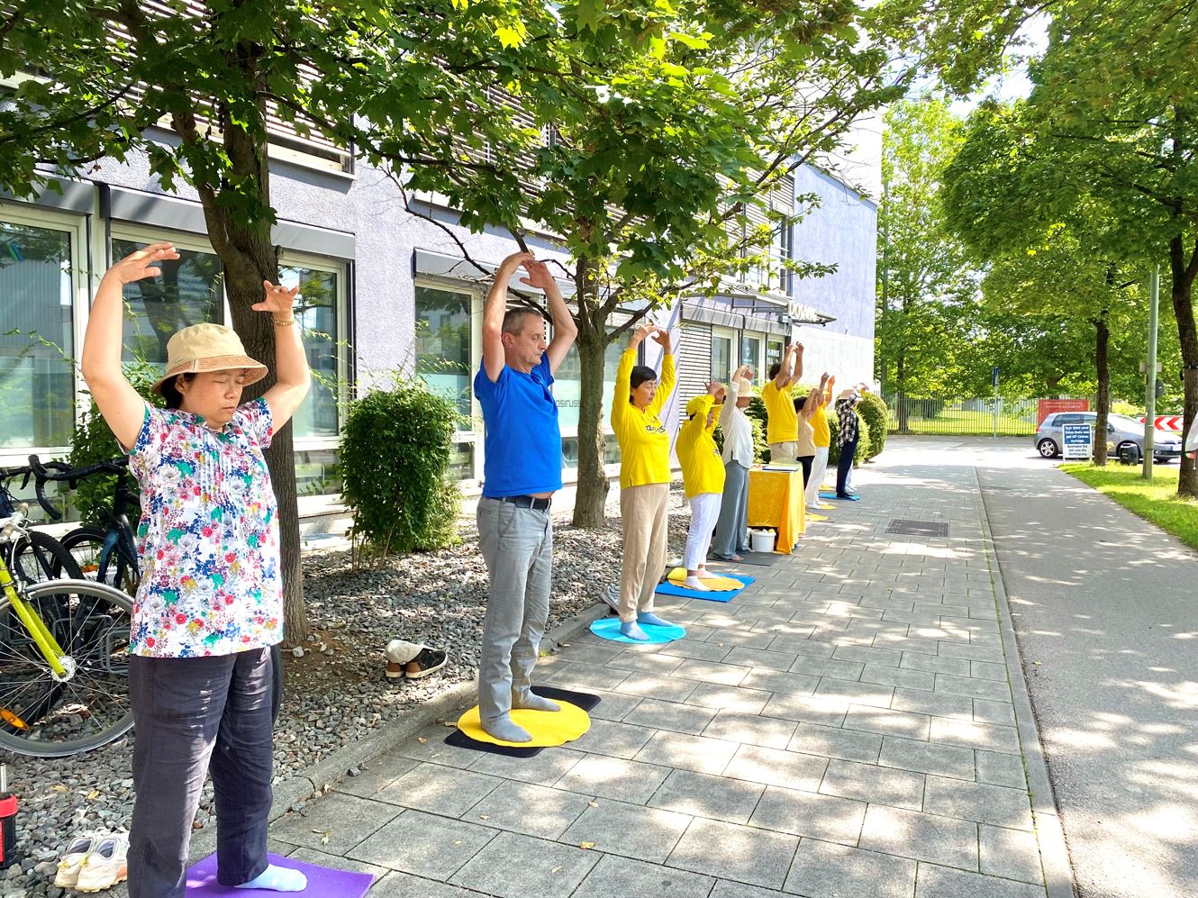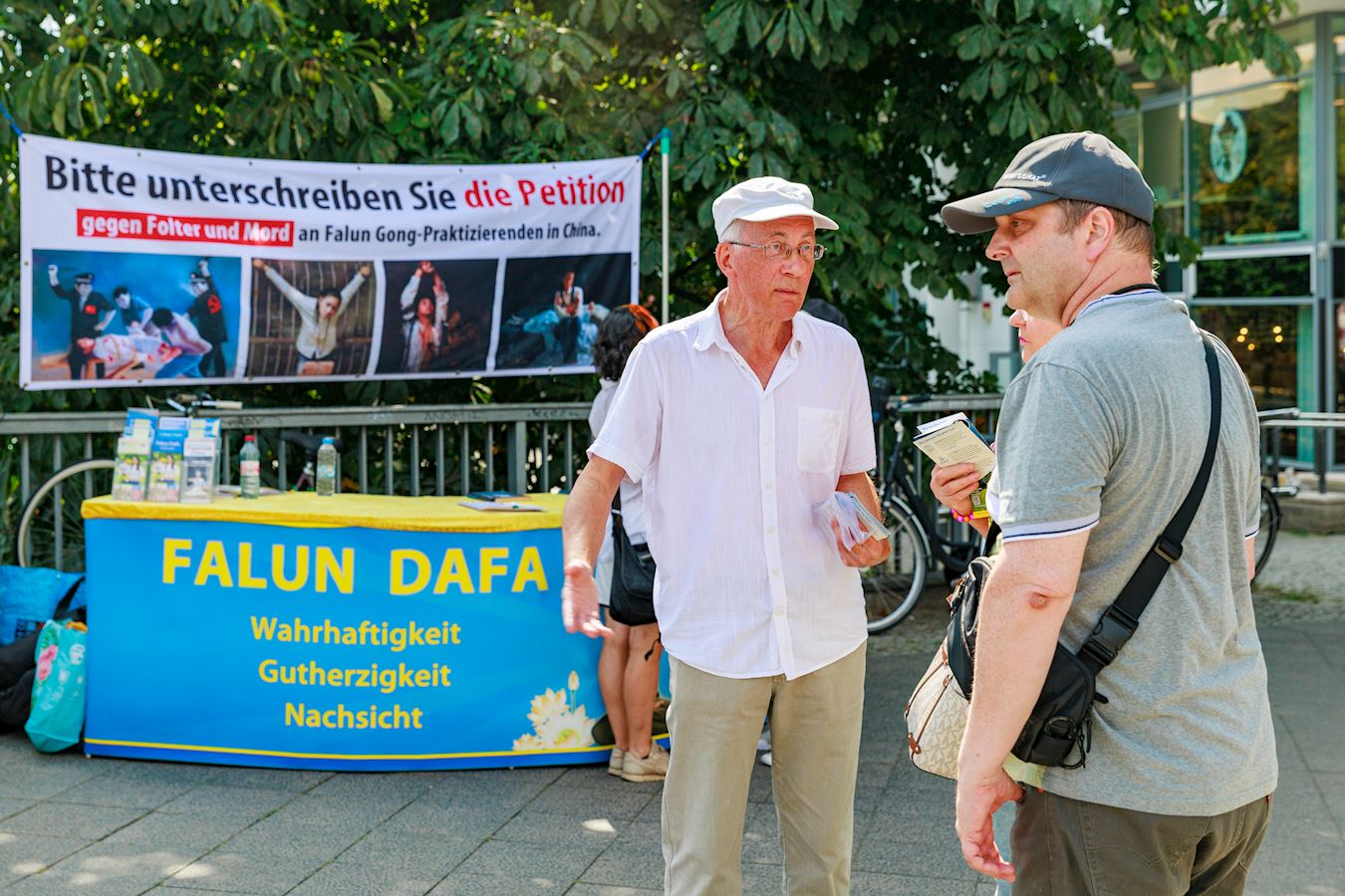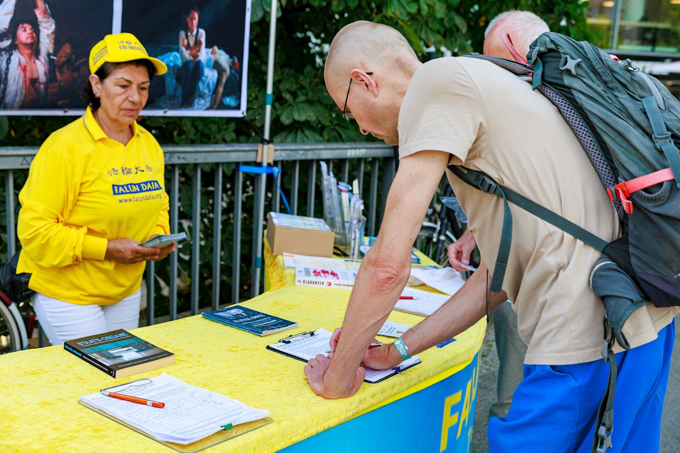 二零二四年七月十八日,法轮功学员在慕尼黑中领馆对面举办反迫害二十五周年活动。每周都到此参加反迫害活动的德国学员塞巴斯蒂安(Sebastian)表示,很多人因为中午用餐或学生放学都会经常路过这个地方,不少人已经了解到真相,其中也有很多人都签了名,声援法轮功学员反迫害。