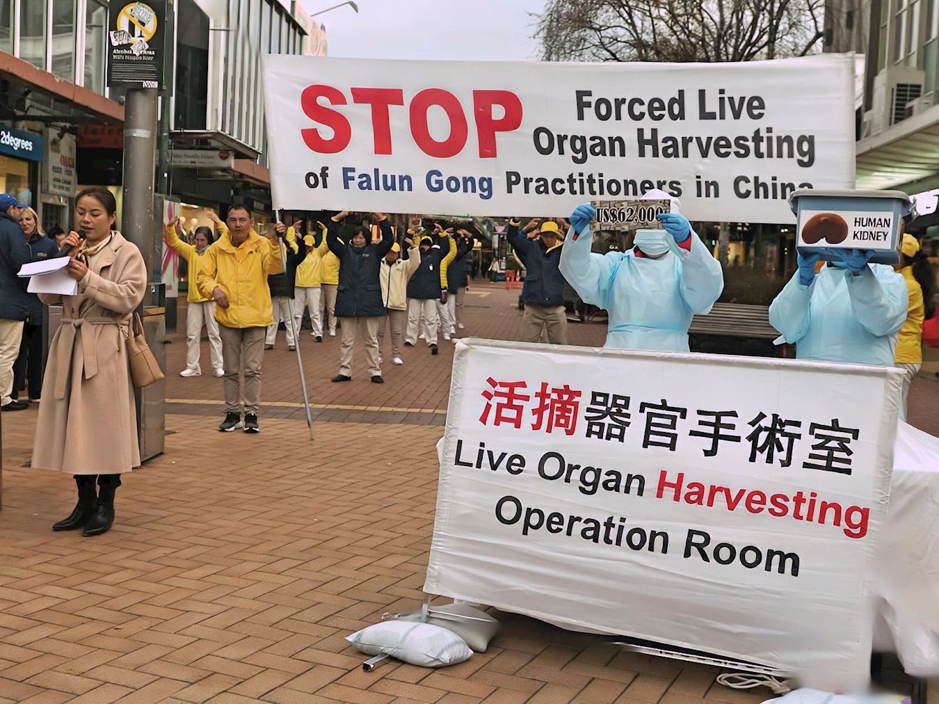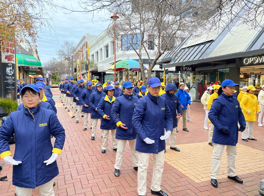 清晨,法轮功学员在惠灵顿市中心古巴(Cube)街炼功,展示优美舒缓的法轮功功法,祥和的场面吸引了人们驻足观看。而在街头的酷刑展正在演示着中共对法轮功修炼者的残酷迫害,以及中共在中国大规模地活摘人体器官牟利的场景。修炼者的美好与中共泯灭人性形成了非常鲜明的对比,让人们反思和警醒。许多路人都无法想象在中国,这样一个秉持真、善、忍信仰的群体,竟然遭到了中共二十五年的迫害。