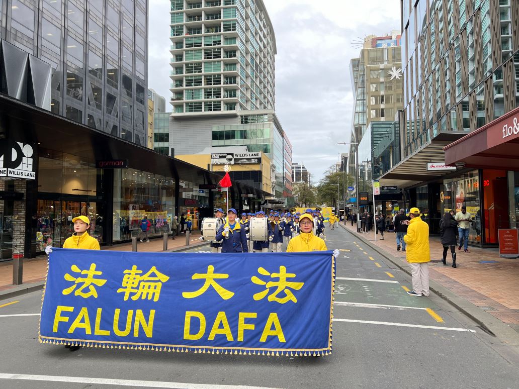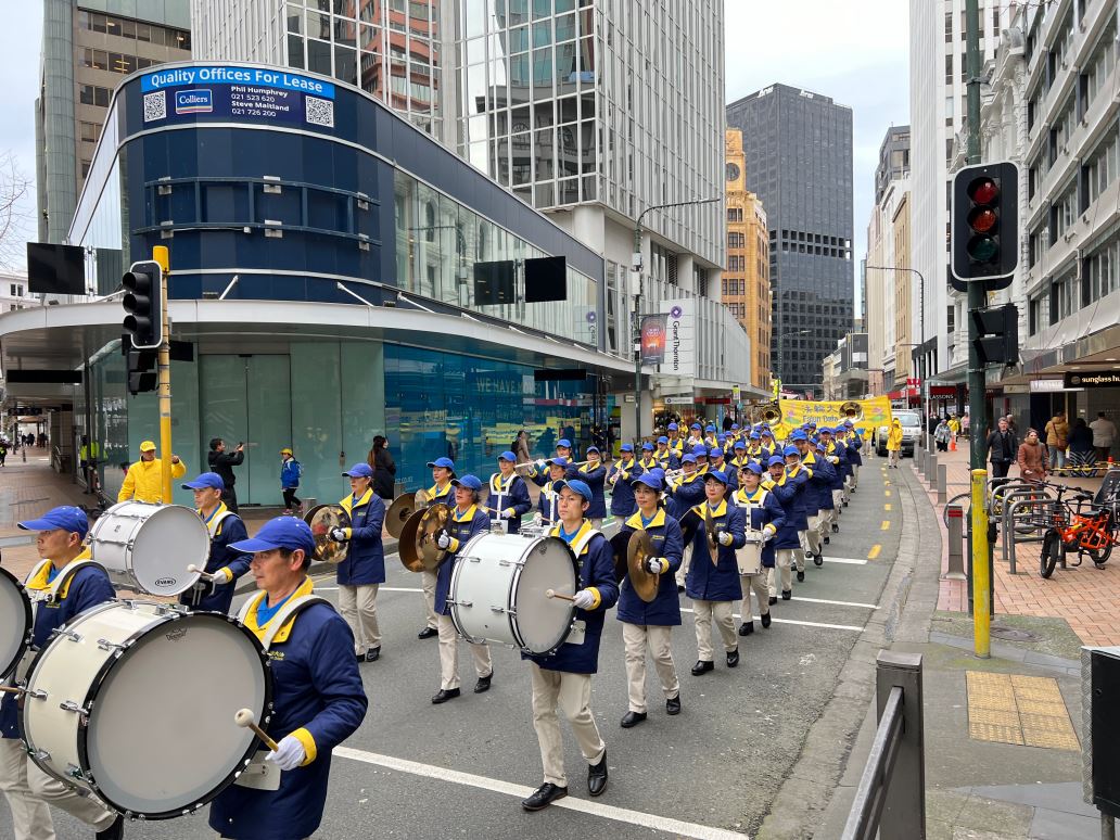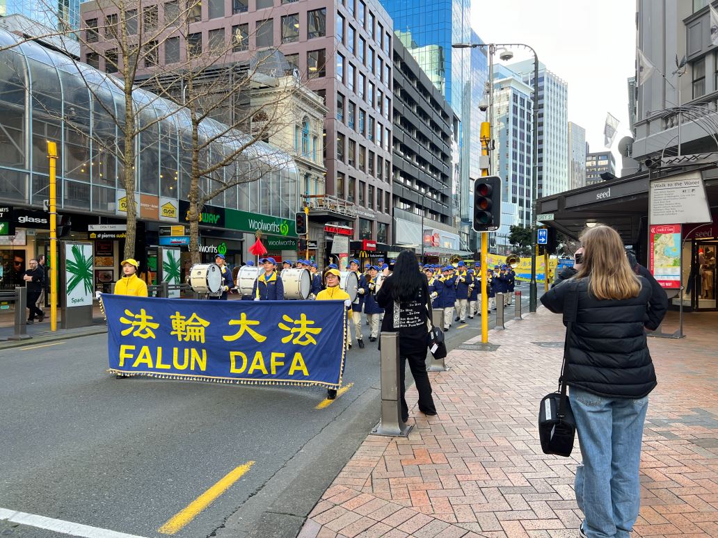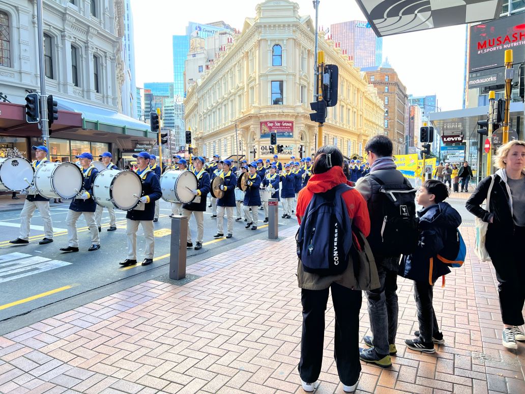 临近中午时分,反迫害的游行正式开始。由法轮功学员组成的天国乐团打头阵,游行队伍沿着市中心,首先来到米德兰(Midland)公园,在短暂的停留和集会后,继续出发,最后到达新西兰国会大厦。
