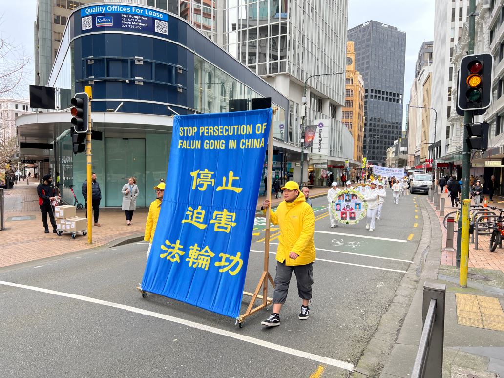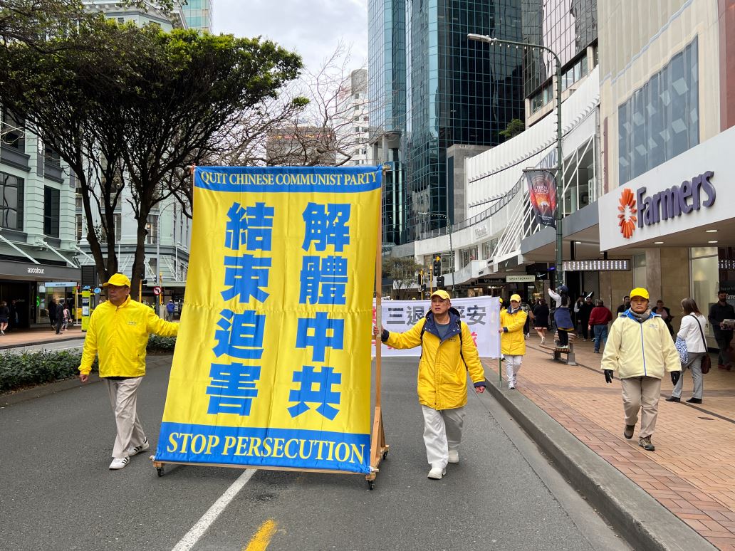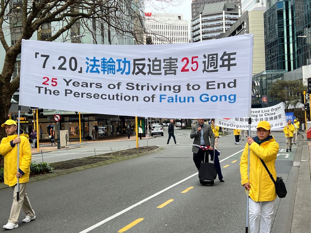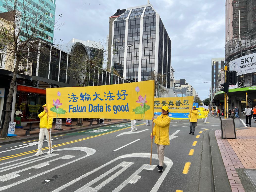 临近中午时分,反迫害的游行正式开始。由法轮功学员组成的天国乐团打头阵,游行队伍沿着市中心,首先来到米德兰(Midland)公园,在短暂的停留和集会后,继续出发,最后到达新西兰国会大厦。