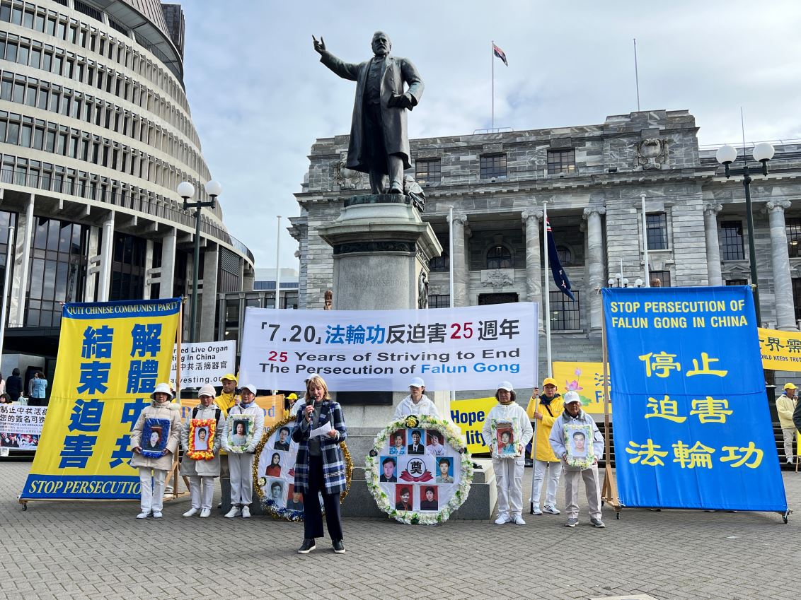 终止中共滥用器官移植国际联盟(ETAC)新西兰负责人玛戈·麦克维(Margo MacVicar)在国会前发表演讲。她说:“ETAC是由律师、学者、伦理学家、医学专业人士、研究人员和人权倡导者组成的联盟,致力于结束中共活摘器官。在中国,每周都有数千人在医院被谋杀,器官被摘除,并在国内外贩卖。这些无辜的受害者主要是法轮功学员,还有穆斯林维吾尔人、基督徒和西藏人。现在,中国是世界上最大的器官移植提供方。据估计,在中国每年有多达十万人被屠杀,成为器官移植的提供者。在中国,这是一个利润丰厚的行业,中国的医生成为了同谋(罪犯)。”