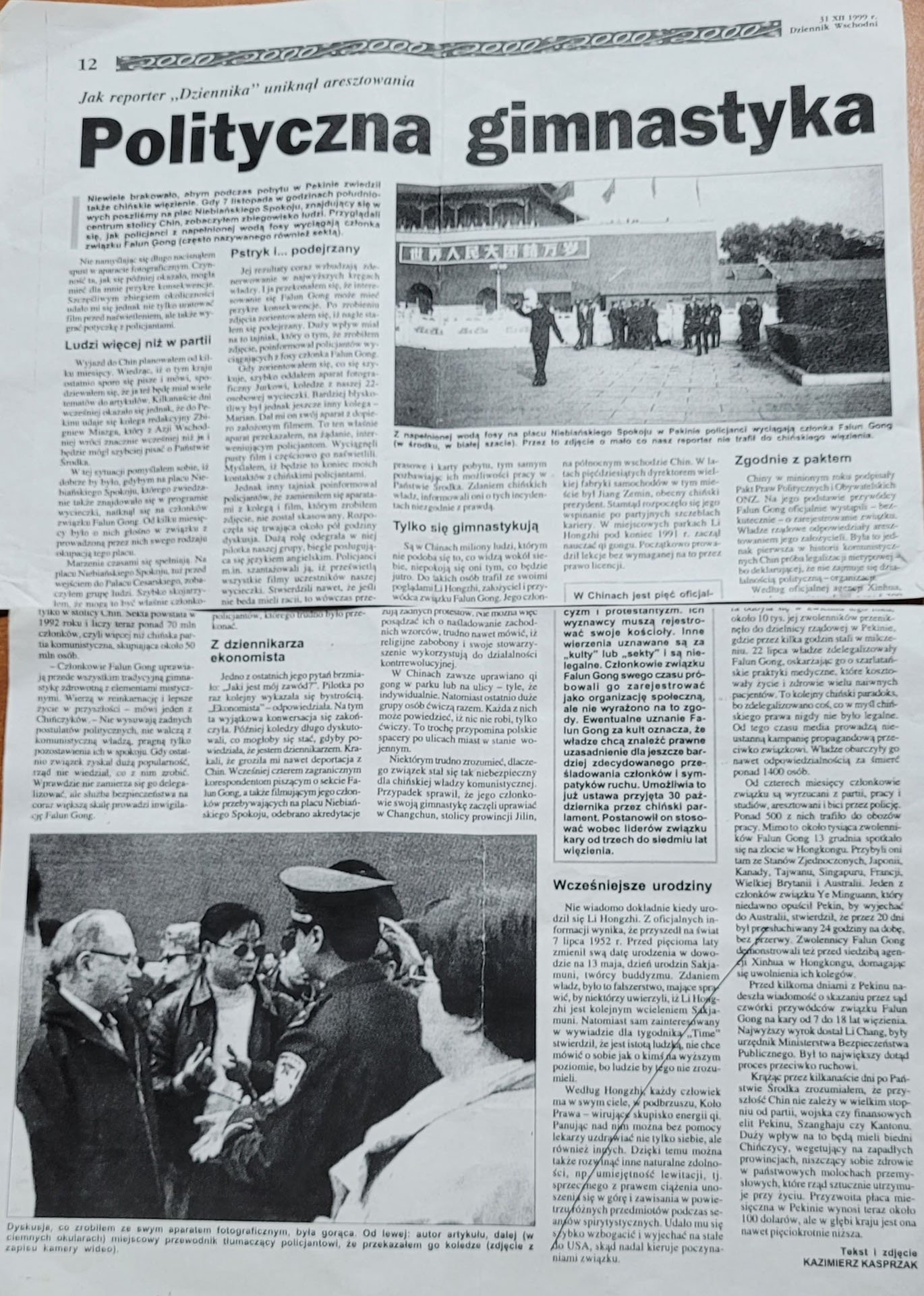 ![]() 图13:卡斯普尔扎克先生,在一九九九年十一月在天安门广场亲眼目睹中共暴力抓捕法轮功学员并拍照,也因此险些被抓捕。全部经历过程刊登在一九九九年最后一天的波兰《记者报》上。图片翻拍当年《记者报》。 |