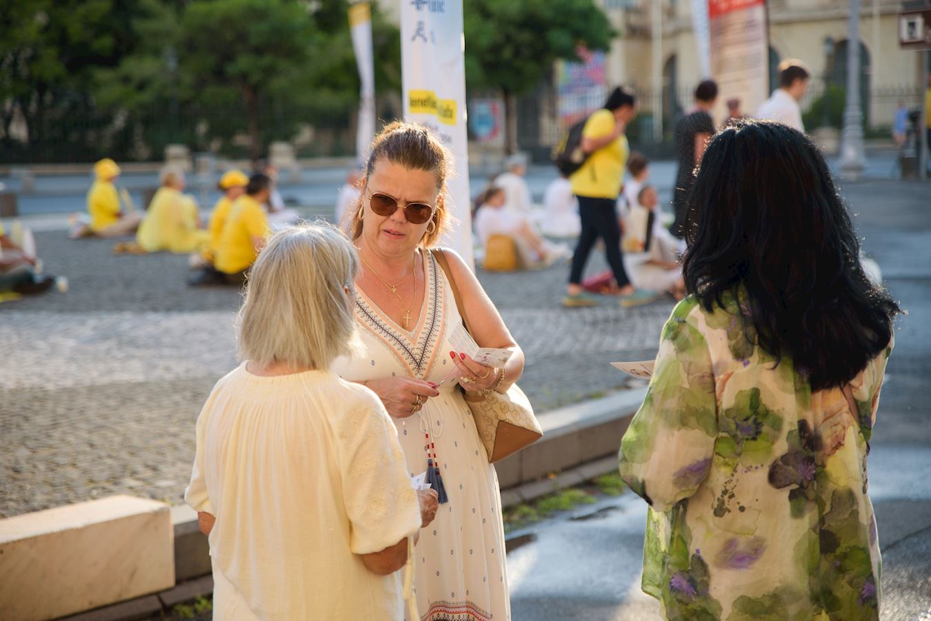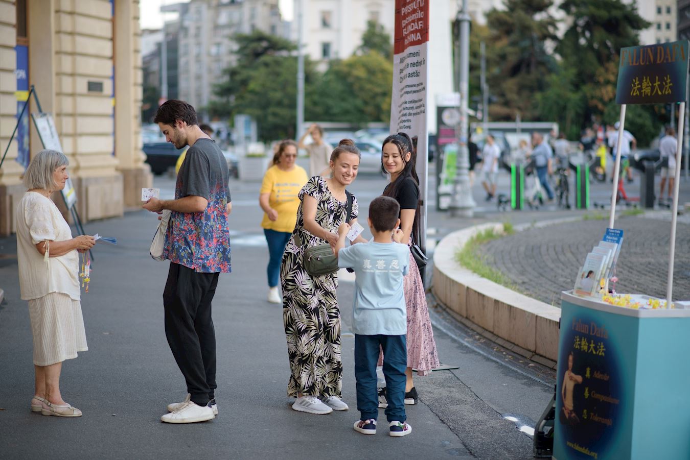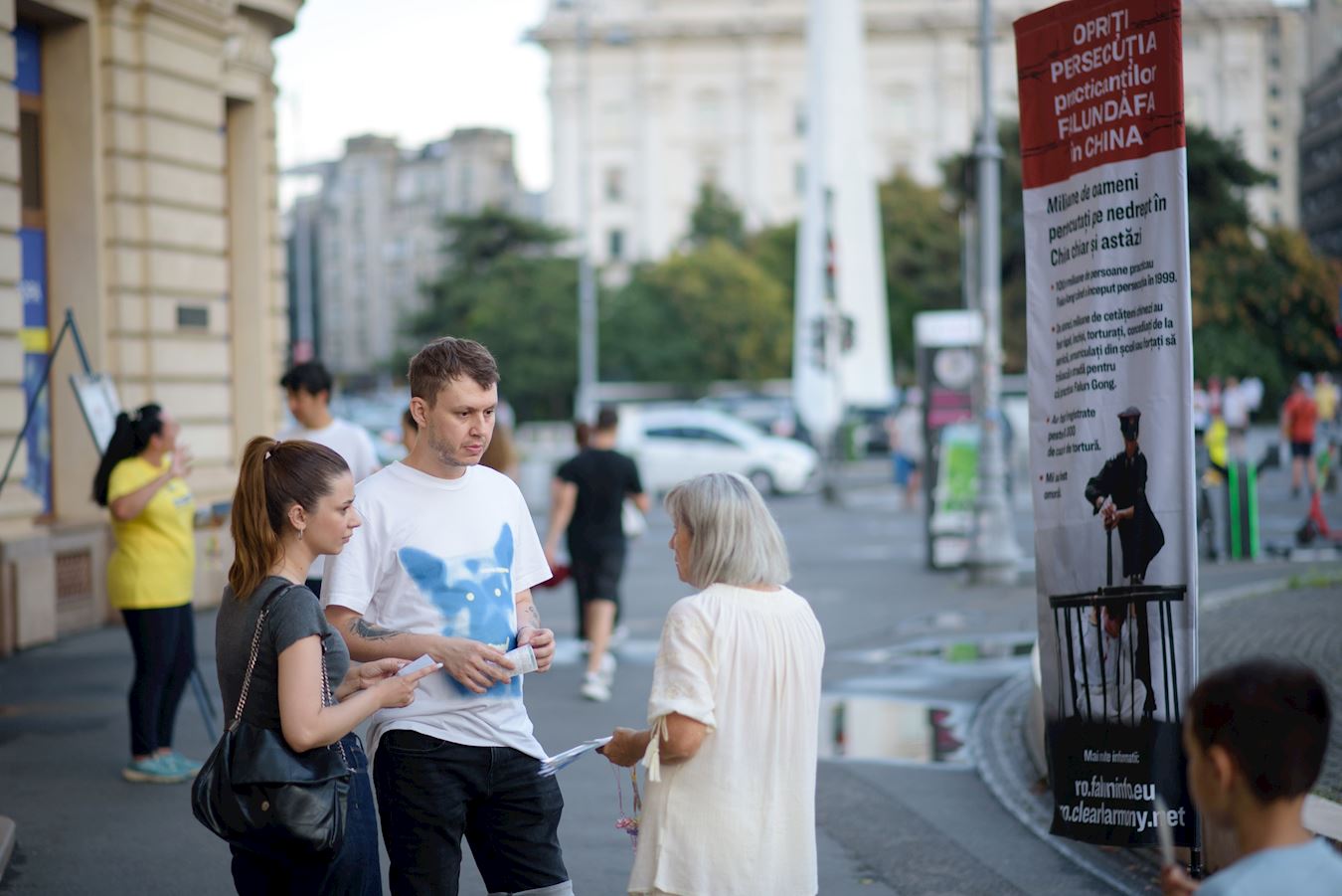 一位四十多岁的女士与朋友路过活动现场,她已经知道法轮大法好几年了,她很高兴法轮功在罗马尼亚得到传播,她还询问了有关炼功点的更多信息。中共对法轮功的迫害还在持续,这让她感到非常难过,她告诉学员“要继续努力坚守信仰”。