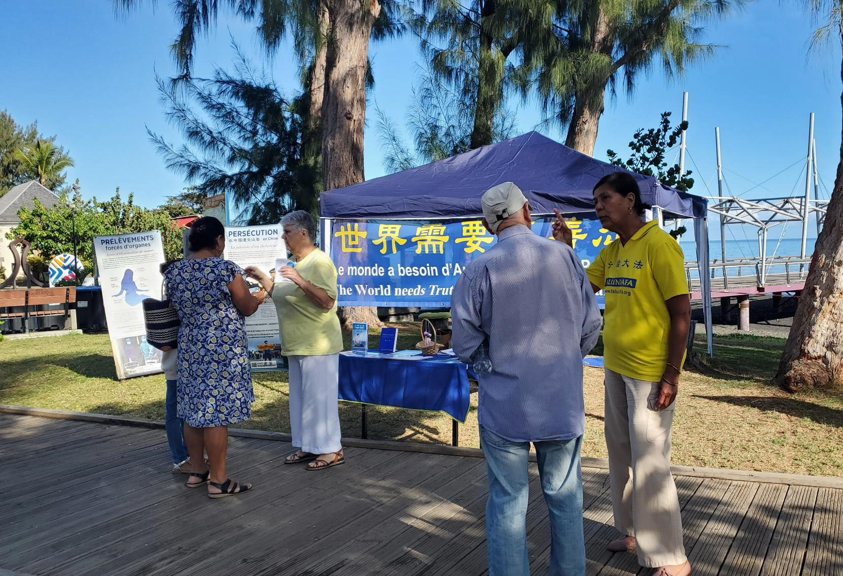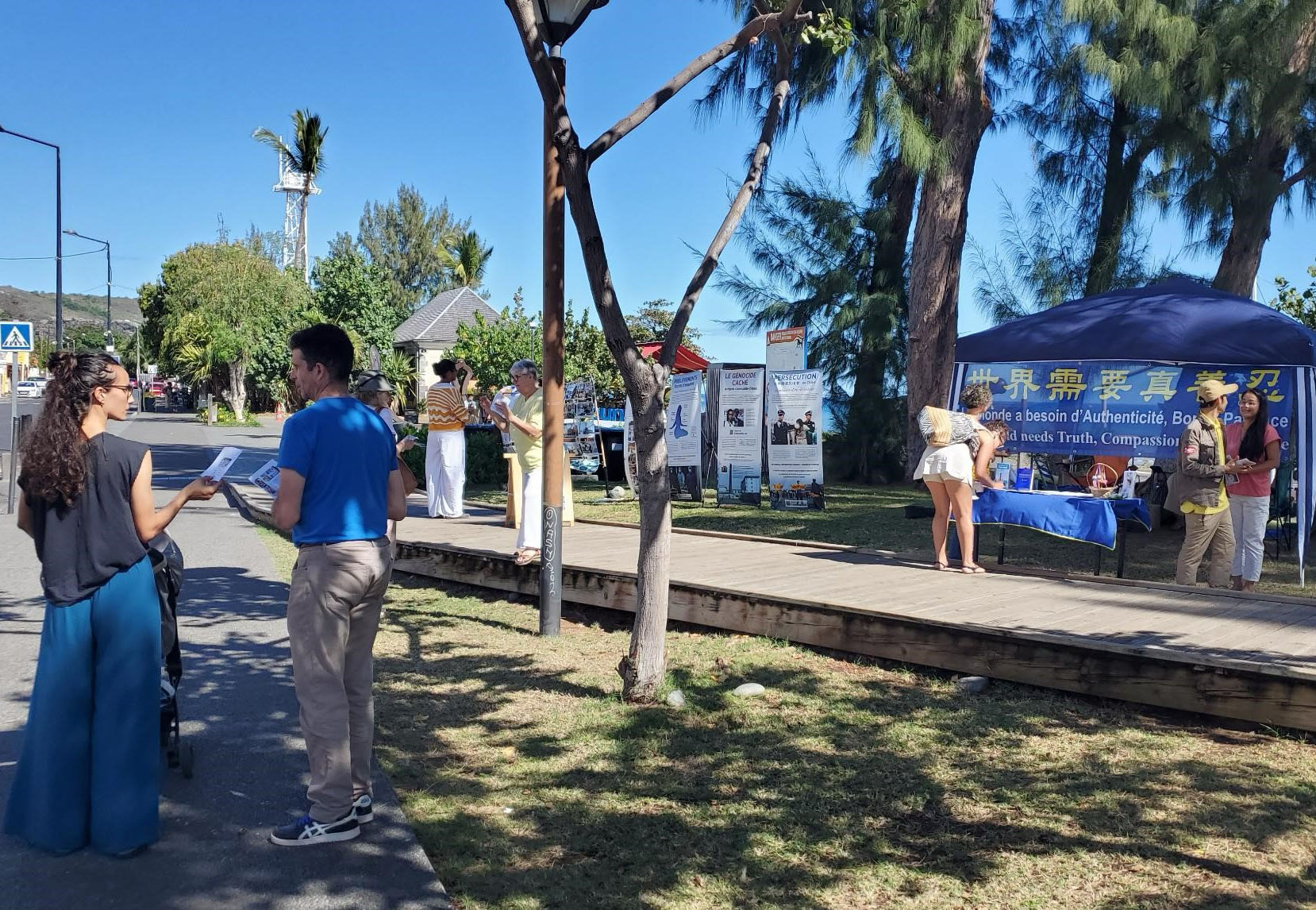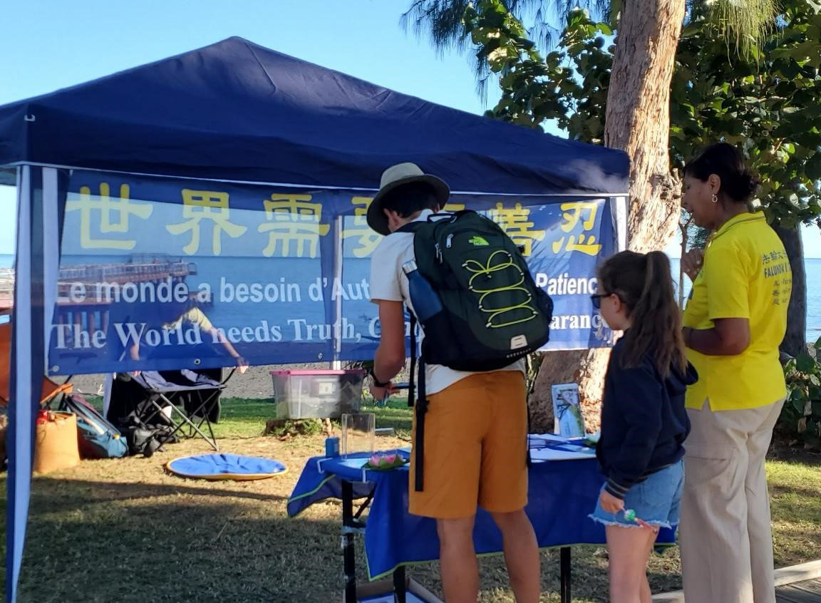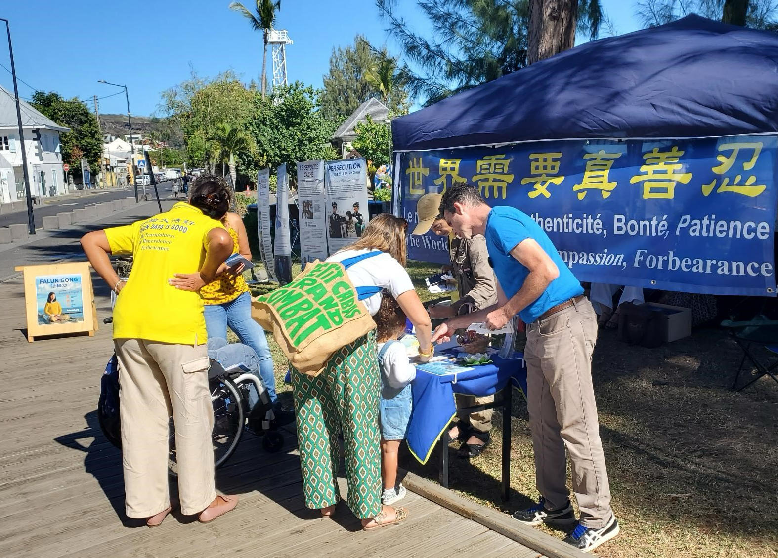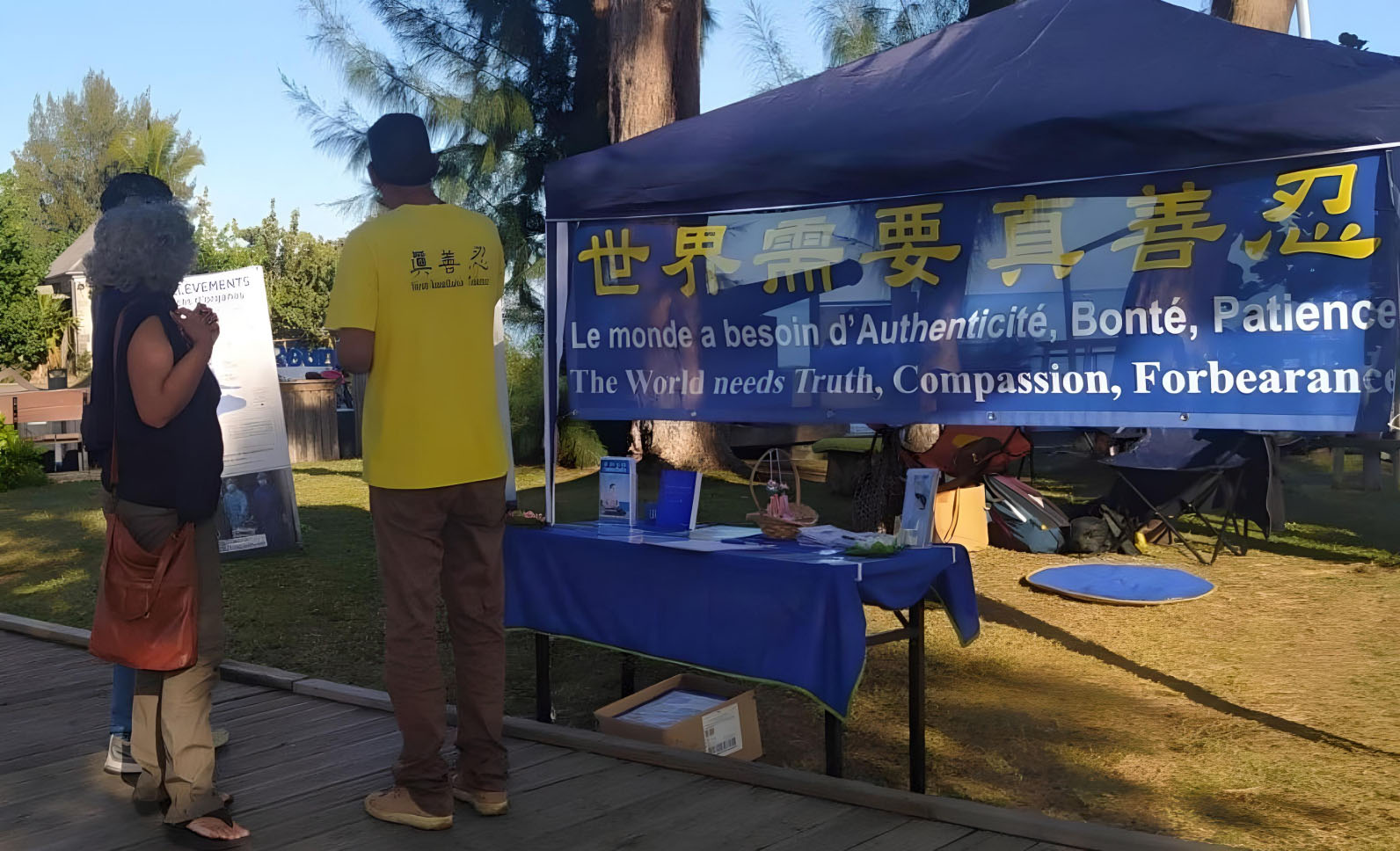 一位先生对法轮功的功法产生了兴趣,并当场学炼了功法,同时询问了留尼汪岛上的炼功地点的信息。