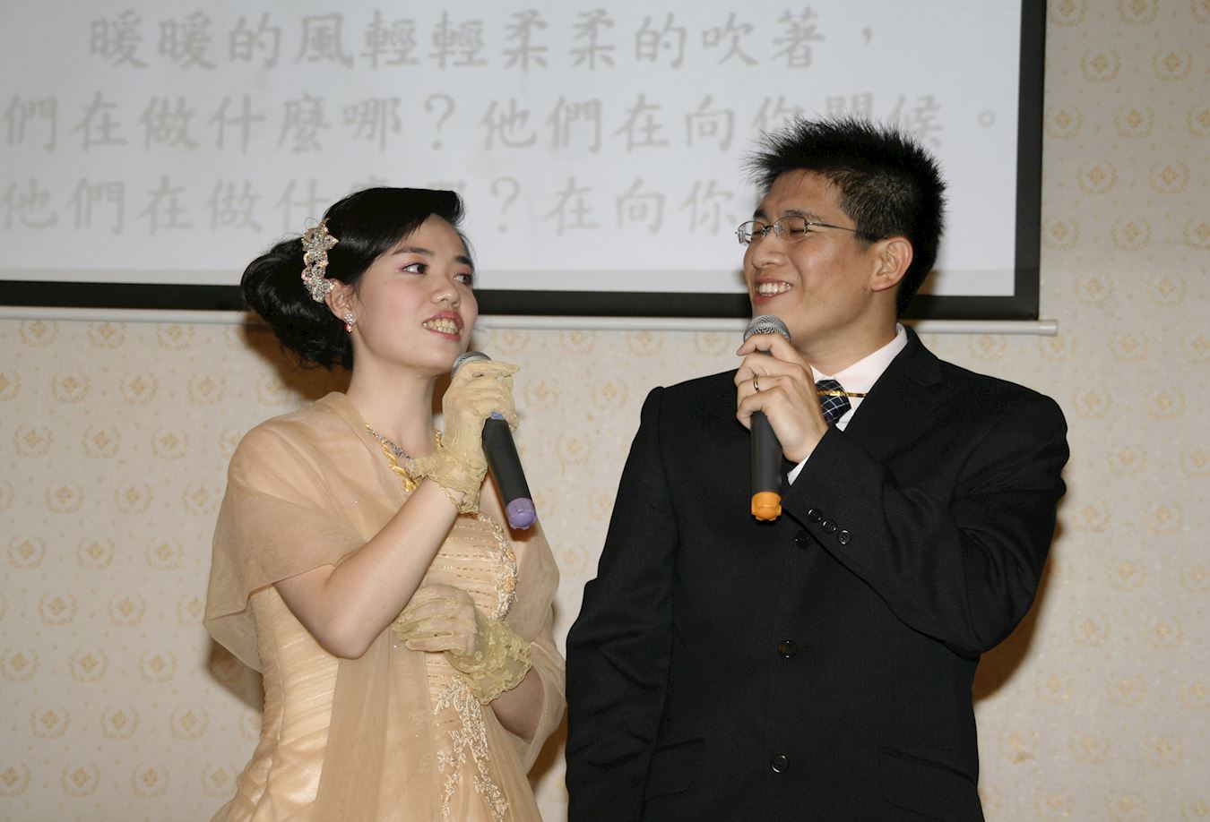 ![]() 图2:二零零六年,静美的女儿佳逸和弘钧在婚礼上为宾客演唱法轮大法弟子的创作的歌曲《你我有缘》。 |