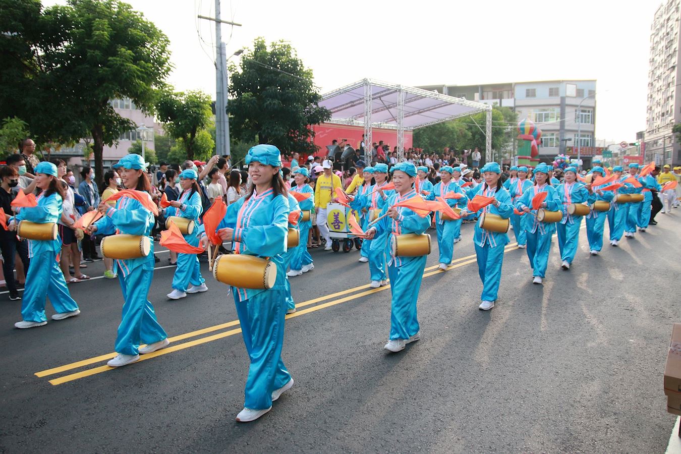 ![]() 图3:静美(第一排中间)跟女儿佳逸(第一排右一),跟着腰鼓队海内外游行,传递大法美好。 |