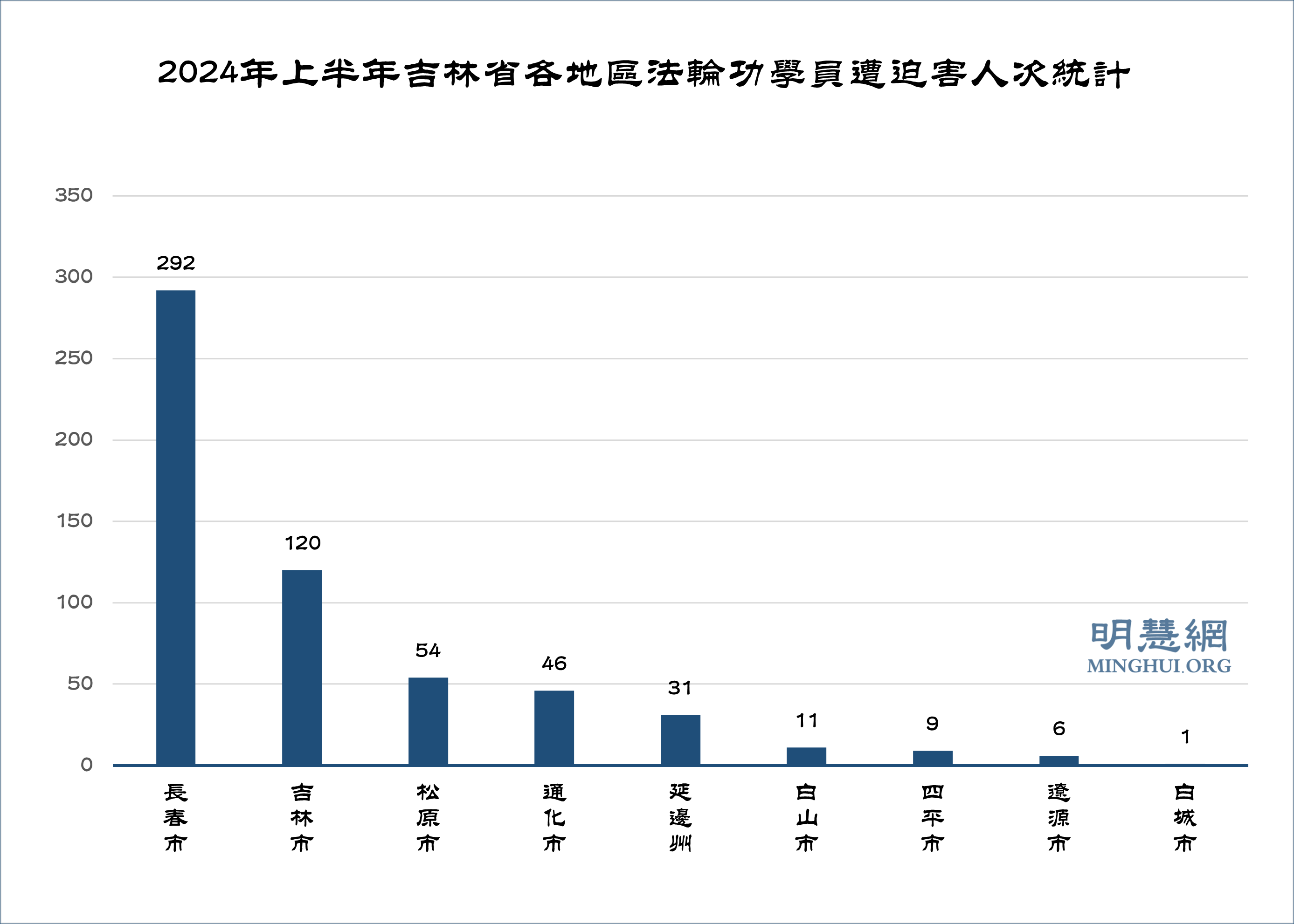 ![]() 图1:2024年上半年吉林省各地区法轮功学员遭迫害人次统计 |