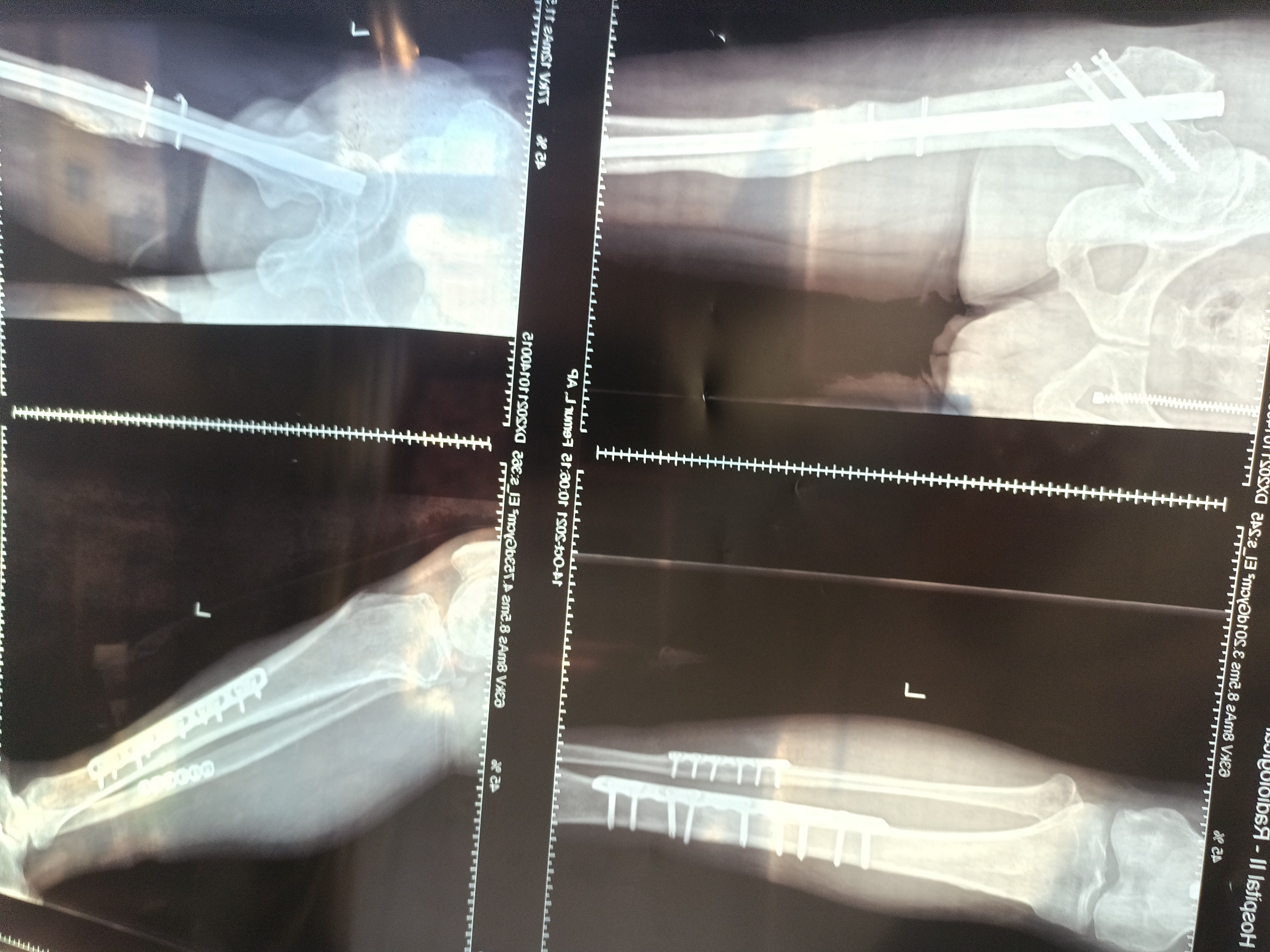 医院检验发现,我的右侧第二肋骨前支骨折伴右侧气胸,肺压缩15%,左侧第六肋骨骨折;左侧股骨、左侧胫腓骨中下段骨折,断端重叠错位并成角,面部、眼睛多处划伤。护士用冰袋把我的左腿裹着,然后像高射炮那样架在病床上,病床周围摆满了各种仪器,头上、手上、胸前到处是各种传感器电线。我的整个左腿从臀部到脚后跟好几处骨折,而且脚踝骨上面一段是粉碎性骨折,一堆骨渣子已经无法修复。