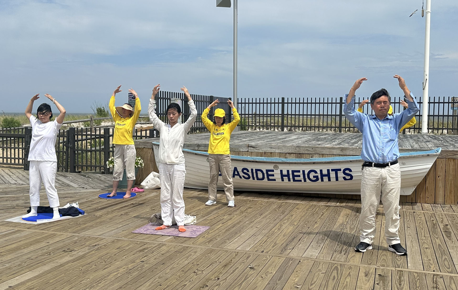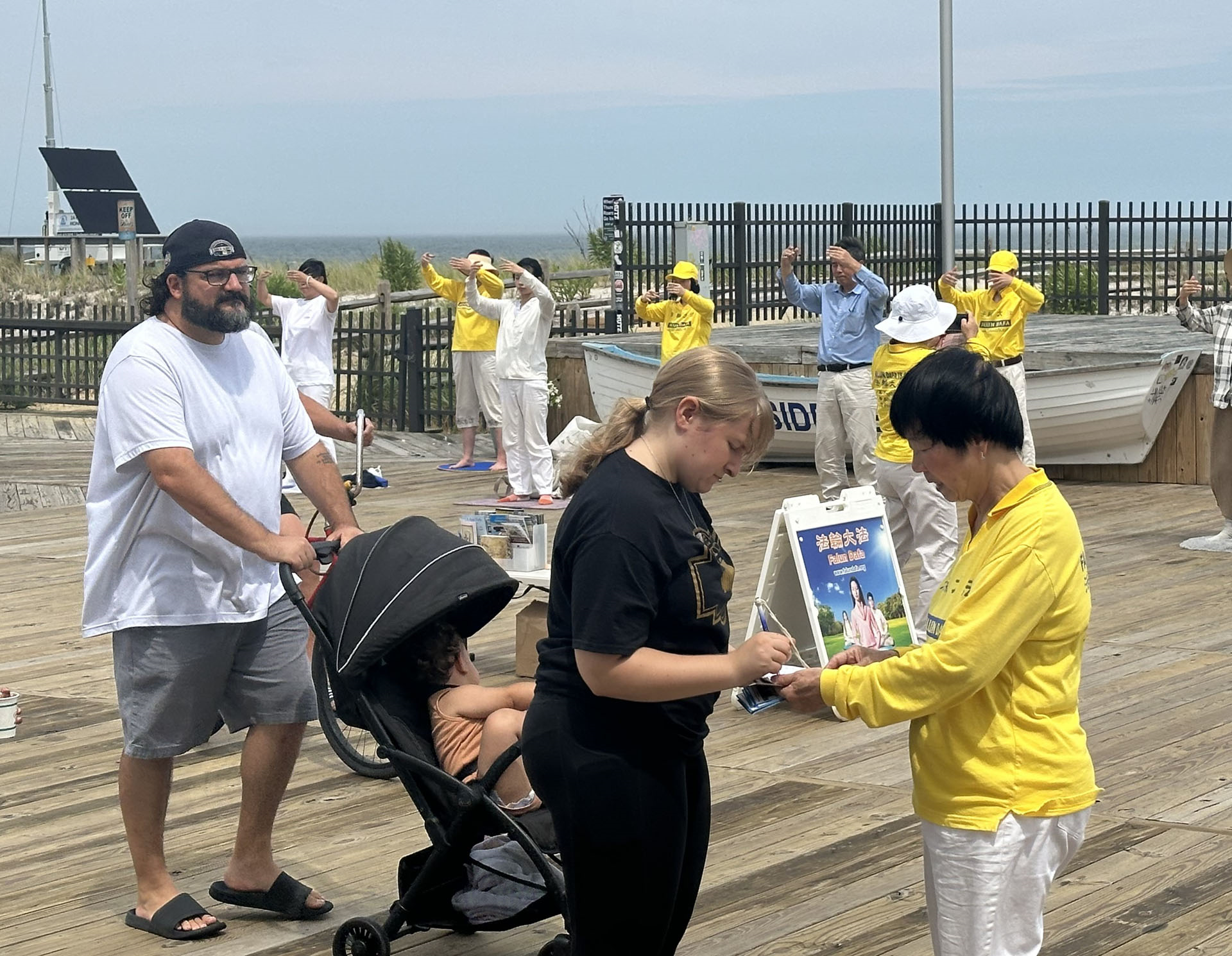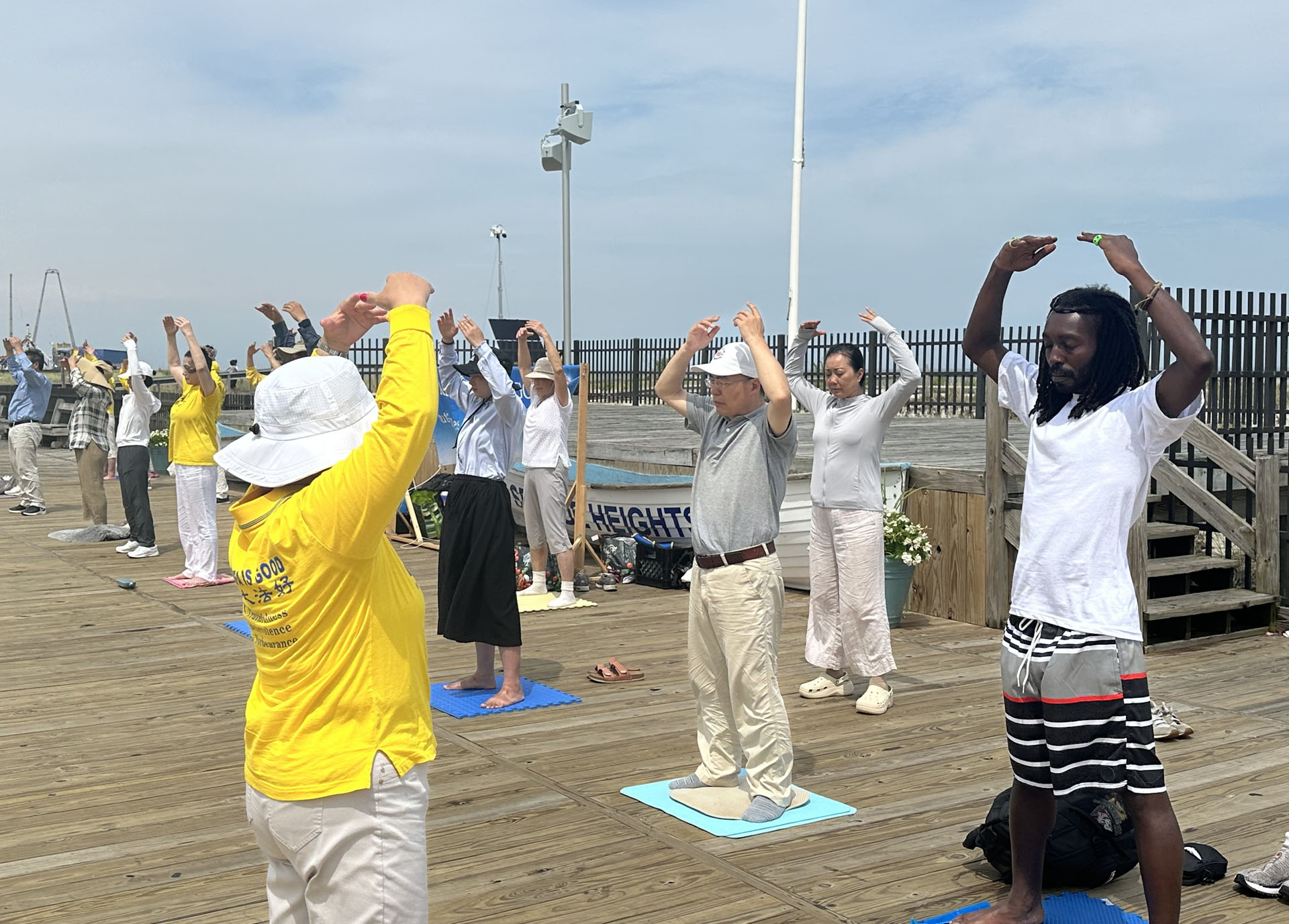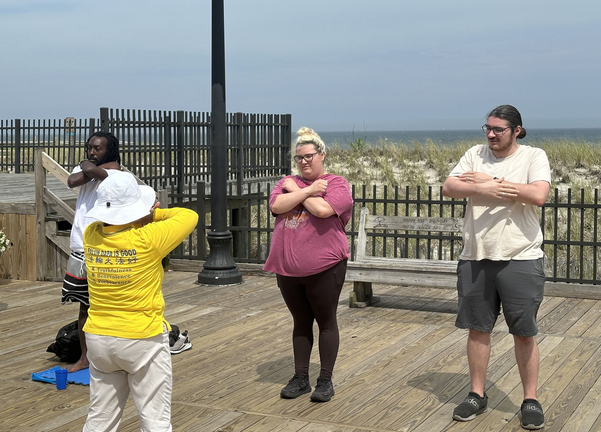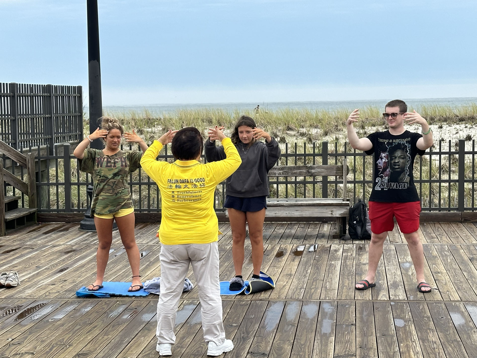 ![]() 图1:法轮功学员在海滨高地镇木板路上展示功法,吸引游客们主动要求学功。图为罗格斯大学的年轻学生们在学习第二套功法。 |
