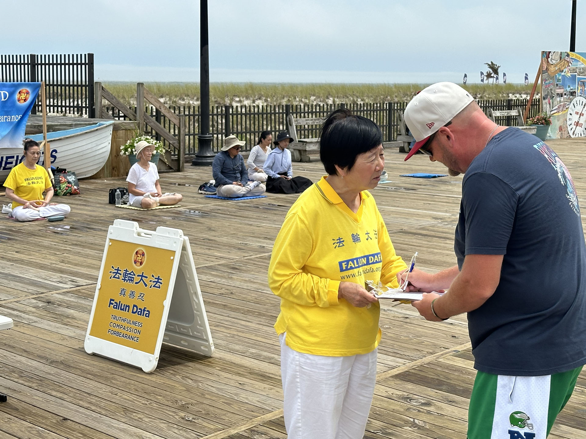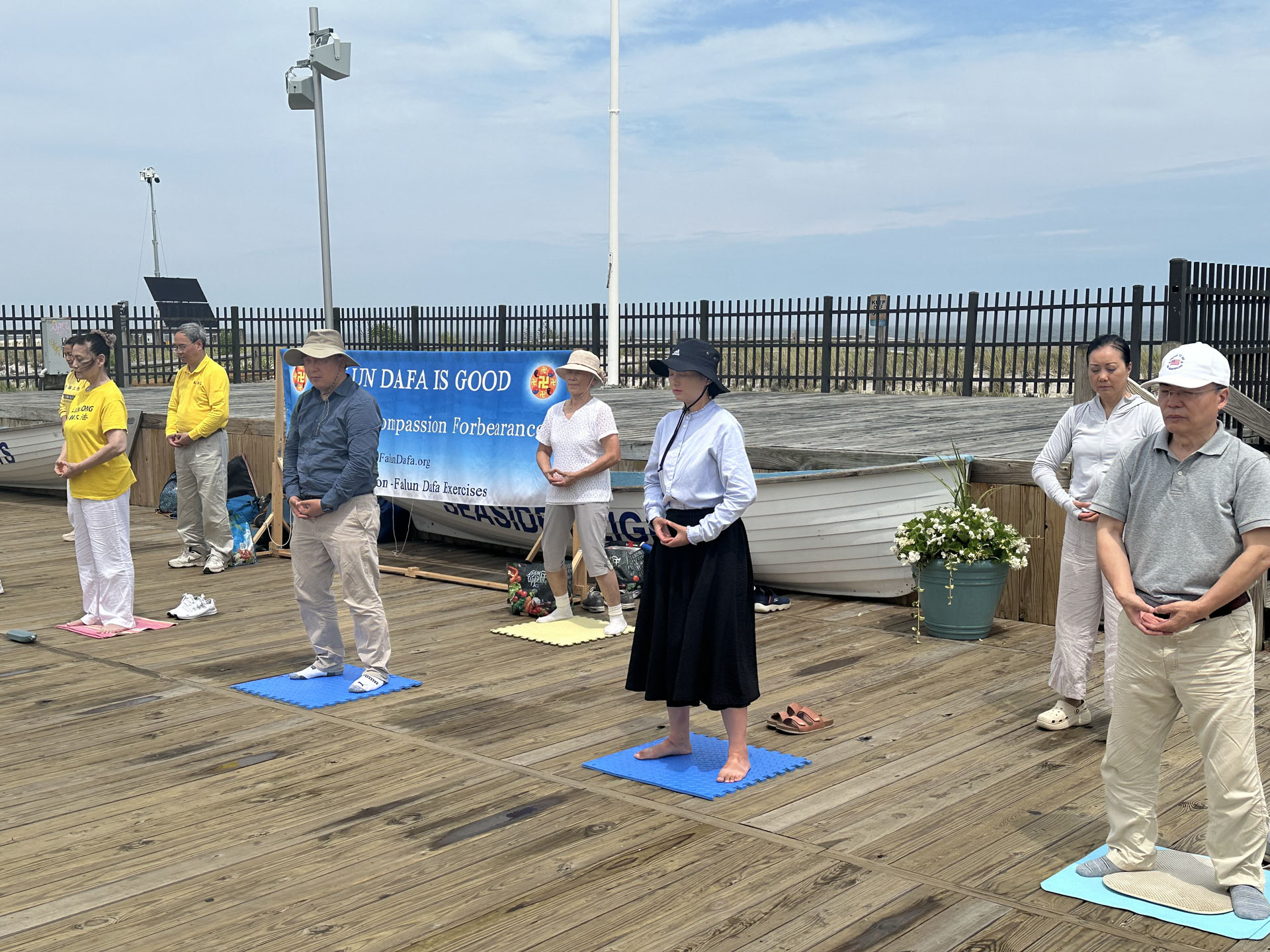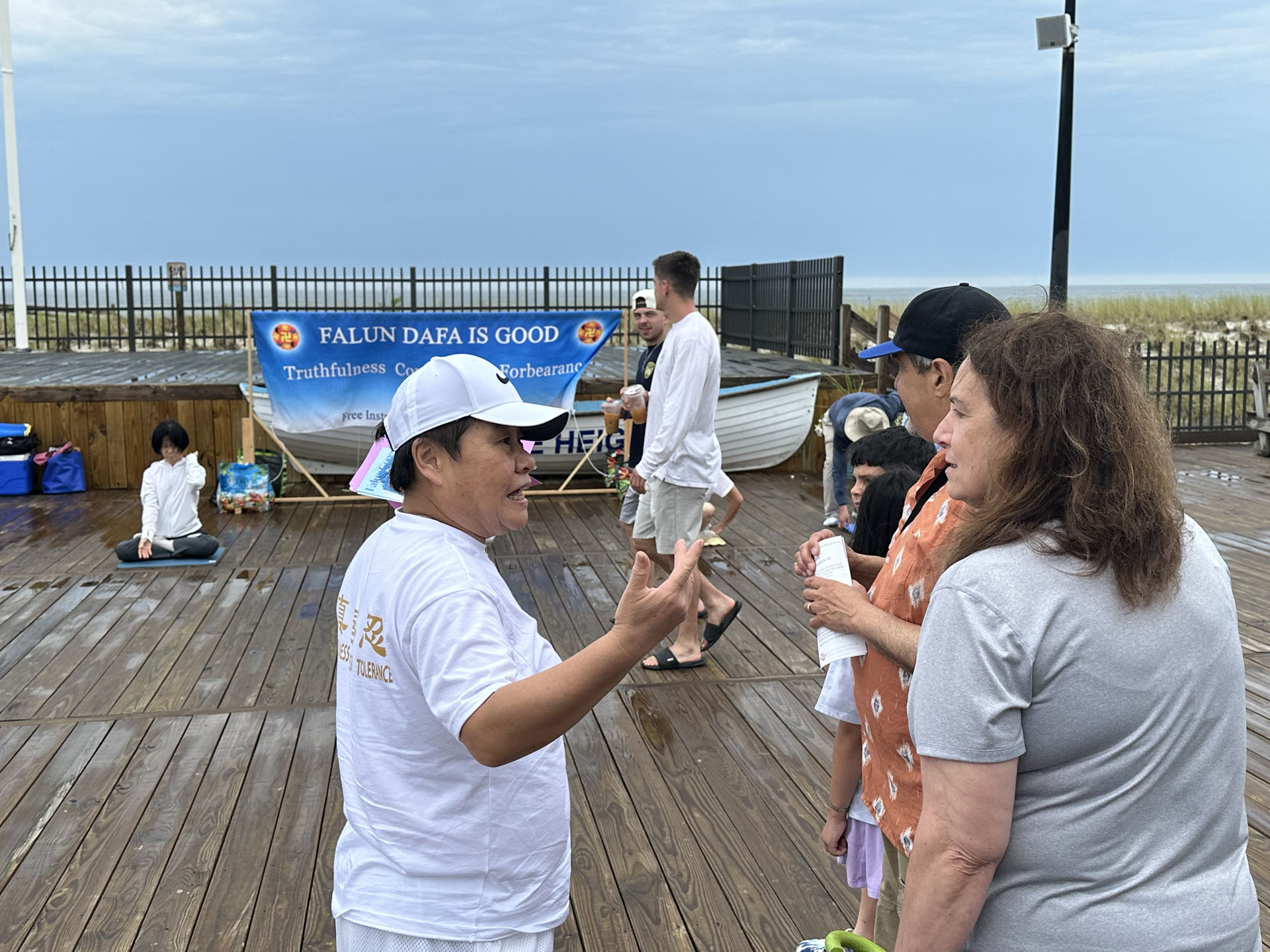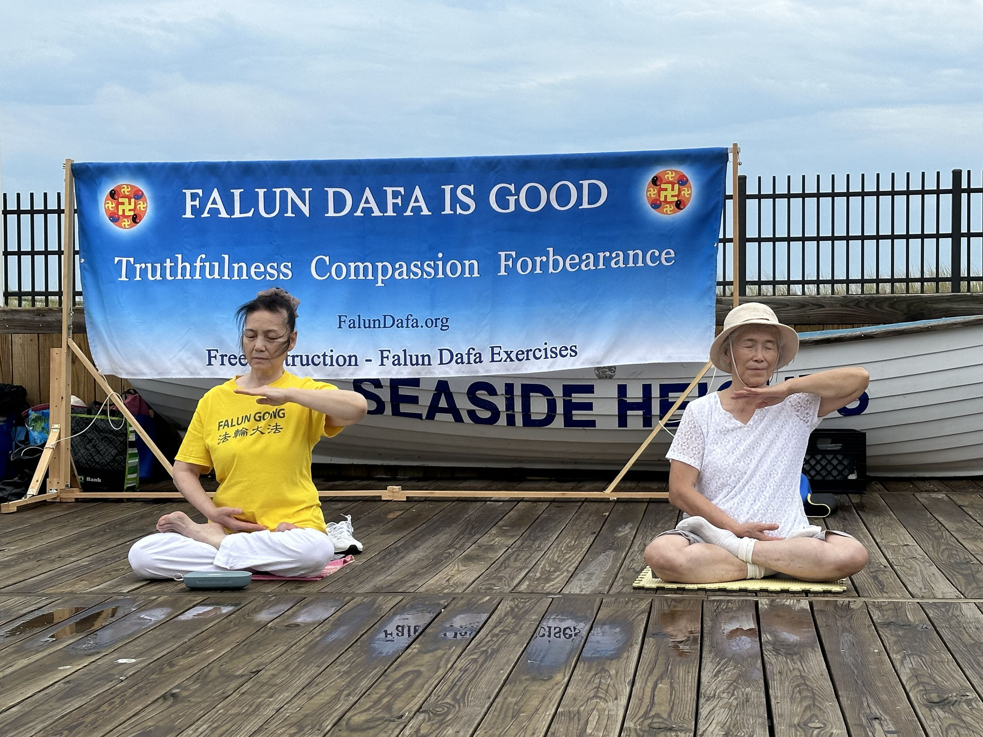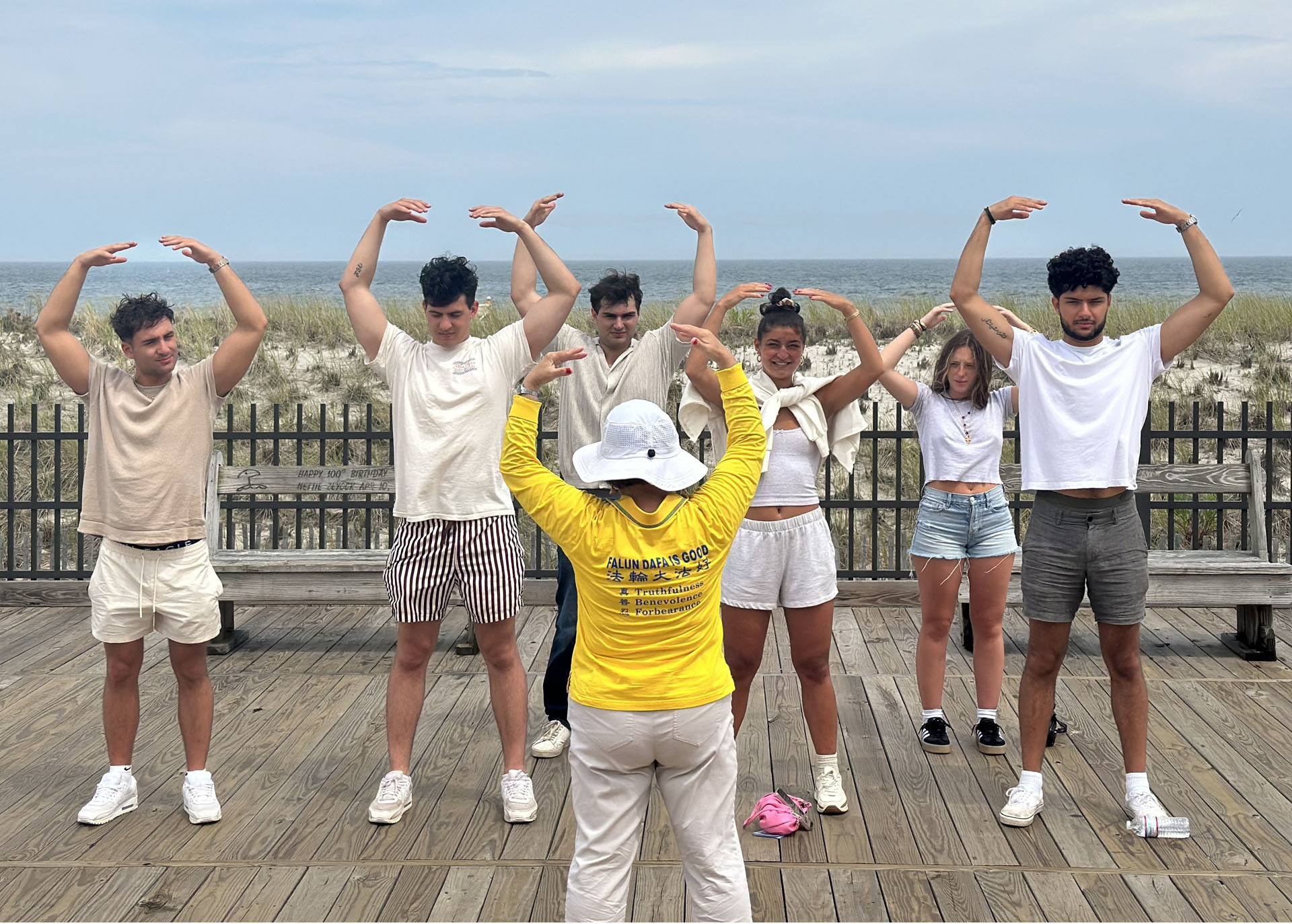![]() 图1:法轮功学员在海滨高地镇木板路上展示功法,吸引游客们主动要求学功。图为罗格斯大学的年轻学生们在学习第二套功法。 |