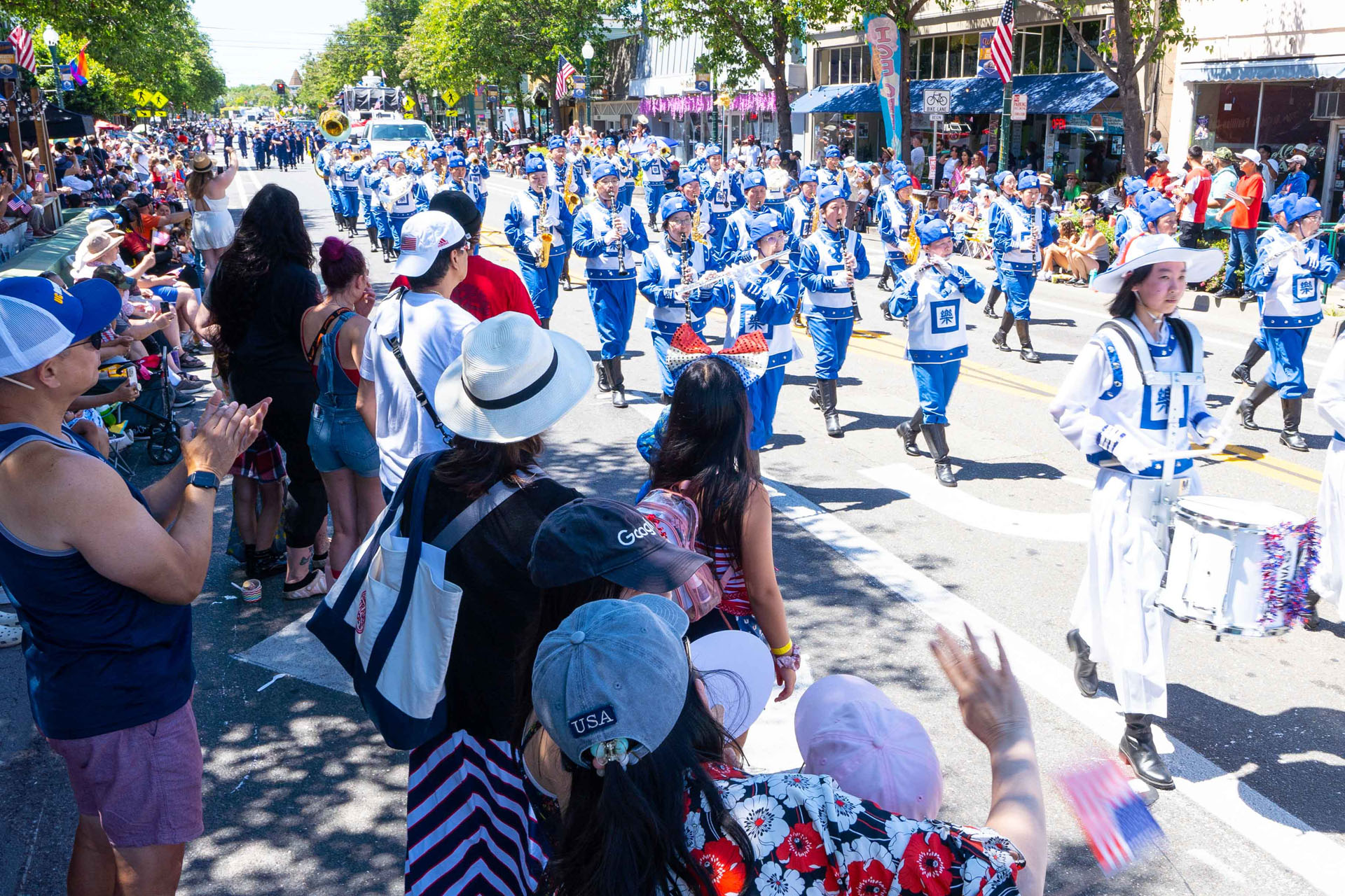 在近两小时的游行中,美西天国乐团演奏的乐曲赢来了观众的阵阵掌声。有的观众竖起大拇指,还有的观众给天国乐团成员送水。