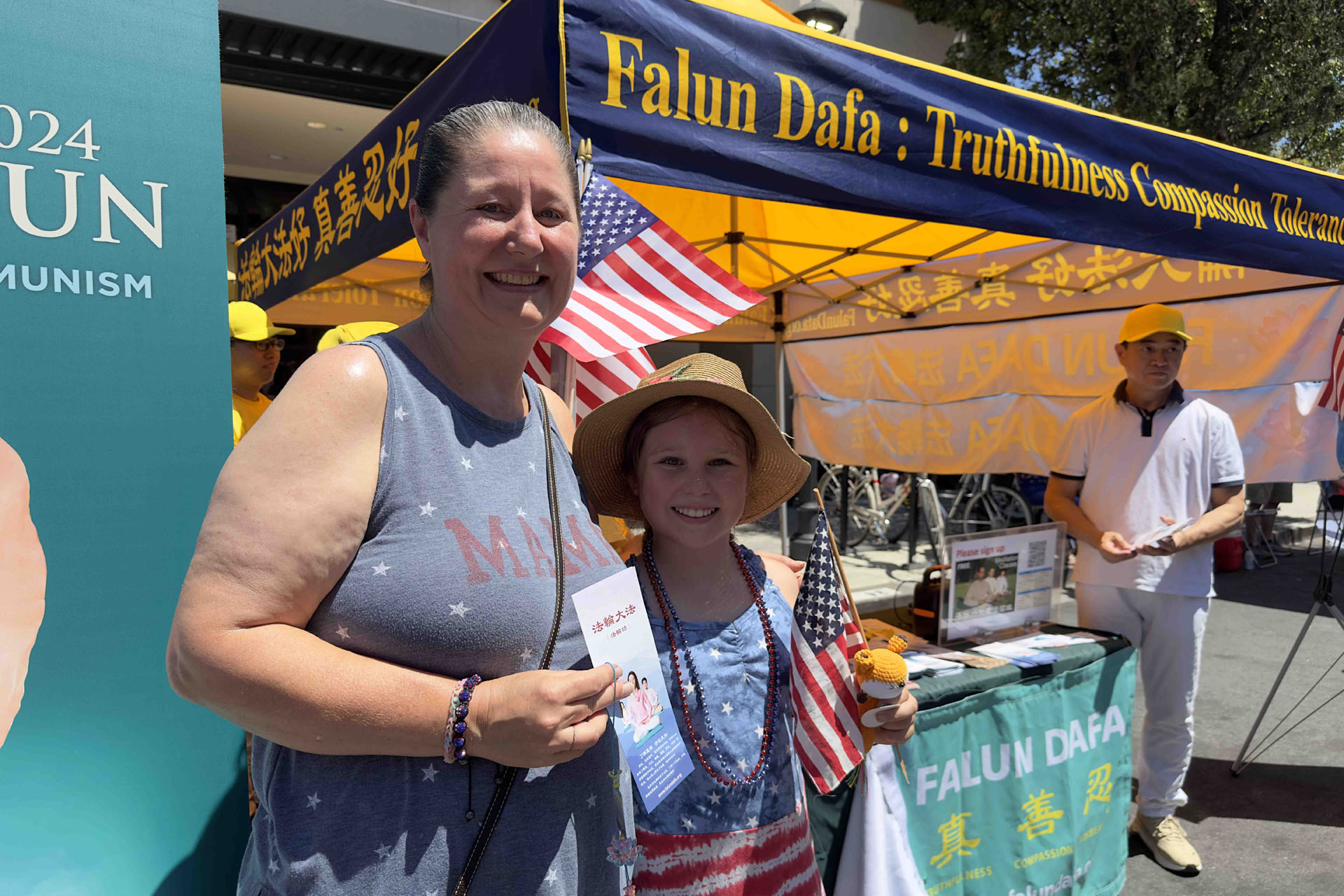 在退伍军人机构工作的詹妮弗(Jennifer)带着女儿前来观看游行,她说:“我们每年都来红木城观看这个游行,每次都能看到法轮功。他们是我们最喜爱的队伍。”
