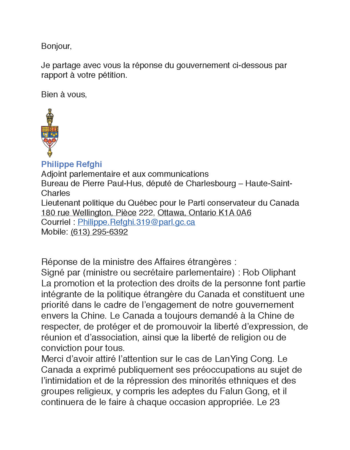 外交部长的信函说:“感谢关注丛兰英案件。加拿大已公开表达对少数民族和宗教团体受到恐吓及镇压的担忧,其中包括法轮功修炼者。加拿大将在一切适当的时机继续这样做。”
