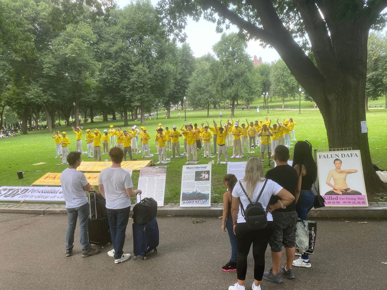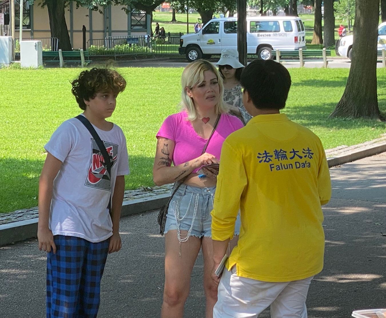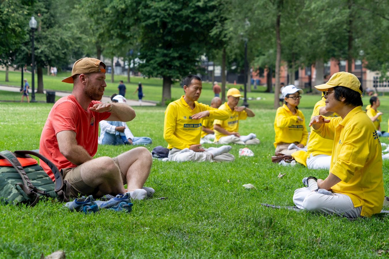 家住东波士顿的泰德(Teddy M.)得知中共对法轮功学员的迫害后,又询问活摘器官的证据,领取了真相资料离去。不一会转回来想学法轮功,他说,“法轮功法很棒!我感到能量在体内流动,太奇妙了!”他表示将到附近的炼功点继续学习。