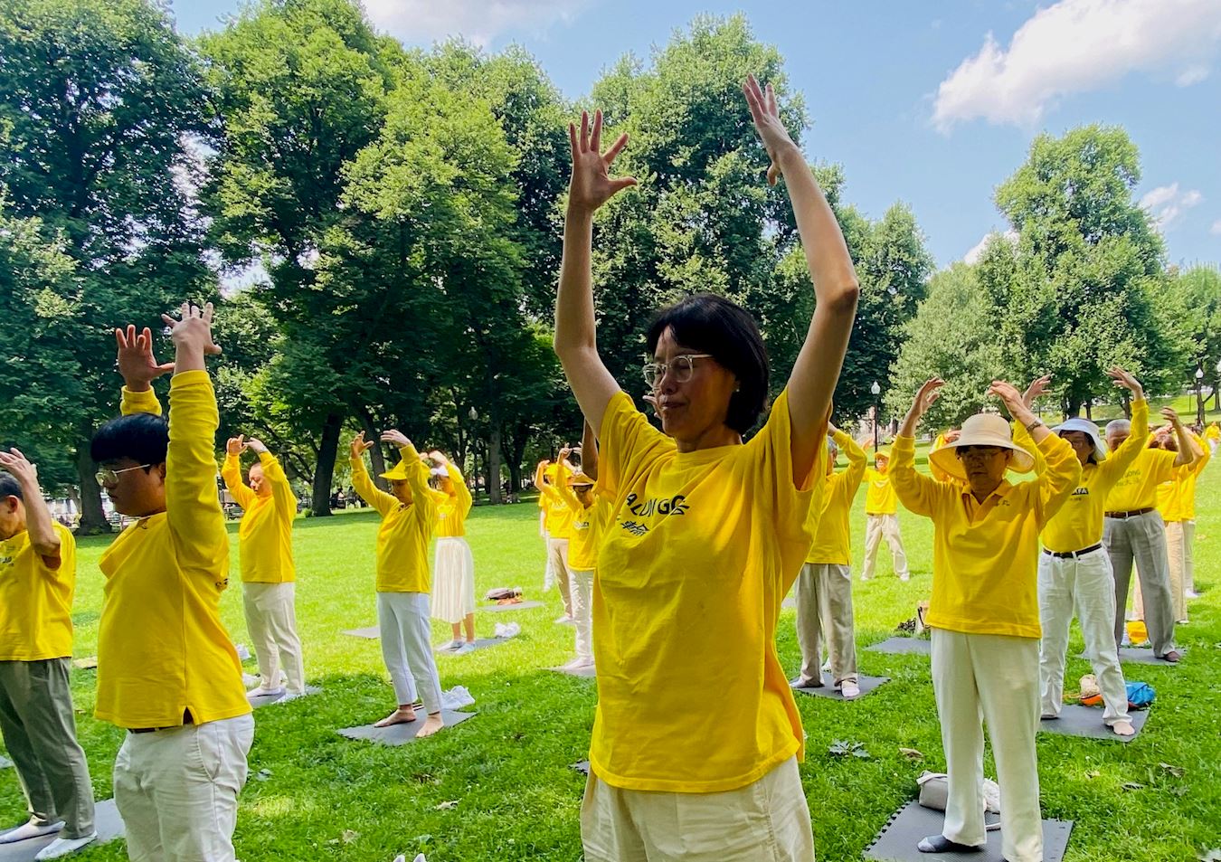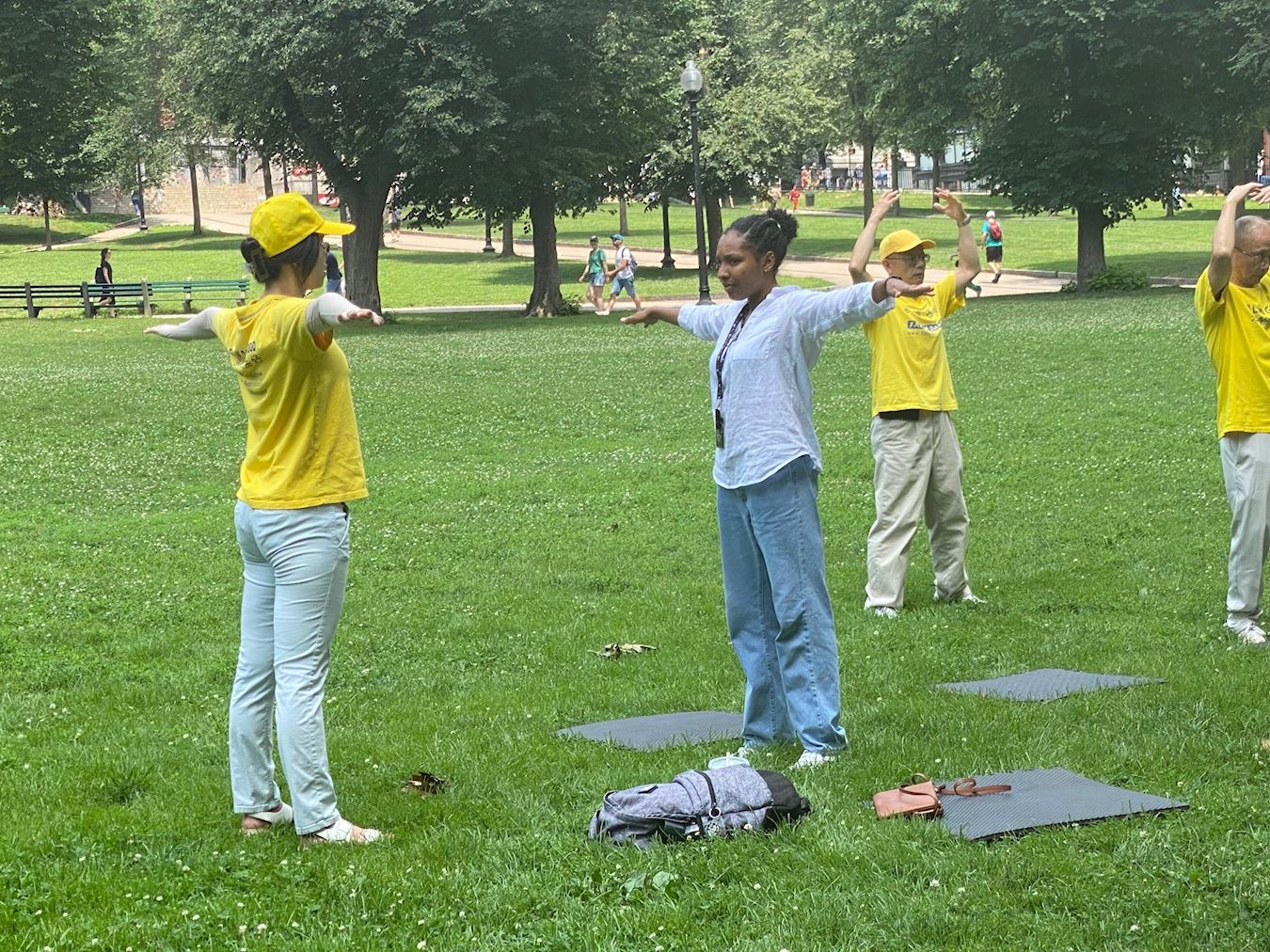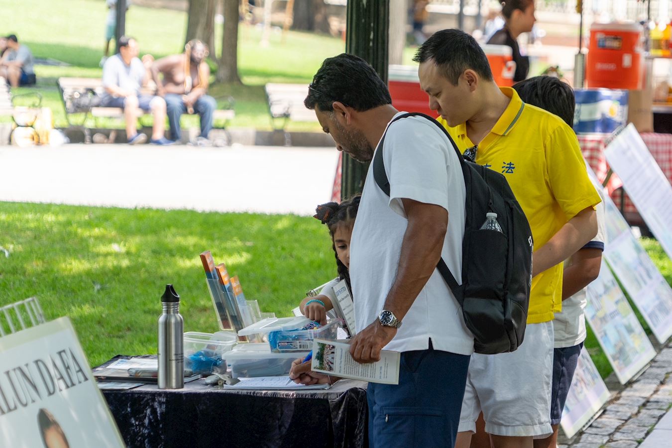 家住东波士顿的泰德(Teddy M.)得知中共对法轮功学员的迫害后,又询问活摘器官的证据,领取了真相资料离去。不一会转回来想学法轮功,他说,“法轮功法很棒!我感到能量在体内流动,太奇妙了!”他表示将到附近的炼功点继续学习。