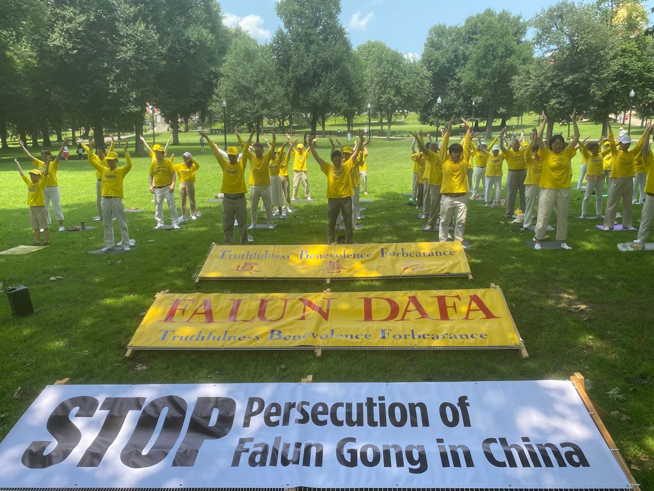 波士顿法轮功学员代表曾麦克说:“法轮功在全世界弘传,带给人身心的健康、心灵的宁静及生命的希望。但是中共持续的严酷的镇压二十五年,成千上万法轮功学员遭到拘留。” 他呼吁人们支持反中共迫害。