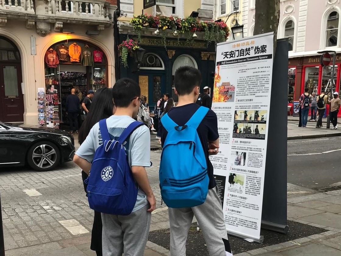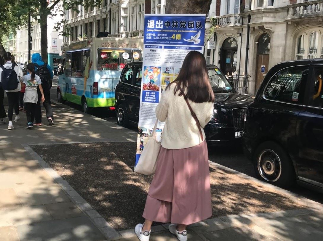 六月的一天,在大英博物馆门前的法轮功真相展位前,法轮功学员向一位中国女孩递上真相资料,女孩却吓得连连摆手。