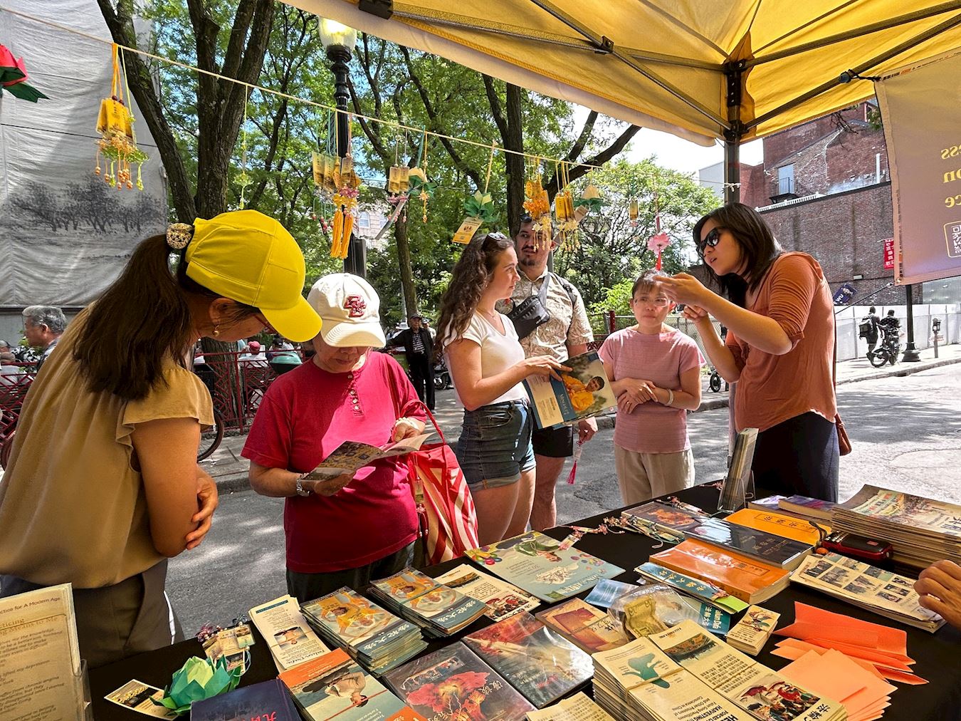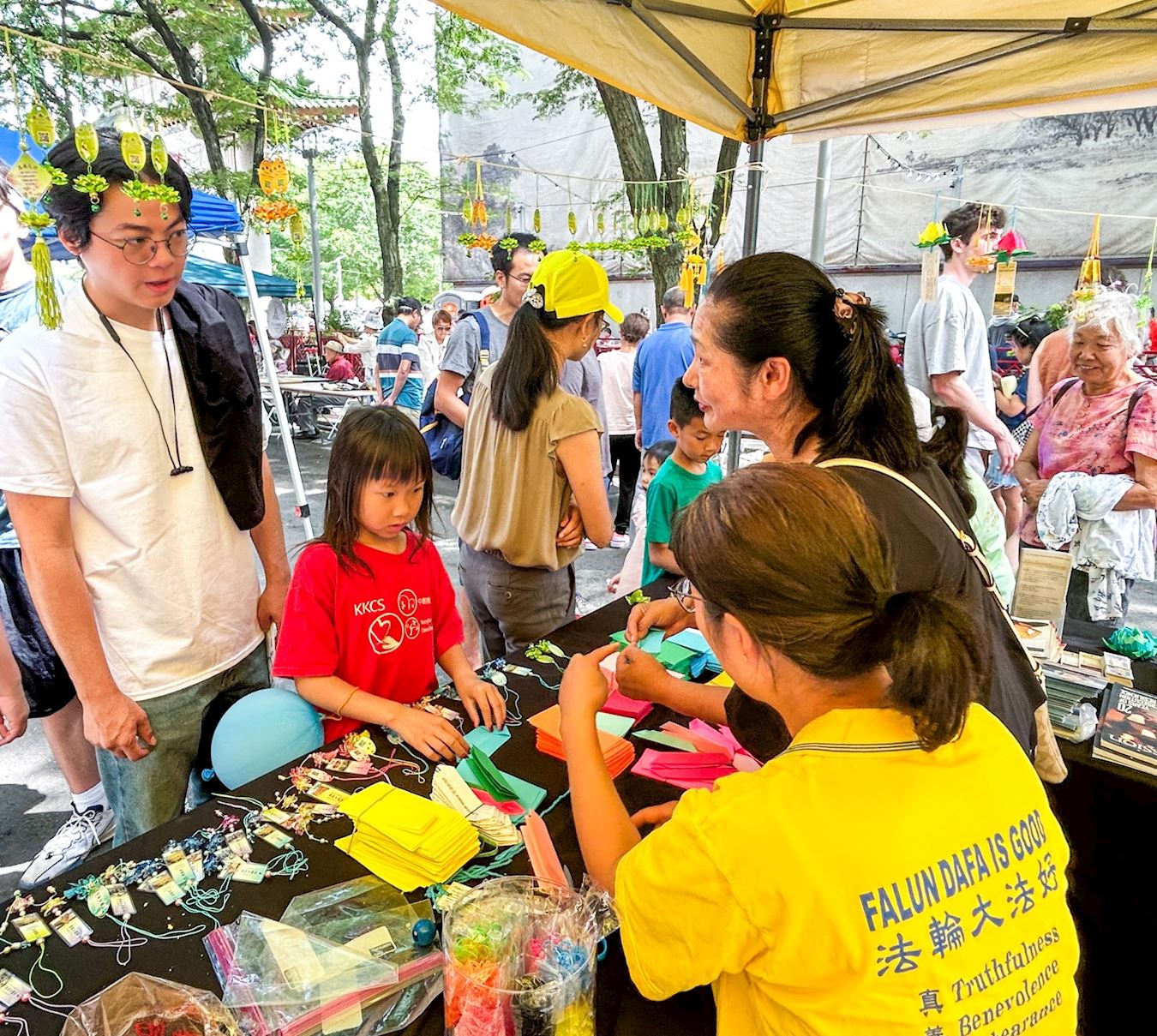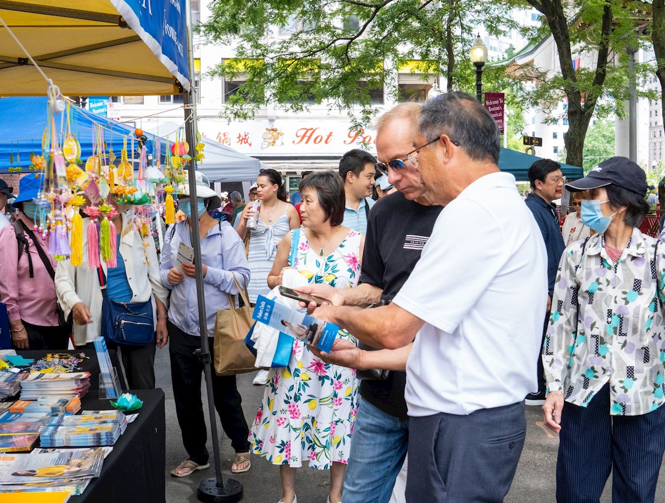 一位在美国出生的华裔女士来到法轮功学员的展位,她要了一些大法资料。她说以前在MIT工作的时候,曾看到有人在校园里炼功,现在退休了,想要有一个健康的身体,希望自己能长寿,相信修炼法轮功可以让她达到这个人生目标。