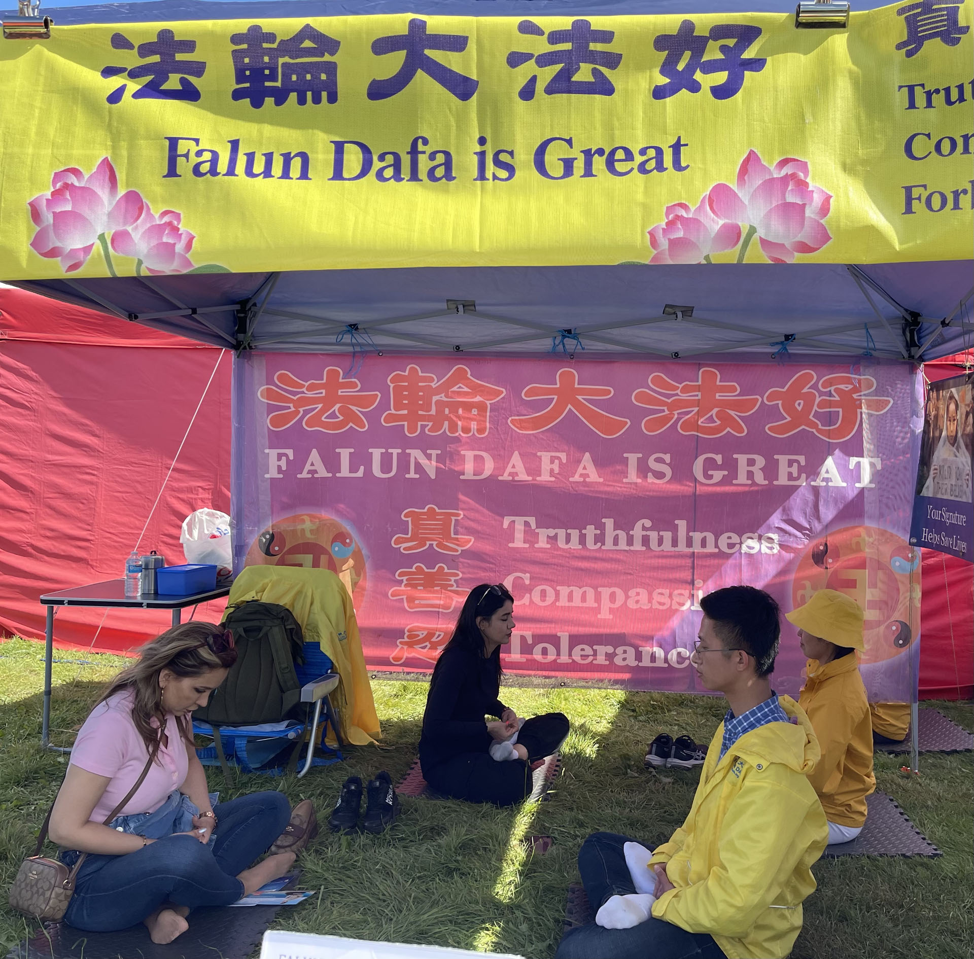 很多游人对展位上的大法书感兴趣,他们同情学员的遭遇。其中有一大群人过来看横幅,马上排队签字,学员赠送精美的小莲花,他们非常开心拿起来,看着上面的真、善、忍三个字。