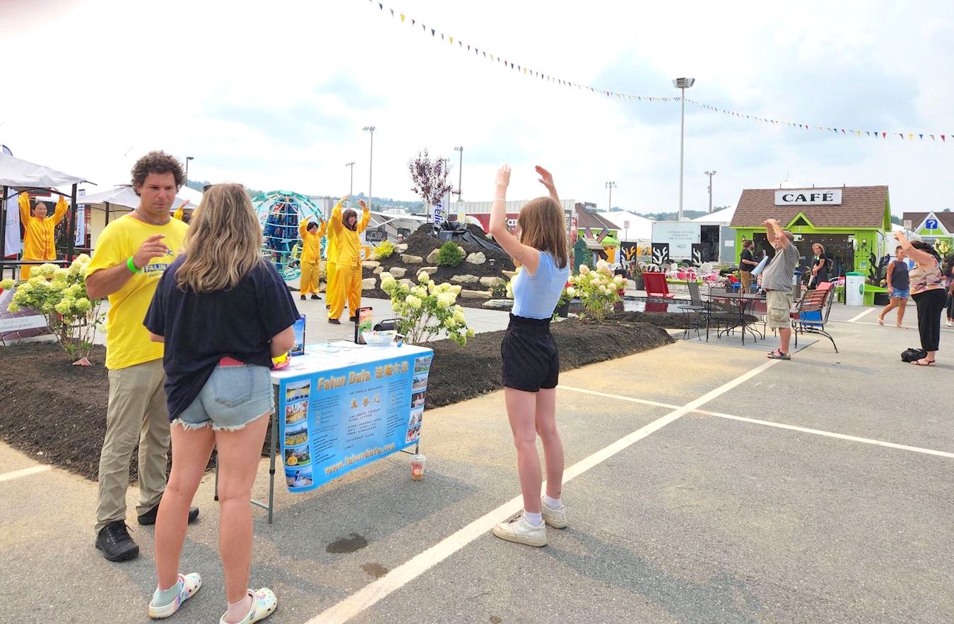 随后,杰西卡向在一旁为她展示动作的法轮功学员林女士表示感谢,尽管两人语言不通,通过翻译,杰西卡问:“您住在本地吗?我好希望能和您一起炼功。”林女士告诉她,自己住在蒙特利尔,在中国因为炼法轮功被关进监狱,遭受迫害,最终获得加拿大难民保护来到这里。杰西卡说:“我知道法轮功的遭遇,您在这里一切都好吧?我会学法轮功的,希望将来和您一起炼功。”