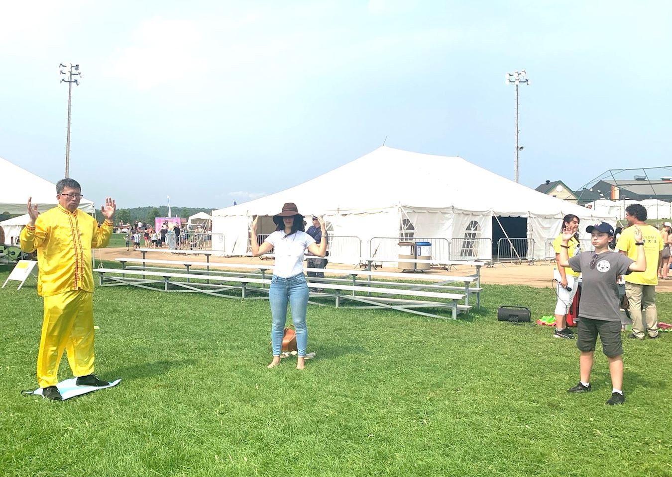 ![]() 图6:法轮功学员展示功法时,吸引了民众的加入。包括十四岁的安东尼(Anthony,右一)。中间戴帽子女士炼功后表示:度过了美好的时刻。 |