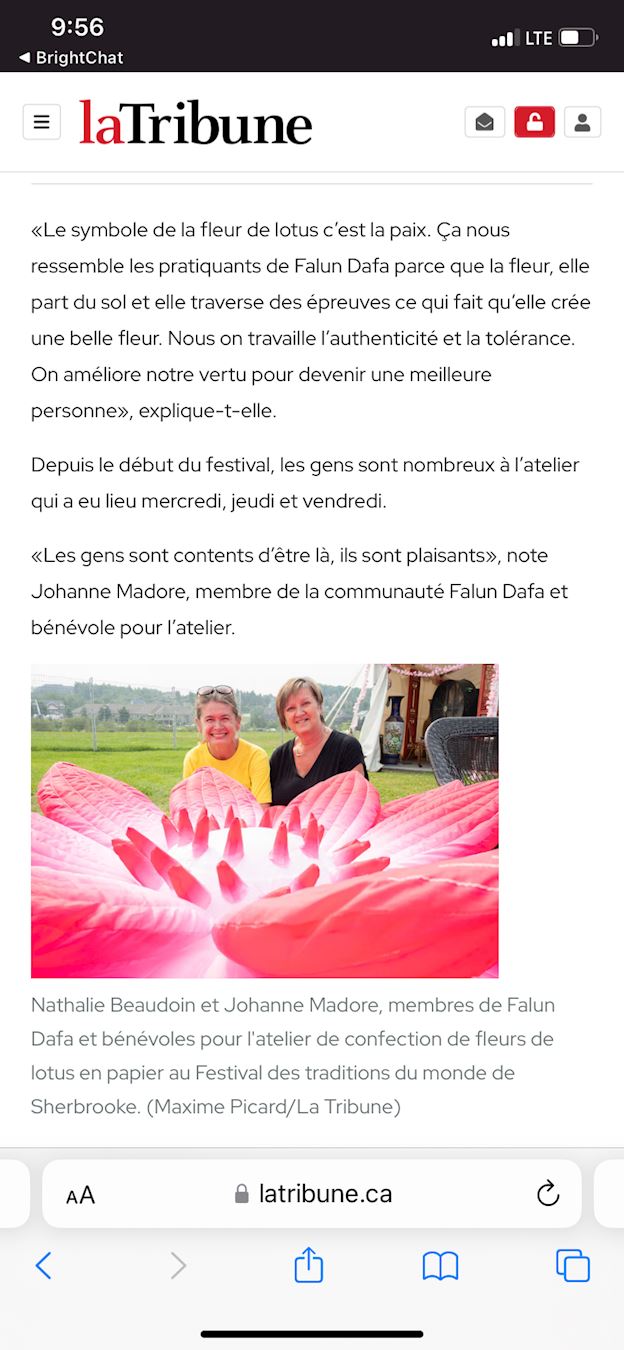 当地主流媒体《论坛报》(La Tribune)在一篇报道中说:法轮大法团体举办了纸莲花工作坊。报道中还引用了法轮功学员的采访,莲花象征着法轮大法修炼者的精神,“出淤泥而不染,历经考验才开出美丽的花,我们致力于修真、善、忍,我们提升我们的道德,成为一个更好的人。”