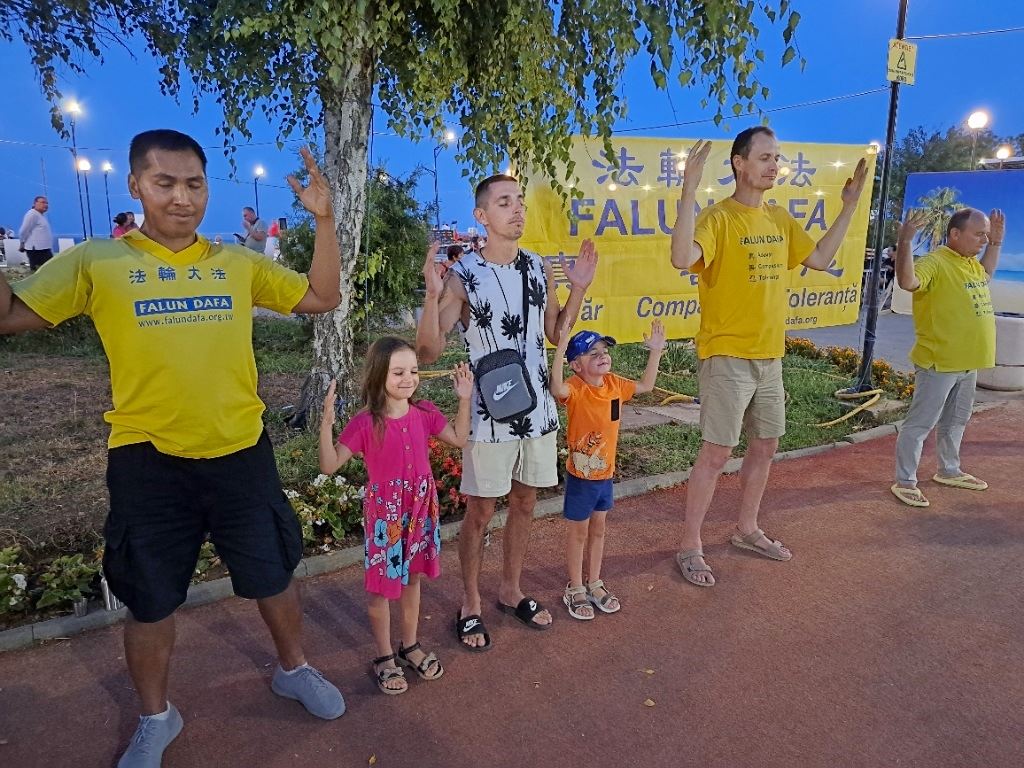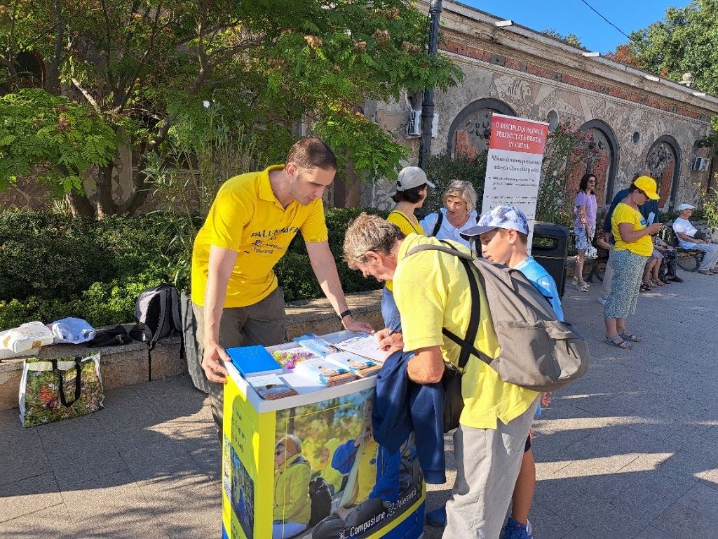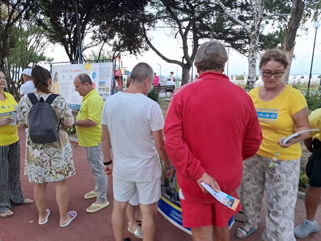 八月十一日康斯坦察,学员将传单递给另一位先生,他说:“这是一个神圣的信息:真、善、忍。如果你不珍惜面前的人,神如何珍惜你!祝你有一个幸福而光明的一天!”