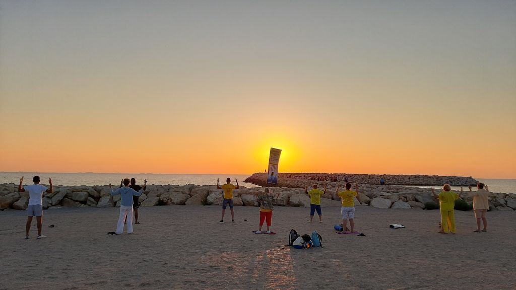 ![]() 图9:八月十一日南埃福列,法轮功学员在海边集体炼功。 |